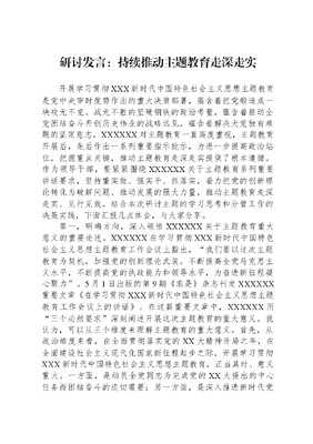 研讨发言:持续推动主题教育走深走实开展学习贯彻XXX新时代中国特色社会主义思想主题教育是党中央审时度势作出的重大决策部署,蕴含着把党锻造成一块攻无不克、战无不胜的坚硬钢铁的政治考量,蕴含着推动全党团结奋斗开创历史伟业的战略远见,蕴含着解决大党独有难题的坚定意志。XXXXXX对主题教育一直高度重视,主题教育开展后,先后作出一系列重要指示批示,为进一步提高政治站位,把握重点关键,推动主题教育走深走实提供了根本遵循。作为领导干部,要紧紧围绕XXXXXX关于主题教育系列重要讲话要求,坚持重实效、强实干、抓落实,着力把党的创新理论转化为破解问题、推动发展的强大力量,推动主题教育走深走实、见行见效。结合本次研讨主题的学习思考和分管工作的决策实践,下面汇报几点体会,与大家分享。第一,明确方向,深入领悟XXXXXX关于主题教育重大意义的重要论述。XXXXXX在学习贯彻XXX新时代中国特色社会主义思想主题教育工作会议上指出,我们要以这次主题教育为契机,加强党的创新理论武装,不断提高全党马克思主义水平,不断提高党的执政能力和领导水平,为奋进新征程凝心聚力。5月1日出版的第9期《求是》杂志刊发XXXXXX重要文章《在学习贯彻XXX新时代中国特色社会主义思想主题教育工作会议上的讲话》。在这篇重要文章中,XXXXXX用三个必然要求深刻阐述开展这次主题教育的重大意义。我认为,可以从三个维度来理解主题教育的重大意义。首先,从政治维度来看,在全面贯彻落实党的XX大精神开局之年,在全面建设社会主义现代化国家新征程起步之际,开展学习贯彻XXX新时代中国特色社会主义思想主题教育,正当其时、意义重大。一方面,是动员全党同志为完成党的XX大提出的中心任务而团结奋斗的迫切需要;另一方面,是深入推进新时代党的建设新的伟大工程的迫切需要。其次,从从理论维度来看,通过开展主题教育这一行之有效的方式,教育引导党员干部读原著、悟原理、全面学习领会XXX新时代中国特色社会主义思想,真正把马克思主义看家本领学到手,同时,看齐意识、党性觉悟、道德境界将会有一个大的提高,党员干部队伍的面貌会有一个大的改观。从思想上正本清源、固本培元,保持党的先进性和纯洁性。从实践维度来看,学习贵在思考,深入思考的目的在于应用,在于敢于直面问题、更快更好地解决问题。通过主题教育,从XXX新时代中国特色社会主义思想中汲取奋发进取的智慧和力量,熟练掌握其中蕴涵的领导方法、思想方法、工作方法,提出真正解决问题的新理念新思路新办法、拿出真正解决问题的实招狠招硬招,把XXX新时代中国特色社会主义思想转化为指导实践、推动工作的实际行动。第二,把握重点,深入领悟XXXXXX关于主题教育总体要求的重要论述。在学习贯彻XXX新时代中国特色社会主义思想主题教育工作会议上,XXXXXX强调,这次主题教育要牢牢把握学思想、强党性、重实践、建新功的总要求。我认为,可以从四个维度来理解主题教育的总体要求。首先,从理论维度来说,XXX新时代中国特色社会主义思想是一个科学全面、逻辑清晰、内涵丰富、辩证统一的科学理论体系,从党的十九届六中全会提出的十个明确、十四个坚持、十三个方面成就,到党的XX大提出的六个必须坚持,只有一以贯之学思想,才能更好领悟这一思想的精髓要义,做到灵活运用,融会贯通。其次,从精神维度来说,共产党员只有不断锤炼党性,方能永葆初心使命,才能持续注入助力实现中华民族伟大复兴的强大力量。修身律己强党性,就是要通过理论学习、实践锻炼,不断砥砺对党忠诚、对民忠心的党性修养,不断强化坚持人民至上的宗旨意识,始终同广大人民群众想在一起、干在一起,扎稳为国为民之根。从实践维度来说,实践开展落实好本次主题教育的关键环节,无论是总要求、根本任务,还是政策举措,最终都是为解决事关党和国家发展全局的实践难题。奋发有为重实践,就是要用好调查研究这一传家宝,扑下身子、沉到一线,应用党的创新理论解决调查研究出现的新情况、遇到的新麻烦,做到真研究问题、研究真问题,就是要在知行合一中主动奋发进取,立足本职工作,坚持做到只要是有利于人民百姓的事就认真地干、仔细地干、坚决地干。聚焦价值维度,新征程赋予新使命,新使命呼唤新作为,新作为励志建新功。一马当先建新功,就是要从XXX新时代中国特色社会主义思想中汲取奋发进取、建功立业的智慧和力量,树立敢担当的意识、激发愿担当的动力、增强能担当的本领,不断在党和人民最需要的地方建新功、立新业。第三,注重实践,深入领悟XXXXXX关于主题教育根本任务的重要论述。XXXXXX在学习贯彻XXX新时代中国特色社会主义思想主题教育工作会议上指出,开展这次主题教育,根本任务是坚持学思用贯通、知信行统一,把新时代中国特色社会主义思想转化为坚定理想、锤炼党性和指导实践、