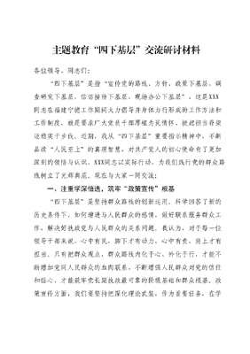 主题教育四下基层交流研讨材料各位领导、同志们:四下基层是指宣传党的路线、方针、政策下基层,调查研究下基层,信访接待下基层,现场办公下基层,这是XXX同志在福建宁德工作期间大力倡导并身体力行形成的工作方法和工作制度,就是要求广大党员干部厚植为民情怀、挺起担当脊梁迈稳实干步伐。近期,我从四下基层重要指示精神中,不断品读人民至上的真理智慧,对共产党人的初心使命有了更加深刻的领悟与认识,XXX同志以实际行动,为我们践行党的群众路线树立了光辉典范。现在与大家一同交流:一、注重学深悟透,筑牢政策宣传根基四下基层是坚持群众路线的创新运用。科学回答了新的历史条件下,如何增进与人民群众的感情,做好联系服务群众工作,解决好执政党与人民群众的关系问题。我认为,对于每一位领导干部来说,心中有民,脚下才有动力,心中有责,肩上才有担当。只有把群众观点、群众路线内化于心、外化于行,才能不断增加党同人民群众的血肉联系,不断增强人民群众对党的信任和信心,才能筑牢党长期执政最可靠的阶级基础和群众根基。政策宣传方面,我们要坚持把深化理论武装,作为首要任务,在学深悟透、务实戒虚上不放松,做到精通本职、掌握相关、了解全面,培养全局眼光,增强战略思维能力。同时,要把宣传党的方针政策下基层摆在突出位置,既要面上推动,广泛持续,更要具体问题具体分析,了解把握基层群众的政策需求和接受特点,到什么山头唱什么歌,大力开展丰富多彩、生动活泼的宣传教育,有效解开群众思想上的扣子,推动党的方针政策落地生根,把党的路线、方针、政策转化为包联乡镇、分管部门抓工作、提服务的真招实招。二、坚持问题导向,抓好信访接待重点信访工作是党和政府联系群众的桥梁,是直接沟通民情、体察民意、化解矛盾的前沿窗口。XXX同志到宁德工作后,首先从信访工作入手,强调信访工作的首义,在于时刻把自己看成人民中的一员,把心贴近人民。我认为,在新形势下,不能满足于被动式的信访,应该把信访工作做到基层,第一时间解决问题,主动把矛盾问题化解在萌芽状态。信访接待方面,今年,我多次前往××乡,就××、××等进京上访事宜开展入户走访,并召开座谈会现场研究解决举措,畅通了群众利益诉求渠道,化解了群众越级上访的激动情绪。今后,我要经常深入包联乡镇、分管领域,把信访维稳工作摆在重要日程,学会换位思考,从维护群众的利益出发,通过谈心聊天,在家长里短中找到群众关心的小问题,从而把握小问题、大民生的核心和重点,全力以赴督导乡镇、分管部门强化责任意识,确保各项稳控措施落实到位,努力把群众矛盾问题化解在初始,解决在基层。三、改进工作作风,深化调查研究方式基层是群众工作的主阵地。在福建工作期间,XXX同志既倡导现场办公下基层又力推马上就办,并首创机关效能建设,要求把工作着力点主动放置于基层一线,对于关系群众切身利益又久拖未决的问题现场集中会诊,特事特办,急事急办。他在当地委书记、市委书记期间,走遍了宁德和福州的乡镇。曾经披荆斩棘、跋山涉水两个多小时,深入山区寿宁县下党乡现场办公。我认为,这种接地气的工作作风,为福建党员干部树立了典范。现场办公下基层的意义,不仅在于解民忧、惠民生,更拉近了机关与基层领导与群众的距离,真正把为民宗旨转化为实际行动。调查研究方面,我包联的××乡有××个行政村,今后,我要更好坚持一线工作法,牢牢盯住居民群众关心的一些衣食住行、柴米油盐、急难愁盼等小事,一件件地做好、一件件地解决,多一点微不足道的雪中送炭,少一点装点门面的虚头巴脑,切实让调研过程充实起来,把调研成果转化成解决问题的巧招妙招实招硬招。四、重视成果转化,提升现场办公实效要始终坚持发展为了人民,把为群众办实事、解难题作为检验主题教育成效的重要标尺。通过深入基层调研、政策沟通、对口联系等方式,在研判形势、执行政策、推动发展等工作中,及时了解掌握群众需求、研究吸收群众意见、总结提炼群众经验、应用推广群众办法,充分调动群众干事创业、推动发展的主观能动性,在群众中汲取工作的智慧和力量,多为基层办实事办好事不断提高为民服务的能力。现场办公方面,尽管我县优化营商环境工作总体良好,但在工作机制、服务效能等方面,与群众期盼发展要求还存在一定差距。我多次前往审批大楼政务大厅实地调研,发现窗口人员素质参差不齐,特别是在具体业务方面,政策专业性强,部分人员把握不准,一定程度上影响了群众办事的体验感和满意度。今后,我要采取针对性措施切实解决实际问题,扎实开展审批规范年行动,发挥好政务大厅帮办代办作用,在依法依规依政策审批的基础上,督导审批局大力开展减事项减材料、减环节、减时限行动,动态修订审批事项清单一次性告知单办事指南,并在咨询导办台、一体查询机审批窗口公示,倒逼窗口人员进一步规范