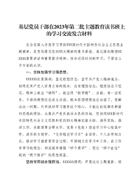 基层党员干部在2023年第二批主题教育读书班上的学习交流发言材料在全党深入开展学习贯彻XXX新时代中国特色社会主义思想主题教育,是贯彻落实党的XX大精神的重大举措。通过深刻领悟XXXXXX重要讲话和重要指示精神,结合近段时间的学习,下面谈三个方面的认识。一、坚持加强学习强思想。XXXXXX反复强调,坚定理想信念,坚守共产党人精神追求,始终是共产党人安身立命的根本;没有理想信念,理想信念不坚定,精神上就会缺钙,就会得软骨病。当前,有一些党员、干部的理想信念发生动摇,根本原因理想信念动摇了。要解决这一问题,只有抓好学习教育这个核心,才能达到抵御各种腐朽思想的侵蚀,永葆共产党员政治本色的目标。坚持用XXX新时代中国特色社会主义思想和党的XX大精神武装头脑、指导实践、推动工作,采取常委会带头学、党委(党组)理论学习中心组集中学、读书班专题学、支部理论学习日全面学、个人自学的方式,推动学习教育贯穿全过程,牢固树立在学习中工作、在工作中学习的理念,切实筑牢增强四个意识、坚定四个自信做到两个维护的思想根基。坚持学用结合强担当。XXXXXX强调:开展这次主题教育,根本任务是坚持学思用贯通、知信行统一,把新时代中国特色社会主义思想转化为坚定理想、锤炼党性和指导实践、推动工作的强大力量。学精悟透用好马克思主义看家本领,政治站位就会更高政治判断力、政治领悟力、政治执行力就会更强,观察时势、谋划发展、防范化解风险就会更主动。学习的目的全在于运用,树立正确的权力观、政绩观、事业观,增强责任感和使命感,不断提高推动高质量发展本领、服务群众本领、防范化解风险本领,加强斗争精神和斗争本领养成,提振锐意进取、担当有为的精气神。以学促干就是要立足岗位作贡献,干事创业、担当作为不是抽象的口号和表态,而是立足岗位、尽职尽责的实干苦干、善作善成,在干中学、学中干,在做好本职工作的过程中总结亮点经验、反思问题教训,真正做到走新路、有作为、创亮点、守底线。二、坚持严格标准强自律。XXXXXX指出:一个人能否廉洁自律,最大的诱惑是自己,最难战胜的敌人也是自己。一个人战胜不了自己,制度设计得再缜密,也会法令滋彰,盗贼多有。廉洁自律始终是我们党员干部为官做人之本,我们要坚持求真务实、履职尽责,对重点领域、重点环节加强监管,严守纪律规矩,做到不犯规,不越位不踩线,使党风廉政建设实际成果在全体党员干部职工身上具体体现。作为党员领导干部,要求别人做到的,自己首先做到,对待同志们指出的问题和意见,没有的要力戒,有的要力改,特别是做好与班子、与基层的深入沟通,把所有精力投入到工作实际中去,不断提高自身决策科学化、民主化水平。作为普通党员干部,只有做到严格遵守党的政治纪律和组织纪律,保持认认真真干事,干干净净做人的本色,才能在新形势下不被腐败思想所腐蚀,只有做到秉公用权,廉洁从政,才能永葆清正廉洁的政治本色。特别是要注意慎己所好,尤其对有损于自身形象,或影响秉公用权,或可能被人利用的爱好,一定要坚决戒除。