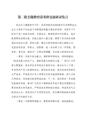 第二批主题教育读书班交流研讨发言在这次主题教育学习中,我深切感受到XXX新时代中国特色社会主义思想不仅包括了治国理政的重大理论和策略,还贯穿了中国共产党人的政治品格、价值追求、精神境界和作风要求,包含着深厚的真理力量、实践力量和人格力量,增强了我对党的创新理论在政治认同、思想认同、理论认同和情感认同方面的认识。我坚持读原著、学原文、悟原理,进一步加深了对学思想、强党性、重实践、建新功总要求的理解,受到很大感染和启发。一要进一步提升政治能力,旗帜鲜明讲政治。XXXXXX指出:政治是最大的生产力,旗帜是最大的团结力量。我们广泛开展主题教育,举办形式多样的宣传教育活动,推动全市上下进一步夯实共产党人的理想信念,取得良好成效。我们坚持党要管党从严治党,严格落实中央八项规定及其实施细则精神,持之以恒正风肃纪,党的建设取得明显成效。下一步,我们要进一步加强党性教育训练,推动广大党员干部特别是年轻干部坚定理想信念要持续深化作风建设,严明政治纪律和政治规矩,营造风清气正的政治生态;要坚持从严从实管党治党,把纪律和规矩挺在前面以优良作风取信于民。二要进一步增强思维能力,勤思善学增本领。XXXXXX指出:对马克思主义的学习不能停滞不前,必须与时俱进,不断推进。过去,我们高度重视理论创新,勤学善思,立足本地实际深化杭州经验研究,努力将马克思主义中国化的最新成果转化为工作实际。我们成立理论研究机构,整合高校及科研力量,加强决策咨询,为推动高质量发展提供智力支撑。我们广泛开展理论研讨交流活动,积极总结推广工作经验做法。下一步,我们要进一步提高运用马克思主义立场观点方法解决实际问题的能力要加强理论研究和交流,提高科学决策水平;要广泛听取各方面意见建议,不断丰富完善工作措施。三要进一步提高实践能力,勤勉担当干事业。XXXXXX指出:我们要敢于直面问题,敢于涉险过硬,以永不懈怠的精神状态和一往无前的奋斗姿态,坚定不移沿着中国特色社会主义道路前进。过去,我们坚持问题导向,勇于担当作为,推动各项事业取得新的进展。我们深入开展放管服改革,持续优化营商环境,市场活力和社会创造力明显增强。我们积极推进乡村振兴战略,加快农村人居环境整治,农业农村现代化不断推进。我们统筹经济社会发展,保持了经济稳定运行和民生改善。下一步,我们要进一步强化市场意识、创新意识、底线思维,把各项改革深化到底;要坚持系统观念和整体推进,使各项任务相互促进、相得益彰;要坚持问题导向,攻坚克难,在推动高质量发展中展现新作为。