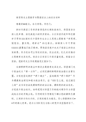 保密局在主题教育专题座谈会上的发言材料尊敬的**组长,各位领导,同志们:新时代保密工作承担着保党的长期执政地位、保国家安全保人民幸福、保民族复兴的职责使命。全区保密系统牢牢把握学习贯彻XXX新时代中国特色社会主义思想主题教育学思想、强党性、重实践、建新功的总要求,持续深入学习贯彻XXXXXX重要指示批示精神,贯彻落实党中央关于保密工作的决策部署,努力把各项工作抓实抓细、抓出成效,扎扎实实推动主题教育走深走实,推动全区保密工作高质量发展。根据会议安排,现将有关工作进展情况汇报如下:在旗帜鲜明讲政治中推动主题教育走深走实。保密部门处于政治机关第一方阵,必须把旗帜鲜明讲政治摆在首要位置,自觉把坚定拥护两个确立、坚决做到两个维护作为最高政治原则和根本政治责任,让XXX怎么说、我们就怎么做成为保密战线最鲜明的政治品格、最鲜亮的政治底色。自觉提升政治站位。始终把党对保密工作的绝对领导作为保密战线永恒的灵魂主线,任何时候任何情况下都以党的旗帜为旗帜、以党的方向为方向、以党的意志为意志。用心体悟新时代**年的伟大变革,是在以XXX同志为核心的党中央坚强领导下、在XXX新时代中国特色社会主义思想指引下,经过全党全国各族人民团结奋斗取得的,深刻认识两个确立是党应对一切不确定性的最大确定性、最大底气、最大保证,用实际行动忠诚核心、拥戴核心、维护核心、捍卫核心。自觉锤炼政治能力。加强政治历练,善于从政治上看待保密工作、分析解决保密问题,凡事都坚持政治标准、考虑政治因素、注重政治效果,不断提高政治判断力、政治领悟力、政治执行力。始终做党和国家的忠诚保密卫士,坚决防范打击一切危害国家安全、破坏民族团结、影响社会稳定的窃密泄密行为。自觉强化政治担当。始终胸怀国之大者、心系党之大计,把大局所需与保密所能结合起来,把准职责定位、积极主动入位,确保中心大局在哪里、保密工作就跟进到哪里,国家安全利益覆盖到哪里、保密工作就追随到哪里。健全完善党管保密的制度机制,加强各级保密委员会建设,切实把党对保密工作的领导体现在保密管理的全过程各方面。在凝心铸魂强信念中推动主题教育走深走实。XXX新时代中国特色社会主义思想是两个结合的光辉典范,是一部永远学不完、学不够的百科全书。要把学思想贯穿主题教育始终,深学细悟、真信真用,使XXX新时代中国特色社会主义思想成为全区保密系统政治上的主心骨、行动上的指南针,真正做到至信而深厚、融通而致用、执着而笃行。在学其典、知其义上下功夫。坚持读原著学原文悟原理,利用理论学习中心组、保密大讲堂、青年理论学习小组等载体,全面系统学、融会贯通学、结合实际学,准确把握新思想的丰富内涵、精神实质、核心要义和实践要求。结合保密工作实际,列出若干专题开展研讨、交流体会,做到知其然也知其所以然,为贯彻落实打好基础。在思其源、信其真上下功夫。将XXX新时代中国特色社会主义思想作为砥砺初心、坚定信仰的生动教材,深刻感悟XXXXXX对保密工作的重视关怀,使学思践悟的过程成为锤炼坚强党性、筑牢忠诚干净担当政治品格的过程。在湖南省长沙市举办保密干部专题培训班,传承红色基因、厚植爱党之心,借鉴先进经验、启发思想思维,推动党员干部理论素养与工作能力实现双提升。在用其法、行其道上下功夫。牢牢把握六个必须坚持,坚持底线思维,深入思考全方位推进保密工作高质量发展的根本性、长远性问题,不断提高应对重大挑战、抵御重大风险、解决重大问题的能力,切实把新时代党的创新理论转化为指导实践的强大力量、转化为推动工作的合格答卷。在服务大局勇担当中推动主题教育走深走实。重实践、建新功与实干担当促进发展具有一致性。全区保密系统要认真贯彻落实全国保密工作会议和区保密工作会议精神,坚持底线思维、极限思维,对复杂形势、风险隐患、工作短板做到心中有数、手中有招,不断提升保安全、促发展的能力和水平。筑牢思想防线。深入推进保密宣传教育月活动,用好人人话保密、保密高校行、保密专题课等载体,突出保密法规、形势政策、典型案例、防范技能等宣教内容,推动保密意识入脑入心。强化保密教育轮训,拓展保密教育进机关、进社区、进学校、进企业等活动,不断扩充容量、激活存量、提高质量,筑牢保密工作的人民防线。筑牢制度防线。以学习贯彻保密法及其实施条例为契机,从制度建设、依法行政、监督保障等方面入手,对现有法规制度进行全面梳理,加快补齐政务信息、科研项目、网络运维等新领域制度,切实从法规制度层面解决制约保密事业发展的深层次问题、瓶颈问题。健全完善信息公开保密审查机制,强化涉外项目合作、人才引进等方面保密管理,做好重点涉密人员出国前保密教育和提醒。筑牢技术防线。主动适应国家秘密形态数字化、传输网络化的趋势,以保障安全为底线、以实际需求为导向、以推广应用为目标,完善重大活