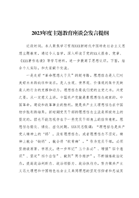 2023年度主题教育座谈会发言提纲近段时间,本人聚焦学习贯彻XXX新时代中国特色社会主义思想主题教育,通过个人自学,深入研读了党的XX大报告、党章、《XXX著作选读》等学习材料,进一步提高了思想认识。下面,结合个人实际,和大家做个交流。一是走好革命理想大于天的赶考路。理想信念是人们对美好未来的向往和追求,是人生观、世界观、价值观的集中反映是人的行为的支撑和动力。理想信念是我们党的立党之本,兴党之要。从一定意义上讲,中国共产党就是靠理想信念起家的,中国革命,建设和改革事业的胜利,就是共产主义理想信念在中国初步胜利的结果。新时期党员干部的理想信念主流是积极向上的坚定的,但也不能忽视存在于一些党员干部身上的信仰危机,理想信念弱化、矮化、虚化问题。XXX同志强调:理想信念是共产党人精神上的钙,没有理想信念,或者理想信念不坚定,精神上就会缺钙,就会得软骨病。作为党员干部,必须坚持读原著、学原文,进一步牢记三个务必、增强四个意识、坚定四个自信、做到两个维护,不断锤炼政治定力,提高政治判断力、政治领悟力、政治执行力,努力做共产主义远大理想和中国特色社会主义共同理想的坚定信仰者和忠诚实践者。二是走好敢教日月换新天的赶考路。XXXXXX指出:越是伟大的事业,越是充满挑战,越需要知重负重。全党同志都要保持越是艰险越向前的英雄气概,保持敢教日月换新天的昂扬斗志,埋头苦干、攻坚克难,努力创造无愧于党、无愧于人民、无愧于时代的业绩。一百年多来,中国共产党从一个50多人的小党成长为拥有9500多万名党员、领导着14亿多人口大国具有重大全球影响力的世界第一大执政党,团结带领中华民族迎来了从站起来、富起来到强起来的伟大飞跃,一个重要原因就是中国共产党始终秉持敢于斗争、敢于胜利的精神风骨,锻造了百折不挠的革命精神、坚贞不屈的坚强意志、敢于胜利的坚定信念形成了党的鲜明品格。作为党员干部,要始终保持共产党人敢于斗争、善于斗争的风骨和品质,坚定立场,敢于担当,做到面对大是大非敢于亮剑,面对矛盾困难迎难而上,面对危机挑战挺身而出,面对工作失误敢于担责,面对歪风邪气坚决斗争,沉着应对各种困难挑战,切实守住改革发展稳定的底线。三是走好俯首甘为孺子牛的赶考路。鲁迅先生曾在《自嘲》诗中写到横眉冷对千夫指,俯首甘为孺子牛。意思是指对待敌人要决不屈服,对待人民大众要甘愿服务。为人民服务就像一根红线贯穿在我们党这一百年的历史当中,激励着一代又一代的中国共产党人英勇奋斗。在战争年代,革命先辈们为了民族独立、人民幸福,置生死于度外,筑起了一座座时代丰碑在和平时期,党员干部们为了人民对美好生活的向往,攻坚克难战胜疫情,不负使命脱贫攻坚战取得全面胜利。只要我们党员干部心中装着人民,甘为人民群众的孺子牛,才能不忘初心,不负民心。要内正其身,外正其容。孔子说见贤思齐,曾子说吾日三省吾身,作为党员则必须做到修身养廉,才是人民公仆标准的形象,通过不断自我反省,以党的事业为重、以人民群众的利益为重,找到自己的不足之处、发现自己的问题所在,才能清醒记得自己的责任,才能为而不矜,作而不恃。要有脚上有泥土,心中有真情的情怀。读资料看数据只是纸上谈兵,要真正走到民间,走进百姓的心里。党的好干部焦裕禄同志在兰考一年多时间,靠一辆自行车和一双铁脚板,走遍了全县;小岗村沈浩,两任村官,六载离家,和农民面对面,肩并肩,走在村里道路工厂和农田。没有脚下的泥土,怎能体察百姓的疾苦;没有脚下的泥土,怎能收获百姓的信赖。我就讲这些,谢谢。