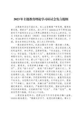 2023年主题教育理论学习研讨会发言提纲主题教育活动开展以来,本人全面遵循学思想、强党性重实践、建新功总要求,深入学习了XXXXXX在学习贯彻XXX新时代中国特色社会主义思想主题教育工作会议上的讲话,以及《党的XX大报告》《党章》《XXX著作选读》等重要学习资料,对XXX新时代中国特色社会主义思想有了更深的认识。下面,结合自身的工作实践,谈几点认识和体验:一要汲取信仰伟力,把政治属性作为第一属性植入灵魂。党的领导是党和国家的根本所在、命脉所在,是全国各族人民的利益所系、命运所系。王勃曾写道:老当益壮,宁移白首之心;穷且益坚,不坠青云之志。就是鼓励人们在任何时候都要有信仰,有信念,有志气、有骨气,并一以贯之,坚持到底。作为党员干部,要心怀国之大者,把理想信念作为照亮前进道路的灯塔,把对党的追随作为终身理想,坚定不移听党话、跟党走,为党的事业奉献一切,切实把增强四个意识、坚定四个自信、做到两个维护落到行动上,努力在乡村振兴主战场、项目建设第一线等实践中成就个人梦想、创造精彩人生。要以党章为指引,牢牢把稳航行之舵,让坚守初心成为一辈子的事,历经困难考验不改初心,直面风险挑战不失本色,自觉践行共产党人的价值观。在平时生活中,要恪守干净做人、踏实干事、清廉从政的原则不动摇,切实增强纪律意识、规矩意识,严格遵守党纪党规、国家法律法规和单位的规章制度,自觉做到不碰红线、不越底线,确保在思想不抛锚、在行动上不出轨。二要汲取奋进伟力,把担当实干作为价值追求融入血脉。XXXXXX教导我们,要做刻苦学习、锐意创新的模范,带头立足岗位、苦练本领、创先争优,努力成为行业骨干、青年先锋。只有具备卓越的能力和高超的技能,才能在新的赶考路上披荆斩棘、勇往直前。每个人的青春都只有一次,青年时代是积累知识、锤炼技能的黄金时期。每一位有为的青年都应该珍视这段时光,要有技能恐慌的紧迫感和求知若渴的危机感,自觉将学习作为履行职责的第一需要。我们要坚持不懈地研习党的创新理论,从中领悟战略、启迪思维、启迪智慧、磨炼品格。我们要系统地学、勤奋地学、跟进地学、反复地学、深入地学,不断更新知识、思考问题、领悟真谛。同时,我们要发扬安专迷和钉钉子精神,认真学习党纪国法、政策决策、讲话批示和制度文件,在复杂形势面前不迷茫、在问题矛盾面前不回避、在风险挑战面前不退缩,发扬三牛精神,一锤接着一锤敲,逐一攻克难题,不断增强谋划工作的智慧和推动工作的能力,以承担责任和实现目标的勇气和魄力,勇往直前,破浪前行。三要汲取清廉伟力,把遵规守矩作为行为准则嵌入骨髓。国家若无德则难以兴旺,个人若无德则无法立身。良好的品德修养是每个人最基本的素养。我们党选人用人的原则之一,就是德才兼备、以德为先,品德始终处于首要地位。XXXXXX寄语我们,要做崇德向善、严守纪律的模范,带头明大德、守公德、严私德,严格遵纪守法。青年干部若要在人生道路上走得更正、走得更远,就必须始终保持政治定力、严守纪律规矩、培养个人情操,自觉恪守正道、弘扬正气。应从做好每一件小事、管好每一个小节开始,牢记自律才能自由严管才是厚爱珍惜才会拥有,从善如流、有过则改,勇于革自己的命动自己的奶酪,切实做到慎独慎微、慎始慎终。面对各种诱惑和风险挑战,青年干部要懂得敬畏,敬畏权力、敬畏法纪、敬畏组织,坚决摒弃侥幸心理,拒绝随波逐流,远离自作聪明。面对新时代的光明前景,青年干部要懂得感恩,感恩组织的培养、感恩父母的辛劳、感恩社会的包容,脚踏实地、满怀豪情,认真走好干事创业的人生路,奋力跑好开拓进取的接力赛,始终以一往无前的姿态推动党和人民的事业不断前进。