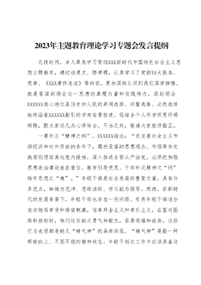 2023年主题教育理论学习专题会发言提纲近段时间,本人聚焦学习贯彻XXX新时代中国特色社会主义思想主题教育,通过读原文、悟原理,认真学习了党的XX大报告、党章、《XXX著作选读》等内容,更加深刻认识到我们深学细悟,就是要深刻领会这一思想的真理力量和实践伟力,深刻领会XXXXXX核心地位是历史和人民的共同选择、郑重选择、必然选择始终沿着XXXXXX指引的方向奋勇前进。现结合个人所学所思所感所悟,跟大家谈几点心得体会。不当之处,敬请大家批评指正。一要补足精神之钙。XXXXXX指出:在发展社会主义市场经济和对外开放的条件下,腐朽没落的思想观念、市场等价交换原则很容易向党内侵蚀。深入推进全面从严治党,必须把加强思想政治建设放在首位,教育引导党员、干部补足精神之钙铸牢思想之魂。年轻干部是社会发展的重要力量,具有许多优点,如精力充沛、思维活跃、学习能力强等。然而,在新时代的发展背景下,年轻干部也存在一些问题。有些年轻干部过分追求物质享受和感官刺激,信奉拜金主义和享乐主义。在面对困难和挫折时,他们往往缺乏勇气和毅力,容易退缩和放弃。这些行为表现都是缺乏精气神的具体体现。精气神是指一种积极向上、不屈不挠的精神状态。年轻干部在工作中应该具备这种精神,以应对各种困难和挑战。作为年轻党员干部,我们必须以坚定的理想信念为基础。缺乏精气神的根本原因在于理想信念的动摇和不坚定,这是党员干部思想和行动的源动力,是我们精神上的钙。没有理想信念,或理想信念不坚定,精神上就会缺钙,从而引发软骨病。我们是党和国家事业的生力军理想信念是我们第一位的要求,也是全体党员不可或缺的精神力量,只有坚定了理想信念,才能为党和人民事业注入源源不断的活力。因此,我们必须坚持不懈地抓好理论武装工作,深入学习马克思主义理论,用以武装头脑、指导实践、推动工作。二要践行群众路线。XXXXXX指出,群众路线是我们党的生命线和根本工作路线,是我们党永葆青春活力和战斗力的重要传家宝,不论过去、现在和将来,我们都要坚持一切为了群众一切依靠群众,从群众中来,到群众中去,把党的正确主张变为群众的自觉行动,把群众路线贯彻到治国理政全部活动之中。XXXXXX关于党的群众路线的重要论述从我们党的性质和根本宗旨出发,为新时代党员干部走好党的群众路线指明了方向,提供了根本遵循。作为党员干部,要秉持着立党为公、执政为民的信念积极地向前迈进。在服务群众的过程中,要不断地虚心向群众学习,深化了解人民的需求与期望。在施政过程中,应始终以人民为中心,将他们的福祉放在心头,真心实意为群众负责,热心尽力为群众服务。在思考问题和制定决策时,要时刻牢记人民至上的理念,关注人民的需要和诉求,致力于解决他们的难题,为他们提供更多的福利和保障,不断增强人民群众的获得感、幸福感和安全感。在实践过程中,要以人民为根基,将个人理想与追求融入国家富强、民族振兴、人民幸福的伟大事业中。三要坚持真抓实干。XXXXXX指出,武装头脑、指导实践、推动工作,落脚点在指导实践、推动工作;学懂弄通做实,落脚点在做实。要牢记空谈误国、实干兴邦的道理,坚持知行合一、真抓实干,做实干家。作为新时代的党员领导干部,我们应当始终维持对工作的热情和干事创业的拼搏精神,以人民利益为核心,尽心竭力地落实好各项任务。要避免好高骛远和纸上谈兵,要勇于拓展、敢于创新,具备坚韧不拔、迎难而上的品质,勇于承担责任,及时解决困难,推进中国特色社会主义事业稳步向前不辜负人民的信任与期望。我就讲这些,谢谢。