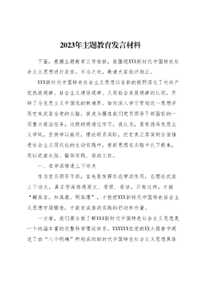 2023年主题教育发言材料下面,根据主题教育工作安排,我围绕XXX新时代中国特色社会主义思想进行发言。不当之处,敬请大家批评指正。XXX新时代中国特色社会主义思想以全新的视野深化了对共产党执政规律、社会主义建设规律、人类社会发展规律的认识,开辟了马克思主义中国化的新境界。如何深入学习贯彻这一思想并用它来武装全党的头脑,就成为摆在我们党员领导干部面前的一项重大政治任务。这段时间通过学习,我认为,要发扬马克思主义学风,坚持学以致用,理论联系实际,把它真正落实到全面推进社会主义现代化的生动实践中,使新思想在头脑中扎下根来,用以武装头脑、指导实践、推动工作。一、在学深悟透上下功夫作为党员领导干部,首先要发挥示范带动作用,在理论武装上下功夫,真正学深悟透原文、原理、原话。只有这样,才能解其言,知其意,明其理,才能把XXX新时代中国特色社会主义思想学深悟透,才能变成推动实践的行动和力量。一方面,我们要全面了解XXX新时代中国特色社会主义思想是一个内涵丰富的完整科学理论体系。XXXXXX在党的XX大报告中阐述了由八个明确所构成的新时代中国特色社会主义思想具体内容,提出了全面贯彻落实XXX新时代中国特色社会主义思想的十四条坚持基本方略,包括坚持党对一切工作的领导,坚持以人民为中心,坚持全面深化改革,坚持新发展理念,坚持全面依法治国,坚持全面从严治党,等等。这八个明确和十四条坚持,系统地回答了新时代坚持和发展什么样的中国特色社会主义、怎样坚持和发展中国特色社会主义这一重大时代课题,回答了新时代坚持和发展中国特色社会主义的总目标、总任务、总体布局、战略布局和发展方向、发展方式、发展动力、战略步骤、外部条件、政治保证等基本问题,并且根据新的实践对经济政治、文化、社会、生态文明、党的建设等各个方面,作出了理论分析和政策指导,必将有利于更好地坚持和发展中国特色社会主义。八个明确,主要是从理论层面来讲,它是XXX新时代中国特色社会主义思想的基本内涵、四梁八柱、核心要义。因为中国特色社会主义一直在发展过程当中,在不同的时代、不同的发展阶段、不同的历史方位有不同的内涵。十四个坚持,它主要是回答怎样坚持和发展中国特色社会主义,实际上就是坚持和发展中国特色社会主义的基本方略,它告诉我们坚持和发展中国特色社会主义的目标、路径、方略、步骤等等。八个明确和十四个坚持两者之间是相辅相成的关系,一个是理论上的回答,我们要坚持和发展的是什么样的社会主义,回答是什么的问题。十四个坚持是从实践层面明确的回答,主要回答怎么办的问题。我们在新的历史方位当中,怎样来坚持和发展中国特色社会主义,是讲方略、办法、路径的问题。其次,要深刻领会XXX新时代中国特色社会主义思想的理论重大意义。XXX新时代中国特色社会主义思想是党的十八大以来,以XXX同志为核心的党中央,根据国内外形势的变化和我国各项事业发展的新情况,以及我们面临的新任务和新挑战,坚持解放思想、与时俱进求真务实,紧密结合新的时代条件和实践要求,以全新的视野进行艰辛的理论探索而取得的重大理论创新成果。这个理论成果反映了党的十八大以来中国共产党人进行的理论创新,必将影响未来中国社会主义现代化的发展方向。因此,我们在实际工作中,要把握好它的重大意义。一是政治意义。就是XXX新时代中国特色社会主义思想对统一全党意志、坚定四个自信、树立四个意识、做到两个维护提供了强大的理论支撑和精神动力。二是理论意义。它既坚持了马克思主义基本原理,同时结合新时代的新特色,推进马克思主义中国化时代化,作出了重大贡献。它同时提出了一系列新思想、新观点、新论断、新方略,坚持和发展了中国特色社会主义理论体系。三是实践意义。主要是为我们全面建设社会主义现代化强国、实现中华民族伟大复兴提出了行动指南。四是世界历史意义。就象党的XX大报告中所讲的:中国特色社会主义道路、理论、制度、文化开辟了实现现代化的新途径,为那些既希望快速发展又希望保持自身独立性的发展中国家提供了全新选择,为解决人类问题贡献了中国智慧和中国方案二、在真抓实干上下功夫我们学习的目的是在于把所学的成果运用于实践。我们学习XXX新时代中国特色社会主义思想的目的也是这样,要把它实践化、具体化,真正将XXX新时代中国特色社会主义思想贯彻到乡村振兴发展的各项工作、各个环节,用理论去指导实践,解决实际问题,推动发展。(一)扑下身子真抓实干。XXXXXX非常重视理论联系实际问题,强调踏石留印,抓铁有痕的真抓实干作风。所以,学习贯彻XXX新时代中国特色社会主义思想的关键,就是要在真抓实干上狠下功夫,要在改革发展方面取得经得起实践检验的具体成就作为欠发达、欠开发的××来说,就是把XXX新时代中国特色社会主义思想的学习成果,善于运用到工作当中。我分管乡村振