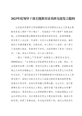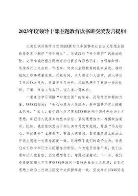 2023年度领导干部主题教育读书班交流发言提纲扎实组织开展学习贯彻XXX新时代中国特色社会主义思想主题教育是衷心拥护两个确立、忠诚践行两个维护的政治检验,必须准确把握主题教育的总要求和目标任务,在深学细悟、笃信笃行上走在前、作表率,切实以主题教育的扎实成效,推动组织工作高质量发展。近段时间,本人通过个人自学,深入学习了党的XX大报告、党章等学习材料,对新思想有了更进一步的认识。下面,结合工作实际,谈几点心得体会。一要通过学习领悟对党忠诚的使命,汲取信念如磐的力量。XXXXXX指出:全心全意为人民服务,是中国共产党人的根本宗旨。过去,我们深入学习贯彻XXX新时代中国特色社会主义思想,牢记为人民服务的根本宗旨,坚定理想信念,增强政治意识。比如,我们组织党员干部认真学习党章党规,开展不忘初心、牢记使命主题教育,重温入党誓词,自觉在思想上政治上行动上同党中央保持高度一致。这增强了我们的政治定力,使我们在工作中牢记为人民服务的宗旨。作为党员领导干部,我们必须牢记入党誓言,坚定理想信念,增强政治意识。下一步,我们还要继续深入学习贯彻XXX新时代中国特色社会主义思想,自觉在思想上政治上行动上同党中央保持高度一致,坚决维护以XXX同志为核心的党中央权威和集中统一领导。我们一定要坚持正确政治方向,增强四个意识,坚定四个自信,做到两个维护,以对党忠诚的信念如磐之力量推动各项工作。二要通过学习感悟增强本领的担当,汲取勤学苦练的力量。XXXXXX指出:一切工作都要从实际出发。过去,我们在制定工作计划时,都会组织力量深入基层调研,充分了解人民群众的意见和要求。比如,在拟定十四五规划时,我们多次开展调研,广泛征求群众对发展的意见,在此基础上制定出符合实际的规划。这增强了我们办事的本领和能力。作为党员领导干部我们必须坚持调查研究,深入实际,勤学苦练,提高工作本领。下一步,我们还要继续深入基层一线调研,广泛听取群众呼声,不断提高工作能力。我们一定要做到知行合一,以勤学苦练的精神增强工作本领和能力。三要通过学习省悟严守规矩的警戒,汲取不越底线的力量。XXXXXX指出:党员干部是党的干部,必须严守规矩。过去,我们严格要求党员干部遵守党纪国法,坚决反对特权思想和特权现象。比如,我们制定出台了廉洁自律各项规定,并组织党员干部签订承诺书,接受监督。这增强了我们党员干部的纪律性和规矩意识。作为党员领导干部,我们必须牢记入党誓词,严格遵守党纪国法,坚决反对特权思想。下一步,我们还要继续加强作风建设,严格落实中央八项规定精神,坚决防止特权思想蔓延我们一定要树牢守纪律底线的思想,以不越底线的力量推动全面从严治党向纵深发展。
