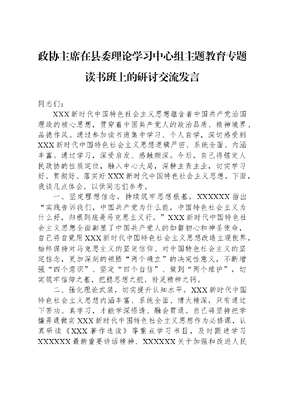 政协主席在县委理论学习中心组主题教育专题读书班上的研讨交流发言同志们:XXX新时代中国特色社会主义思想蕴含着中国共产党治国理政的核心思想,贯穿着中国共产党人的政治品质、精神境界、品德作风。通过参加读书班集中学习、个人自学,深切感受到XXX新时代中国特色社会主义思想逻辑严密、系统全面、内涵丰富。通过学习,深受启发、感触颇深。今后,自己将锚定人民政协的性质定位,融入中心大局,深耕主责主业,切实学习好、贯彻好、落实好XXX新时代中国特色社会主义思想。下面,我谈几点体会,以供同志们参考。一、坚定理想信念,持续筑牢思想根基。XXXXXX指出实践告诉我们,中国共产党为什么能,中国特色社会主义为什么好,归根到底是马克思主义行。XXX新时代中国特色社会主义思想全面彰显了中国共产党人的如磐初心和神圣使命,自己将自觉用XXX新时代中国特色社会主义思想改造主观世界,始终保持对马克思主义的坚定信仰、对中国特色社会主义的坚定信念,更加深刻的领悟两个确立的决定性意义,不断增强四个意识、坚定四个自信、做到两个维护,切实筑牢信仰之基,把稳思想之舵,补足精神之钙。二、强化理论武装,切实提升认知水平。XXX新时代中国特色社会主义思想内涵丰富、系统全面、博大精深,只有通过下苦功、真学习,才能学深悟透、融会贯通。自己将坚持把学懂弄通做实XXX新时代中国特色社会主义思想作为必修课,认真研读《XXX著作选读》等重点学习书目,及时跟进学习XXXXXX最新重要讲话精神、XXXXXX关于加强和改进人民政协工作的重要思想及《政协章程》等业务知识,一本一本读原著、一篇一篇学原文、逐段逐句悟原理,自觉从中明方向、找方法,真正做到学思用贯通,知信行统一,切实把学习成果转化为推动工作落实的强劲动力。三、立足职责定位,积极主动担当作为。当前,中国特色社会主义进入了新时代,人民政协事业发展面临着新形势新任务,必须深入贯彻落实XXXXXX关于加强和改进人民政协工作的重要思想,不断探索实现新方位、新使命的新举措,切实推动工作质量和履职水平全面提升。一是主动服务发展大局。坚持把服务发展作为履职尽责的主线,聚焦全县发展思路,紧扣发展之要,紧贴民生所需,紧盯治理之难,扎实履行分管工作职责,协调解决项目建设、产业发展、社会治理等方面的实际问题,围绕乡村旅游发展、公共文化服务体系建设等重点任务,扎实开展调查研究、协商议政,多渠道了解实际情况,全方位收集意见建议,真正为助推发展提出好思路、好意见,更好地服务中心大局。二是广泛凝聚思想共识。充分发挥政协组织独特优势,主动加强与党外人士、非公经济人士、新的社会阶层人士的联系沟通,广泛开展委员走访活动,积极宣传党的各项方针政策,及时收集反映社会各方面的呼声,多做一些理顺情绪、化解矛盾、增进团结的工作,为全县经济社会高质量发展凝聚思想共识,汇聚工作合力。三是深入推进基层协商。坚持协商于民、协商为民的理念,深入推进委员联系界别群众,组织引导委员深入田间地头、小巷庭院等察民生、听民意。指导乡村协商议事会创新协商方式,围绕群众呼声较高、社会影响较大的热点难点问题扎实开展协商活动,真正把协商触角延伸到基层群众最为关切的问题上,推动协商议事与基层治理深度融合,更好地解决基层群众的操心事烦心事揪心事,打通政协协商向基层延伸最后一公里,为全县经济社会发展贡献更多智慧力量。发言完毕,谢谢大家!