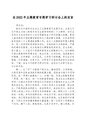 在2023年主题教育专题学习研讨会上的发言同志们:新时代中国特色社会主义主题教育已全面开启,这是以习近平同志为核心的党中央为全面贯彻党的二十大精神、动员全党同志为完成党的中心任务而团结奋斗所作的重大部署,是深入推进新时代党的建设新的伟大工程的重大部署。今年是贯彻落实党的二十大精神的首要之年,在这一关键时刻开展主题教育,是一次深刻的思想政治洗礼、系统的能力本领锤炼、严肃的纪律作风教育,在全党推动主题教育走深走实,正当其时、意义重大。广大党员干部要积极投身主题教育之中,切实增强开展主题教育的思想自觉、政治自觉、行动自觉,迅速掀起以学铸魂、以学增智、以学正风、以学促干的热潮,努力在以学铸魂、以学增智、以学正风、以学促干方面取得实实在在的成效。下面,结合今天的学习研讨内容,我也谈几点学习体会,与大家交流。第一,在学方面要下真功夫,精读深思、以学铸魂,从新思想中汲取奋进新征程的智慧力量。团结奋斗离不开思想引领,统一思想才能团结一心、步调一致,开展主题教育是统一思想、统一意志、统一行动的重要举措。通过这次主题教育,将进一步推动全党学习贯彻习近平新时代中国特色社会主义思想走深走实,教育引导党员、干部从思想上正本清源、固本培元,不断提高政治判断力、政治领悟力、政治执行力,始终在思想上政治上行动上同党中央保持高度一致,做到心往一处想、劲往一处使,共同把党锻造成一块攻无不克、战无不胜的坚硬钢铁。我们要坚持思想引领,通过真学真悟,自觉做到以学增智,不断从中汲取解难题的力量智慧。每一位党员干部都要沉下身来,静下心来,聚起劲来,在真才实学中,凝心铸魂,补足精神之钙。要全面学习领会科学体系、精髓要义、实践要求,准确把握这一思想的世界观、方法论,坚持好运用好贯穿其中的立场观点方法,真正把看家本领学到手。从深入学习贯彻习近平新时代中国特色社会主义思想中汲取奋发进取的智慧和力量,在学思践悟中汲取矢志不渝的理想信念、增强担当作为的使命责任、筑牢抵御侵蚀的堤坝防线,努力在以学铸魂、以学增智、以学正风、以学促干等方面取得实实在在的成效。要将学习内容与单位实际相结合,针对工作面临的难题、创新中面临的困境等,从党的最新理论中找思路、找方法。要加强理论武装,不断汲取党的创新理论蕴含的丰富智慧,提高认识问题的高度、分析问题的深度、把握问题的准度,努力增强破解改革发展难题的能力和本领。第二,在思方面要沉下心,联系实际、深化认识,从新思想中总结创新思路的方法措施。面对新时代新征程上错综复杂的国际国内形势、艰巨繁重的改革发展稳定任务、各种不确定难预料的风险挑战,要实现党的二十大确定的战略目标,迫切需要广大党员、干部特别是各级领导干部进一步深入学习贯彻习近平新时代中国特色社会主义思想。全面学习领会习近平新时代中国特色社会主义思想的科学体系、核心要义、实践要求,必须做到整体把握,融会贯通。学深悟透,联系实际是基础。联系实际学习贯彻习近平新时代中国特色社会主义思想,关键是要强化对实事求是这个最大的党性的认识,听真话、察实情,坚持真理、修正错误,有一是一、有二是二,既报喜又报忧,不唯书、不唯上、只唯实。学深悟透,掌握方法是要领,要不断从习近平新时代中国特色社会主义思想中汲取智慧和力量,准确把握蕴含其中的立场观点方法,这是确立科学的领导方法、思想方法、工作方法的不二法门,也是提高政治判断力、政治领悟力、政治执行力,贯彻落实党中央重大决策部署的不二法门。学深悟透,解决问题是关键,要把问题整改贯穿主题教育始终,增强问题意识、坚持问题导向,深刻认识新的时代条件下继续解决的矛盾和问题,梳理问题、排查难题,要深入践行习近平新时代中国特色社会主义思想,用以改造客观世界,推动事业发展。第三,在用方面要重实际,关注民生、破解难题,从新思想中感悟深厚为民情怀。学深悟透是为了弄懂做实,弄懂做实是为了更好地惠及人民,只有在主题教育中不断地查不足、找差距、明方向,才能做到学思用贯通、知信行统一,更好地使理论指导实践。在新征程上,要坚持问题导向,坚持人民至上,充分发扬党员先锋作用,坚持群众路线,从细处入手,向实处着力,凝心聚力,协同应对,同时做到信念不动摇、笃行实干不懈怠、瞄准问题不走偏、坚守底线不逾矩、提高本领不松劲,就一定能够解决好前进道路上的各种艰难险阻,就一定能够充分调动一切积极因素提升党的执政能力、治理水平和干部队伍素质,稳步推进党和国家各项事业,顺利完成全党全国人民的中心任务,凝聚起磅礴的奋进力量。要善于运用党的创新理论研究新情况、解决新问题,掌握科学思想方法、走好新时代党的群众路线,扑下身子、沉到一线,坚决摒弃作秀式调研盆景式调研蜻蜓点水式调研,认真把脉问诊、解剖麻雀,进行问题梳理、难题排查,真正把情况摸清、把问题找准、把对策提实。把学习和调研落实到完成党的二十大部署的各项