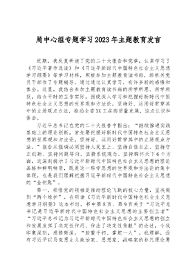 局中心组专题学习2023年主题教育发言近期,我反复研读了党的二十大报告和党章,认真学习了《习近平著作选读》和《习近平新时代中国特色社会主义思想学习纲要》等学习材料,积极参加主题教育读书班,给机关党员干部作了专题辅导。通过通过认真学习,有许多新的感悟和体会。这里,我结合参加主题教育读书班的所学所思、所学所获,结合平时的工作实际,围绕深入学习和把握好新时代中国特色社会主义思想的世界观和方法论,坚持好、运用好贯穿其中的立场观点方法,推动全省XX工在高质量发展,谈点认识和体会。习近平总书记在党的二十大报告中指出:继续推进实践基础上的理论创新,首先要把握好新时代中国特色社会主义思想的世界观和方法论,坚持好、运用好贯穿其中的立场观点方法。报告从强调必须坚持人民至上、坚持自信自立、坚持守正创新、坚持问题导向、坚持系统观念、坚持胸怀天下6个方面,这深刻揭示了习近平新时代中国特色社会主义思想的理论品格和鲜明特质,既是这一科学思想的世界观和方法论的集中体现,也是我们理解把握习近平新时代中国特色社会主义思想的金钥匙。第一、领悟党的领袖是推动理论飞跃的核心力量,坚决做到两个维护。在研读《习近平新时代中国特色社会主义思想学习纲要》这本书时,书中第8页、第9页关于习近平总书记是习近平新时代中国特色社会主义思想的主要创立者习近平总书记为习近平新时代中国特色社会主义思想的创立和发展发挥了决定性作用、作出了决定性贡献的论述,令我印象深刻,感悟颇深。船重千钧、掌舵一人。我理解,没有习近平以马克思主义政治家、思想家、战略家的非凡理论勇气、卓越政治智慧、强烈使命担当推动创立,就没有这次理论飞跃。学习贯彻习近平新时代中国特色社会主义思想,首先要的就是要深刻领悟两个确立的决定性意义,进一步增强四个意识、坚定四个自信、做到两个维护,把一切从政治上看融入落实到XX全过程各环节,确保XX工作始终沿着习近平同志指引的正确方向砥砺前行。第二、深刻领悟人民至上这一价值立场,以XX履职厚植党的执政根基。人民性是马克思主义的本质属性。一切脱离人民的理论都是苍白无力的,一切不为人民造福的理论都是没有生命力的。马克思主义之所以具有跨越国度、跨越时代的影响力,就是因为它植根人民之中,指明了依靠人民推动历史前进的人间正道。人民至上是习近平新时代中国特色社会主义思想的鲜明本色和根本立场,总书记始终强调坚持以人民为中心,一贯倡导人民至上论。我理解,学习贯彻习近平新时代中国特色社会主义思想,必须深刻体会人民二字在其中的根本性意义,始终坚持以人民为中心,跟上、适应新时代人民群众在民主、法治、公平、正义、安全、环境等方面新的更高需求,持续抓实XX为民办实事举措,XXX等各项XX为民实事,在XX中依法保障人民权利,以XX履职厚植党的执政根基。要自觉接受人大监督、政协民主监督和社会监督,进一步深化XX公开,常态化落实XX开放日、人民监督员等制度,不断拓宽人民群众有序参与和监督XX工作的渠道,确保XX机关为人民司法、受人民监督。第三、深刻领悟自信自立这一实践精神,更加坚定中国特色社会主义司法自信。习近平新时代中国特色社会主义思想生动体现着独立自主的探索和实践精神,贯穿着坚持走自己的路的坚定决心和信心,始终强调坚持自信自立。我理解,我们坚持自信自立,就是要深刻认识到,中国特色社会主义司法融入式、过程中的监督特性,以及在监督中XX,在XX中监督的运行机制,在中国之治中发挥了重要作用,具有显著的优越性,必须坚持。要树立对中国特色社会主义司法的坚定信心,坚决扛起XX机关在全面依法治国战略部署中的使命任务,更加充分有效发挥中国特色社会主义司法的优势和作用。在具体工作中,全省XX机关要树牢整体工作迈入XX方阵的信心决心,加强斗争精神和斗争本领养成,,着力厚长板、补短板,着力提升XX质效,努力服务保障全省经济社会高质量发展中打造XX品牌、作出XX贡献。第四、深刻领悟必须坚持守正创新,依法能动履职推动XX工作创新发展。守正创新是中国特色社会主义新时代的鲜明气象,也是习近平新时代中国特色社会主义思想的显著标识。我理解,坚持守正创新,落实到XX实践中,就是要做到依法能动履职。守正要求我们坚持XX机关政治属性,坚持党对XX工作的绝对领导,正确处理讲政治与抓业务、服务大局与依法XX等方面的关系,做到统一协调,相互促进。我们在主题教育中部署开展XX活动就是这个目的。创新要求我们在坚持守正的基础上积极抓好XX理论创新、实践创新,在创新的基础上摸索总结规律,进而推动XX实践发展。比如,落实好少捕慎诉慎押刑事司法政策,坚持在XX中监督、在监督中XX双赢共赢多赢XXXX理念等。比如,我们开展的三创考核、数据模型建设等,这些就是创新。第五、