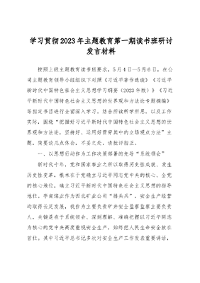 学习贯彻2023年主题教育第一期读书班研讨发言材料按照上级主题教育读书班要求,5月4日—5月6日,在公司主题教育领导小组组织下对照《习近平著作选读》《习近平新时代中国特色社会主义思想学习纲要(2023年版)》《习近平新时代中国特色社会主义思想的世界观和方法论专题摘编》等指定书目进行全面深入学习。结合所读所学所思,以及工作实际,围绕把握好习近平新时代中国特色社会主义思想的世界观和方法论,坚持好、运用好贯穿其中的立场观点方法主题,简要谈几点体会,不妥之处,请批评指正。一、以思想行动作为工作决策部署的先导系统领会新时代十年,党和国家事业之所以取得历史性成就、发生历史性变革,根本在于党确立习近平同志党中央的核心、全党的核心地位,确立习近平新时代中国特色社会主义思想的指导地位。亭南煤业作为西北矿业公司排头兵,安全生产经营均取得长足发展,我作为主要负责矿井安全监察监察主要负责人,关键是在于系统领会、深刻理解、准确把握以习近平同志为核心的党中央高度重视安全生产,始终把人民生命安全放在首位。其中习近平总书记多次对安全生产工作发表重要讲话,作出重要批示,深刻论述安全生产红线、安全发展战略、安全生产责任制等重大理论和实践问题,对安全生产提出了明确要求。通过在学习班学习,更加深刻领悟两个确立的决定性意义,把握好这一重要思想的世界观和方法论,掌握贯穿其中的立场、观点、方法,不断提高政治判断力、政治领悟力、政治执行力,以更加饱满的热情、更加昂扬的斗志,防范化解矿井在安全生产过程中安全重大风险,坚持安全第一、预防为主,建立大安全大应急框架,完善全员安全体系,推动全员安全治理模式向事前预防转型。推进安全生产风险专项整治,加强重点工程、重点区域安全监管,确保矿井持久健康发展。二、以走进基层作为管控矿井安全的发轫不走弯路习近平总书记在党的XX大报告中指出,治国安邦,重在基础坚持大抓基层的鲜明导向。这一论述也是党的十八大以来,以习近平同志为核心的党中央把抓基层强基础作为长远之计和固本之策。坚持大抓基层的鲜明导向,就要重心下移,理顺体制、完善机制,疏通经络、激活梢节,更指明了开展安全工作的重要工作方向。既要身入基层,更要心到基层,听真话、察真情,真研究问题、研究真问题。引导各级安全生产管理人员不搞作秀式迎检、盆景式管理、蜻蜓点水式检查,杜绝形式主义、官僚主义不实、不良作风。从我做起,在基层现场每发现一条问题,都要深入分析思考上下功夫,去粗取精、去伪存真,由此及彼、由表及里,找到事物的本质和规律,找到解决问题的办法。深入了解落实情况,到现场心里更有触动,到一线更能找到办法,到职工心里更踏实。切实提升企业本质安全水平,通过抓基层、打基础、练基本功,抓劳动纪律、操作规范和标准检查,打通责任和措施落实的最后一公里。坚守安全底线红线,树牢安全发展理念,始终把安全作为发展的基础和保障。抓住主要矛盾、明确主攻方向、区别轻重缓急。如:当前公司面临两项重点工程(6#煤仓收尾工程、2412面生产组织)、三大工作难题(2408工作面回撤、2412回风巷灾害治理、胶轮车安全运行),针对这些重点工程和难点工作,我做到既要攻坚拔寨,敢于啃硬骨头,又要统筹兼顾,善于抓大格局。深入开展与部门负责人、区队长、技术员谈心谈话活动,形成上下联动、左右协同的安全治理格局。下好防范化解风险先手棋,树立底线思维、极限思维,强化风险监测预警,完善事前预防制度机制,深化灾害超前治理,推动把问题解决在萌芽之时、成灾之前,有力有效保障企业健康稳定发展。三、以创新管理作为矿井持续安全的根基夯实垒台深入学习贯彻习近平新时代中国特色社会主义思想和党的XX大精神,在公司主要党政领导的指导下,进一步加强党对安全工作的集中统一领导上下功夫见实效,坚决维护党中央权威和集中统一领导,坚持把党的领导贯穿煤矿安全工作全过程各方面;在安全创新发展上下功夫见实效,统筹创新发展和安全发展,解决发展理念偏差这个根子问题,牵住责任制这个牛鼻子,下好防范化解风险先手棋,打好安全生产综合整治攻坚战,筑牢双基建设这个压舱石;在锻造敢打必胜的安监队伍上下功夫见实效,发扬三铁精神,锤炼过硬作风,提升监察监管能力和过硬本领。具体要做好以下几点:坚决克服麻痹思想和侥幸心理,打起十二分的精神,以时时放心不下的责任感,深刻反思两个至上理念树得牢不牢,深刻反思工作措施抓得实不实,深刻反思安全责任压得紧不紧,按照四不放过原则,把安全生产始终记在心上、扛在肩上、抓在手上。充分调动和发挥安全生产综合整治工作专班指导、指挥作用,结合月度的安全大检查活动和安全质量评估验收考核,深入开展风险隐患辨识排查,聚焦薄弱环节、关键岗位的安全管理,坚决抓好自查自纠、分析整治、安全措施强化,提升矿井安