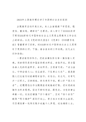 2023年主题教育理论学习专题研讨会发言提纲主题教育活动开展以来,本人全面遵循学思想、强党性、重实践、建新功总要求,深入学习了XXXXXX在学习贯彻XXX新时代中国特色社会主义思想主题教育工作会议上的讲话,以及《党的XX大报告》《党章》《XXX著作选读》等重要学习资料,对XXX新时代中国特色社会主义思想有了更深的认识。下面,结合自身的工作实践,谈几点认识和体验:一要汲取信仰伟力,把政治属性作为第一属性植入灵魂。党的领导是党和国家的根本所在、命脉所在,是全国各族人民的利益所系、命运所系。王勃曾写道:老当益壮,宁移白首之心;穷且益坚,不坠青云之志。就是鼓励人们在任何时候都要有信仰,有信念,有志气、有骨气并一以贯之,坚持到底。作为党员干部,要心怀国之大者,把理想信念作为照亮前进道路的灯塔,把对党的追随作为终身理想,坚定不移听党话、跟党走,为党的事业奉献一切,切实把增强四个意识、坚定四个自信做到两个维护落到行动上,努力在乡村振兴主战场、项目建设第一线等实践中成就个人梦想、创造精彩人生。要以党章为指引,牢牢把稳航行之舵,让坚守初心成为一辈子的事,历经困难考验不改初心,直面风险挑战不失本色,自觉践行共产党人的价值观。在平时生活中,要恪守干净做人、踏实干事、清廉从政的原则不动摇,切实增强纪律意识、规矩意识,严格遵守党纪党规、国家法律法规和单位的规章制度,自觉做到不碰红线、不越底线,确保在思想不抛锚、在行动上不出轨。二要汲取奋进伟力,把担当实干作为价值追求融入血脉。XXXXXX教导我们,要做刻苦学习、锐意创新的模范带头立足岗位、苦练本领、创先争优,努力成为行业骨干青年先锋。只有具备卓越的能力和高超的技能,才能在新的赶考路上披荆斩棘、勇往直前。每个人的青春都只有一次,青年时代是积累知识、锤炼技能的黄金时期。每一位有为的青年都应该珍视这段时光,要有技能恐慌的紧迫感和求知若渴的危机感,自觉将学习作为履行职责的第一需要。我们要坚持不懈地研习党的创新理论,从中领悟战略、启迪思维、启迪智慧、磨炼品格。我们要系统地学、勤奋地学、跟进地学、反复地学、深入地学,不断更新知识、思考问题、领悟真谛。同时,我们要发扬安专迷和钉钉子精神,认真学习党纪国法、政策决策、讲话批示和制度文件,在复杂形势面前不迷茫、在问题矛盾面前不回避、在风险挑战面前不退缩,发扬三牛精神,一锤接着一锤敲,逐一攻克难题,不断增强谋划工作的智慧和推动工作的能力,以承担责任和实现目标的勇气和魄力,勇往直前,破浪前行。三要汲取清廉伟力,把遵规守矩作为行为准则嵌入骨髓。国家若无德则难以兴旺,个人若无德则无法立身。良好的品德修养是每个人最基本的素养。我们党选人用人的原则之一,就是德才兼备、以德为先,品德始终处于首要地位。XXXXXX寄语我们,要做崇德向善、严守纪律的模范,带头明大德、守公德、严私德,严格遵纪守法。青年干部若要在人生道路上走得更正、走得更远,就必须始终保持政治定力、严守纪律规矩、培养个人情操,自觉恪守正道、弘扬正气。应从做好每一件小事、管好每一个小节开始,牢记自律才能自由严管才是厚爱珍惜才会拥有,从善如流、有过则改,勇于革自己的命动自己的奶酪,切实做到慎独慎微、慎始慎终。面对各种诱惑和风险挑战,青年干部要懂得敬畏,敬畏权力、敬畏法纪、敬畏组织,坚决摒弃侥幸心理,拒绝随波逐流远离自作聪明。面对新时代的光明前景,青年干部要懂得感恩,感恩组织的培养、感恩父母的辛劳、感恩社会的包容,脚踏实地、满怀豪情,认真走好干事创业的人生路,奋力跑好开拓进取的接力赛,始终以一往无前的姿态推动党和人民的事业不断前进。