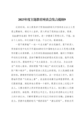 2023年度主题教育座谈会发言提纲近段时间,本人聚焦学习贯彻XXX新时代中国特色社会主义思想主题教育,通过个人自学,深入研读了党的XX大报告、党章、《XXX著作选读》等学习材料,更加深刻认识到XXX新时代中国特色社会主义思想,是当代中国马克思主义、二十一世纪马克思主义,是经过实践检验、富有实践伟力的思想武器,在实现中华民族伟大复兴进程中展现出强大真理力量。下面,结合个人实际,和大家做个交流。不当之处,敬请指教。一要把对党忠诚作为首要标准。在新征程上,我们面临着极其复杂多变的国际国内形势,改革发展稳定的任务艰巨而繁重,同时还面临着各种难以预测的风险和挑战。为了取得优势、把握主动,赢得未来,我们必须不断提高运用马克思主义分析解决实际问题的能力。我们必须有效应对重大挑战,抵御重大风险,克服重大阻力,化解重大矛盾,解决重大问题,以应对这个充满挑战和风险的时代。XXX新时代中国特色社会主义思想是全党全国人民为实现中华民族伟大复兴而奋斗的行动指南。只有坚持不懈用XXX新时代中国特色社会主义思想凝心铸魂,我们党才能团结带领人民全面建成社会主义现代化强国、实现第二个百年奋斗目标,以中国式现代化全面推进中华民族伟大复兴。作为党员干部,我们要以开展主题教育活动为契机,沉下心来学习,认真读原著学原文悟原理,不断增进对党的创新理论的政治认同、思想认同、理论认同、情感认同,全面学习领会XXX新时代中国特色社会主义思想的科学体系、精髓要义、实践要求,做到整体把握、融会贯通,切实把这一重要思想变成改造主观世界和客观世界的强大思想武器。二要把廉洁奉公作为基本要求。廉洁奉公树立新风,是学习贯彻XXX新时代中国特色社会主义思想主题教育的具体目标之一。在主题教育工作会议上,XXXXXX强调,要廉洁奉公树立新风,教育引导广大党员、干部增强纪律意识、规矩意识,持续纠治四风,把纠治形式主义、官僚主义摆在更加突出的位置,做到公正用权、依法用权、为民用权、廉洁用权,推动形成清清爽爽的同志关系、规规矩矩的上下级关系、亲清统一的新型政商关系,当好良好政治生态和社会风气的引领者、营造者、维护者。廉者,政之本也。廉洁从政,秉公用权,是我们党的光荣传统和优良作风。历史和人民之所以选择中国共产党?一个重要原因就在于一代代共产党人坚守为民初心、勇担时代使命,秉持廉洁奉公的高尚操守,凝聚起干事创业的磅礴力量。作为党员干部,我们要以开展主题教育活动为契机,对照要求、对准目标,找一找在廉洁自律方面存在的差距,不断锤炼意志力、坚忍力、自制力,以廉洁奉公的实际行动,弘扬正气、树立新风,把好传统带进新征程,将好作风弘扬在新时代。三要把担当作为作为第一要务。XXXXXX强调:时代呼唤着我们,人民期待着我们,唯有矢志不渝、笃行不怠,方能不负时代、不负人民。党员干部的神圣职责就是建新功。新时代是奋斗者的时代,党和国家事业取得历史性成就、发生历史性变革,离不开筚路蓝缕、手胼足胝的艰苦奋斗,作为党员干部,要通过这次主题教育,进一步凝心聚力、深化认识,增强责任感和使命感,提振锐意进取、担当有为的精气神,以饱满的热情、必胜的信心、昂扬的斗志,知难而进、迎难而上,依靠顽强斗争扎实推进伟大使命的实现,使我们党始终充满蓬勃生机和旺盛活力,始终成为中国特色社会主义事业的坚强领导核心。要切实把学习贯彻XXX新时代中国特色社会主义思想主题教育焕发出来的学习、工作热情转化为攻坚克难、干事创业的强大动力,用实际工作成效检验主题教育成果。我就讲这些,谢谢。
