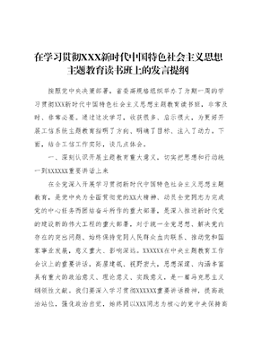 在学习贯彻XXX新时代中国特色社会主义思想主题教育读书班上的发言提纲按照党中央决策部署,省委高规格组织举办了为期一周的学习贯彻XXX新时代中国特色社会主义思想主题教育读书班,非常及时、非常必要。通过这次学习,收获很多、启示很大,为更好开展工信系统主题教育指明了方向、明确了目标、注入了动力。下面,结合工信工作实际,谈几点体会。一、深刻认识开展主题教育重大意义,切实把思想和行动统一到XXXXXX重要讲话上来在全党深入开展学习贯彻新时代中国特色社会主义思想主题教育,是党中央为全面贯彻党的XX大精神、动员全党同志为完成党的中心任务而团结奋斗所作的重大部署,是深入推进新时代党的建设新的伟大工程的重大部署,对于统一全党思想、解决党内存在的突出问题、始终保持党同人民群众血肉联系、推动党和国家事业发展,意义重大、影响深远。XXXXXX在中央主题教育工作会议上的重要讲话,高屋建瓴、视野宏大,思想深邃、内涵丰富具有重大的政治意义、理论意义、实践意义,是一篇马克思主义纲领性文献。我们要深入学习贯彻XXXXXX重要讲话精神,提高政治站位,强化政治自觉,始终同以XXX同志为核心的党中央保持高度一致。一是开展这次主题教育,是统一全党思想意志行动的必然要求。团结统一是党的生命,有了思想上的高度统一,才有政治上的空前团结、行动上的坚定一致。新时代十年的伟大变革,最根本在于有XXXXXX掌舵领航,有XXX新时代中国特色社会主义思想科学指引。开展主题教育,就是教育引导党员干部自觉做党的创新理论的坚定信仰者和忠实实践者,坚持用XXX新时代中国特色社会主义思想凝心铸魂,推动党的创新理论入脑入心,筑牢信仰之基、补足精神之钙、把稳思想之舵,忠诚捍卫两个确立,坚决做到两个维护。二是开展这次主题教育,是激励广大党员干部积极担当作为的必然要求。XXXXXX强调,我们党百年奋斗的伟大成就都是我们党团结带领全国各族人民拼出来、干出来的要把党的XX大描绘的宏伟蓝图变成现实,仍然要靠拼、要靠干。开展主题教育,就是教育引导广大党员干部学思想、见行动,提高推动高质量发展本领、服务企业的本领、防范化解风险的本领提振锐意进取、担当有为的精气神,提高执行力,勇于破难题,奋力谱写制造强省建设新篇章。三是开展这次主题教育,是推进全面从严治党的必然要求。XXXXXX告诫我们,全面从严治党永远在路上,党的自我革命永远在路上。开展主题教育,就是教育引导各级党组织和广大党员干部突出问题导向,查不足、找差距、明方向,接受政治体检,纠正行为偏差,不断增强自我净化、自我完善、自我革新、自我提高能力,把严的基调、严的措施、严的氛围长期坚持下去,一刻不停推进全面从严治党,把党员干部队伍建设得更加坚强有力。二、全面落实党中央决策部署,推动工信系统主题教育走深走实牢牢把握主题教育的总要求,对标对表主题教育的目标任务全面落实主题教育的重点措施,扎实推动主题教育深入开展、取得实效。一是久久为功抓理论学习。党的创新理论学习不是一朝一夕的事情,需要长期坚持、不断积淀。结合本次读书班学习,我们要进一步深化学习XXXXXX重要讲话和对XX工作的重要指示批示精神,始终跟进学习XXXXXX最新重要讲话和文章,切实把学习成果转化为推动工业和信息化发展的有效思路和务实举措。抓好厅党组集中学习,组织举办工信读书班,讲好专题党课,引导广大党员干部多思多想、学深悟透、融会贯通。二是久久为功抓调查研究。XXXXXX指出:调查研究是关系党和人民事业得失成败的大问题,是我们党在革命、建设、改革各个历史时期做好领导工作的重要传家宝,必须始终坚持、不断加强。聚焦制约我省工业和信息化发展的症结和广大企业急难愁盼问题,省工信厅厅级干部、二级巡视员、总师都要领题调研,各处室主要负责同志结合职责开展专题调研,采用解剖式调研、督查式调研等方法,扑下身子、沉到一线,寻计问策、解剖麻雀,把底数摸清、问题找准政策提实,并把调研成果上升为制度成果、转化为工作实效。主题教育活动后,更要将调查研究固化成一种制度、一种常态、一种习惯,多走多看、亲力亲为,在调查研究中增强发现问题、解决问题的能力。三是久久为功抓整改落实。主题教育的效果好坏关键在于整改问题能否得到有效落实。系统梳理调查研究发现的问题、推动发展中的问题、群众反映强烈的问题,逐一列出清单找准症结,逐项制定整改措施,能改的马上改,一时解决不了的明确具体措施、整改时限、责任分工,持续深入攻坚,确保整改到位。坚持把问题整改落实融入日常、抓在经常,建立健全长效机制,不断深化拓展主题教育成果。三、聚焦主责主业,促进工业和信息化高质量发展坚持把推动发展作为主题教育的着力点,大力实施中国式现代化XX工业场景行动,加速推进制造业高端化智能化绿色化转型真正把工业立起来。一是抓工业经济稳增长。一季度,全省规模以上工业增加值同比