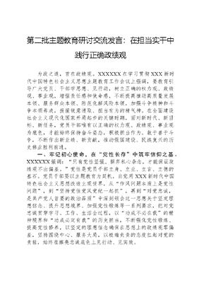 第二批主题教育研讨交流发言:在担当实干中践行正确政绩观为政之道,首在政绩观。XXXXXX在学习贯彻XXX新时代中国特色社会主义思想主题教育工作会议上强调,要教育引导广大党员、干部学思想、见行动,树立正确的权力观、政绩观、事业观,增强责任感和使命感,不断提高推动高质量发展本领、服务群众本领、防范化解风险本领,加强斗争精神和斗争本领养成,提振锐意进取、担当有为的精气神。在全面建设社会主义现代化国家开局起步的关键时期,面对新时代、新目标、新任务,党员干部唯有以正确的权力观、政绩观、事业观为底色,才能始终保持奋斗姿态,积极担当作为、敢于善于斗争,不断作出新业绩、新贡献,推动强国建设、民族复兴的历史伟业胜利前进。一、牢记初心使命,在党性长存中筑牢信仰之基。XXXXXX强调:只有党性坚强、摒弃私心杂念,才能保证政绩观不出偏差。党性是党员干部立身、立业、立言、立德的基石。党员干部要以主题教育为契机,自觉用XXX新时代中国特色社会主义思想改造主观世界,从作风问题本质上是党性问题,到坚持党性党风党纪一起抓,再到对党忠诚,是共产党人首要的政治品质中深刻领会这一思想关于坚定理想信念、提升思想境界、加强党性锻炼等一系列要求,把对党忠诚贯穿学习、工作、生活全过程,以功成不必在我的精神境界和功成必定有我的历史担当,不断强化党性锻炼、提高党性修养,以坚定的理想信念确保在思想上的政绩观零偏差,坚持围绕中心、服务大局,以极端负责的态度扛起对党的责任,始终在擦亮忠诚底色上见行动、见实效。二、弘扬实干作风,在干事创业中扬起务实之帆。正确政绩观不是片面、单一的政绩观,也不是一种显性的成绩指标。XXXXXX强调,政绩最后看综合指标,看总体要求的实现程度。党员干部是推动党和人民事业发展的基石,其政绩观直接影响着党的事业的发展方向和成效。作为党员干部要认真对标七种能力八项本领,有针对性地加强理论学习、政策学习、管理学习、法规学习,加快知识更新、优化知识结构、补齐能力短板,提升应对重大挑战、抵御重大风险、克服重大阻力、化解重大矛盾、解决重大问题的能力,争当事业发展的行家里手。要紧紧围绕党和国家重大战略部署要求,强化责任担当、注重团结协作,增强工作的责任心和主动性,聚焦关键领域、关键环节,梳理问题清单,以钉钉子精神持续用力、系统部署、各个击破,不断提高工作的质量和效率。三、深入调查研究,在细照笃行中走好群众路线。主题教育之初,全党大兴调查研究之风,要求党员干部眼睛向下、扑下身子,始终保持同人民群众的血肉联系。XXXXXX在江苏考察时强调:树牢造福人民的政绩观,坚持以人民为中心的发展思想,坚持高质量发展,不搞贪大求洋、盲目蛮干、哗众取宠;坚持出实招求实效,不搞华而不实、投机取巧、数据造假;坚持打基础利长远,不搞急功近利、竭泽而渔、劳民伤财。中国共产党人的初心和使命,就是为中国人民谋幸福、为中华民族谋复兴。推动经济社会发展,归根到底是为了不断满足人民群众对美好生活的需要。作为党员干部要牢固树立以人民为中心的发展思想,切实把群众需求、群众难题作为工作目标,不搞不符实际的面子工程形象工程,多为人民群众解决急难愁盼的实际问题,多做让群众得实惠的实事好事,自觉与人民群众同呼吸、共命运、心连心。四、自觉遵规守纪,在遵规守纪中永葆清廉本色。立规明纪,其道在心。实现党的第二个百年奋斗目标,既需要党员干部撸起袖子加油干,更需要党员干部严于律己不懈怠。纪律是不可触碰的底线、红线、高压线,是管党治党的戒尺,也是党员干部约束自身行为的标准和遵循。作为党员干部要始终坚持全面从严治党,坚定理想信念,严守党的政治纪律和政治规矩,始终在思想上政治上行动上同以XXX同志为核心的党中央保持高度一致。要坚持依法办事、依法行政,持续强化制度学习,廉洁从政、廉洁用权,勇于担当、履职尽责,始终保持清正廉洁的政治本色。要坚持严于律己,培养健康情趣,时刻自重自省自警自律,慎独慎微慎权慎友,保持正确人生航向,清清白白做人,干干净净做事,杜绝违法违纪行为发生,努力营造风清气正的政治生态和干事环境。