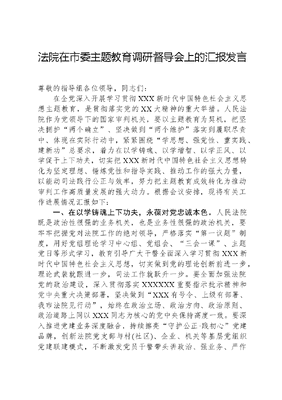 法院在市委主题教育调研督导会上的汇报发言尊敬的指导组各位领导,同志们:在全党深入开展学习贯彻XXX新时代中国特色社会主义思想主题教育,是贯彻落实党的XX大精神的重大举措。人民法院作为党领导下的国家审判机关,要以主题教育为契机,把坚决拥护两个确立、坚决做到两个维护落实到履职尽责中、体现在实际行动中,紧紧围绕学思想、强党性、重实践、建新功总要求,着力在以学铸魂、以学增智、以学正风、以学促干上下功夫,切实把XXX新时代中国特色社会主义思想转化为坚定理想、锤炼党性和指导实践、推动工作的强大力量,以能动司法践行公正与效率,努力把主题教育成效转化为推动审判工作高质量发展的强大动力。根据会议安排,现将有关工作进展情况汇报如下:一、在以学铸魂上下功夫,永葆对党忠诚本色。人民法院既是政治性很强的业务机关,也是业务性很强的政治机关,要牢牢把握党对法院工作的绝对领导,严格落实第一议题制度,用好党组理论学习中心组、党组会、三会一课、主题党日等形式学习,教育引导广大干警全面深入学习贯彻XXX新时代中国特色社会主义思想,切实做到党的理论创新前进一步,理论武装就跟进一步,司法工作就跃升一步。要全面加强法院党的政治建设,深入贯彻落实XXXXXX重要指示批示精神和党中央重大决策部署,坚决做到XXX有号令、上级有部署、我市法院见行动,始终在政治立场、政治方向、政治原则、政治道路上同以XXX同志为核心的党中央保持高度一致。要深入推进党建业务深度融合,持续擦亮守护公正·践初心党建品牌,创新法院党支部与村(社区)、企业、机关等基层党组织党建联建模式,不断激发党员干警带头讲政治、强业务、严作风的典型示范引领作用,努力实现司法裁判的政治效果、法律效果、社会效果有机统一。二、在以学增智上下功夫,提升司法能力水平。司法能力是实现公正司法的前提。面临新形势新情况新挑战,人民法院要将主题教育的目标任务融入到政治建设、业务建设、职业道德建设各方面,不断提升法院干警的综合素能,为中国式现代化贡献更多司法智慧和力量。要持续提升纠纷化解能力,主动融入党委领导下的社会治理大格局,充分运用共享法庭串联起各类解纷资源,真正把矛盾纠纷化解在基层、解决在萌芽状态。对于进入诉讼环节的案件,围绕公正与效率抓实实体公正和程序公正,做好判后答疑和释法说理工作,努力实现案结事了。要持续提升调查研究能力,坚持问题导向、坚持实事求是,深入调研事关审判执行质效、司法公信力提升等方面的系统性、短板性问题,真正把情况摸清、把问题找准、把对策提实,为法院工作高质量发展提供智力支持。要持续提升科技运用能力,深入推进全域数字法院建设,聚焦全面贯通、综合集成、建章立制三个重点,实现从内部管理到外部协同的全链条、全系统智能化,让法官办案更加高效便捷,让群众对公平正义更加可感可触。三、在以学正风上下功夫,展现法院良好形象。以学正风,就是要自觉用XXX新时代中国特色社会主义思想改造主观世界,不断增强党性修养,进一步转作风、扬新风、树形象,着力锻造四个铁一般的法院铁军。要改进司法作风,不断完善为群众办实事长效机制,紧紧盯住人民群众打官司的急难愁盼问题,通过落实司法便民利民举措、推进群众来信有信必复等工作,在为群众纾困解难中传递司法温情。要弘扬时代新风,持续深化纠治四风,把纠治形式主义、官僚主义摆在更加突出的位置抓紧抓实,强化日常监督管理,常态化开展政治督察、司法巡查、审务督察和专项检查,提升各项工作规范化水平。要树立良好形象,坚持严管就是厚爱,进一步增强纪律意识、规矩意识,教育引导干警严格落实防止干预司法三个规定、新时代政法干警十个严禁等铁规禁令,健全一体推进三不腐的体制机制,以零容忍态度严惩司法腐败,确保法官清正、法院清廉、司法清明。四、在以学促干上下功夫,护航改革发展大局。人民法院必须树牢为大局服务、为人民司法的理念与自觉,能动发挥法治固根本、稳预期、立长远的保障作用。要聚焦主责主业发挥职能作用,深入推进司法体制综合配套改革,以当事人一件事集成改革为总抓手,推动审判执行全面提质增效,让流程最少、用时最短、办案最公、服务最优、体验最好、兑现最实成为我市法院的鲜明标识。要着力防范化解重大风险挑战,全面贯彻总体国家安全观,常态化开展扫黑除恶斗争,依法惩治黄赌毒、盗抢骗、食药环等违法犯罪,严防群体性事件、民转刑案件等敏感案事件发生,确保社会大局稳定。要全力推动经济社会高质量发展,围绕三个一号工程,严厉打击破坏市场秩序违法犯罪,依法保护民营企业产权和企业家权益,不断激发市场主体活力。深入践行绿水青山就是金山银山理念,推进生态优先、节约集约、绿色低碳发展,助力我市建设成为美丽中国集成之地浓缩之地经典之地。汇报完毕,谢谢大家!