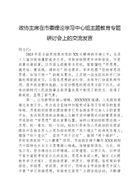 政协主席在市委理论学习中心组主题教育专题研讨会上的交流发言同志们:2023年是全面贯彻落实党的XX大精神的开局之年,也是十三届市政协履职起步之年。市政协按照党中央和省委、市委部署决策部署,以开展主题教育为契机,紧紧围绕学思想、强党性、重实践、建新功的总要求,牢牢把握坚持学思用贯通、知信行统一的根本要求,立足统一战线组织和专门协商机构职能定位,从强化思想政治引领、发挥专门协商机构作用、提升政协整体效能、全面加强党的建设等方面下功夫,在推动新时代人民政协事业高质量发展中彰显了新担当、取得了新成效、呈现了新气象。第一,以创新理论凝心铸魂。XXXXXX强调,人民政协要通过有效工作,努力成为坚持和加强党对各项工作领导的重要阵地、用党的创新理论团结教育引导各族各界代表人士的重要平台、在共同思想政治基础上化解矛盾和凝聚共识的重要渠道。市政协把学思想摆在首要位置,始终以党的创新理论统一思想、统一意志、统一行动,组织引导参加人民政协的各党派团体和各族各界人士更加深刻领悟两个确立的决定性意义,增强四个意识、坚定四个自信、做到两个维护,更好发挥政协三个重要作用。市政协坚持不懈用XXX新时代中国特色社会主义思想凝心铸魂,持续做好深化、内化、转化工作,努力推动在以学铸魂、以学增智、以学正风、以学促干等方面取得实实在在的成效。原原本本深入学,制定《主题教育学习方案》,坚持读原著、学原文、悟原理,自觉做到学而信、学而思、学而悟、学而行。同时在全市政协委员中深入开展学习领袖思想,争做责任委员主题实践活动,不断增进广大委员对党的创新理论的四个认同。领导带头全员学,突出市政协党组、机关党组和专委会分党组成员关键少数带头开展学习研讨交流,构建起中心组+机关党组+专委会分党组+党支部+党员个人的共学体系,做到分层推进、因类施学。结合履职重点学,充分运用书香政协、委员讲堂、区域协作等平台载体,深入领会XXXXXX的重要讲话精神,更好用以指导和推动工作。通过举办政协书画精品联展活动等,在更高层次、更大范围共同感悟党的创新理论的实践伟力,进一步凝聚了思想共识和行动共识。深入研讨交流习。结合主题教育读书班,通过理论学习与研讨交流相结合、专题党课与警示教育相结合、专家辅导与现场教学相结合的方式,推动党的创新理论学习入脑入心。第二,以调查研究破解难题。XXXXXX强调,人民政协要充分发挥优势,聚焦重大问题和群众关切,深入进行调查研究,努力为改革发展出实招、谋良策。调查研究也是人民政协履行职能的一项经常性、全局性、基础性工作,是决定政协履职质量和效能的基础环节。市政协始终把大兴调查研究作为主题教育的重要内容,坚持重调研、勤调研、善调研,运用党的创新理论研究新情况、解决新问题,总结新经验、探索新规律,形成指导实践、推动工作的办法和举措,以调查研究的新成果推动政协事业新发展。市政协认真贯彻落实XXXXXX关于调查研究的重要论述和重要指示批示精神,把调查研究作为人民政协工作的看家本领,履职工作的重中之重,紧扣年度重点协商议政课题开展调研,着力在深、细、实上做文章,取得阶段性成效。坚持深处着力。先后深入可可西里自然保护区等条件艰苦的地方,西宁、海东等情况复杂地方等开展调研,面对面与基层干部群众拉家常、话发展、聚共识,共同研究谋划推动全市高质量发展的新思路新举措。注重细处着眼。坚持集中调研和日常调研相结合,将市内调研和市外调研有机结合起来,通过实地调研、外出考察、专题研讨、调研成果交流等形式,进一步提高调研深度和广度,加强分析研究论证,既认真下马看花,又深入解剖麻雀,为形成高质量调研成果奠定了基础。围绕实处着手。注重调研成果转化运用,在调查的基础上深化研究,提升调研成果的科学化水平。主题教育开展以来,市政协调研履职成果先后得到全国政协领导批示7次,市委市政府领导批示110件(次),许多意见建议转化为推动全市相关重点工作的具体举措。第三,以协商建言服务大局。XXXXXX强调,人民政协要发挥作为专门协商机构的作用,把协商民主贯穿履行职能全过程,推进政治协商、民主监督、参政议政制度建设,不断提高人民政协协商民主制度化、规范化、程序化水平,更好协调关系、汇聚力量、建言献策、服务大局。市政协坚持把重实践、建新功作为主题教育的着眼点,加强前瞻性思考、全局性谋划、整体性推进,确保政协工作与全市大局同频共振,努力以政协一域之光为全市大局增色添彩。市政协深入学习贯彻XXXXXX关于加强和改进人民政协工作的重要思想,立足工作实际,充分发挥政协制度优势、提升服务大局效能,高质量开展协商议政活动,形成了一系列重要履职成果。立足生态保护谋良策。立足三个最大市情定位和三个更加重要战略地位,聚焦贯彻落实黄河保护法,推动全市黄河流域生态
