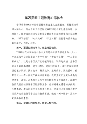 学习贯彻主题教育心得体会学习贯彻XXX新时代中国特色社会主义主题教育,要将理论学习入脑入心,结合自身工作实际把XXXXXX关于深化基层治理、乡村振兴、维护国家政治安全和社会稳定等方面的重要指示批示精神,四下基层八八战略千万工程经验等内容拿进去做到深化、内化、转化。第一,要通过理论学习,坚定政治信仰。XXX新时代中国特色社会主义思想的主要内容是党的十九大、十九届六中全会提出的十个明确十四个坚持十三个方面成就,这是对中国共产党的领导地位、取得的成绩、党和国家未来的根本遵循。建党102年、建国74年以来,我们党和国家经历过很多风雨,抗日战争、解放战争、土地改革、抗美援朝、改革开放……在一次次严峻的考验面前,我们党成长为更加成熟的世界第一政党,马克思主义与中国实际实现了有效融合。现如今虽然我们仍然面临着国际形势复杂、经济增速放缓等诸多问题,反腐倡廉、整治形式主义仍然责任重大,但我们必须明确只有中国共产党才能领导中国走向繁荣富强,做到两个维护是共产党员必备的素质。第二,要紧盯问题整改,转变工作作风。问题整改不能简单地看清单看台账,要坚持动态查与及时改相结合,多听村两委和群众的意见,反思工作中存在的短板和不足,最终要做到当下改与长久立相结合党员干部不应把问题整改局限在主题教育开展的时间之内,要放到个人发展与工作推动中,不仅实现具体问题的整改,还要通过具体问题的整改推动工作作风的转变,要通过主题教育做到心中有党、心中有民。第三,要走深走实,务求取得实效。要深刻认识开展主题教育的重大意义,从严落实学思想、强党性、重实践、建新功各项要求,真正学通弄懂做实,不能一知半解、浅尝辄止。要杜绝雷声大雨点小现象,不能宣传起势声势浩大,落实起来日渐式微。领导干部要多上讲台、讲党课、深调研、办实事,以身作则、带头示范,形成一级做给一级看的浓厚氛围和一级带着一级干的示范效应,否则,在逐级落实主题教育中,将会给形式化、套路化、表面化的形式主义提供滋生的土壤,效果会大打折扣。学习党的创新理论不是最终目的,而是为了指导实践、推动工作。要坚持问题导向,要根据党员干部知识的盲点、短板安排相应主题教育内容,做到理论学习、业务学习、实践锻炼并重,强调融会贯通、学以致用、推动发展。