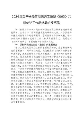 2024年关于全局贯彻信访工作新《条例》共建信访工作新格局的发言稿新《信访工作条例》是在新的历史起点上纵深推进信访制度改革、实现信访工作高质量发展的纲领性文件,对于坚持和加强党对信访工作的全面领导、理顺信访工作体制机制、进一步规范和加强新时代信访工作,都具有重要意义。我通过对《条例》的学习,有些感悟和各位共同交流。一、深刻认识制定出台《条例》的重要意义信访工作是党的群众工作的重要组成部分,是了解社情民意的重要窗口,对于各位来说,我们既是新《条例》的执行者和落实者,更是抓信访工作的具体负责人。新《条例》的颁布和实施,是系统总结了我们党长期以来领导和开展信访工作经验特别是党的十八大以来信访工作制度改革成果,系统回答了新时代信访工作是什么、怎么看、怎么干等一系列重大理论和实践问题,对进一步规范和加强新时代信访工作,具有里程碑意义。一是坚持和加强党对信访工作全面领导的制度安排。对于健全党内法规制度体系,补短板、强弱项、填空白,坚持和加强党对信访工作的全面领导,提高党领导信访工作的系统化、制度化、规范化水平具有重要意义。二是坚持人民至上、密切党和政府同人民群众血肉联系的重要举措。对于健全为人民执政、靠人民执政的顶层设计,构建群众提出批评、建议、申诉、控告或者检举的通道,推动信访工作践行以人民为中心的发展思想,充分发挥了解民情、集中民智、维护民利、凝聚民心的作用具有重要意义。三是加强和改进新时代信访工作、切实履行信访工作职责使命的重要保证。对于进一步理顺信访工作体制机制,优化信访工作程序和方法,提高信访工作能力和水平具有重要意义。二、全面理解《条例》的主要内容新《条例》共6章50条,以XXX新时代中国特色社会主义思想为指导,全面贯彻落实XXXXXX关于加强和改进人民信访工作的重要思想,全面融合了国务院2005年修订实施的《信访条例》,充分吸收了党的十八大以来信访工作取得的理论成果、制度成果、实践成果,对新时代信访工作作出了系统安排和全面规范。重点把握五个方面:一是阐明了新时代信访工作的地位作用。深刻揭示了信访工作的政治性和人民性,阐明了信访工作所承载的政治参与、权利保障、民主监督的重要功能。体现了信访工作在党和国家工作大局中的重要地位,进一步明确了新时代信访工作的发展方向和着力点。二是明确了新时代信访工作的原则要求。主要原则是:坚持党的全面领导,坚持以人民为中心,坚持落实信访工作责任,坚持依法按政策解决问题,坚持源头治理化解矛盾。基本要求是:畅通信访渠道,做好信访工作,认真处理信访事项,倾听人民群众建议、意见和要求,接受人民群众监督,为人民群众服务。三是确立了党领导下的信访工作体制。构建党委统一领导,政府组织落实,信访工作联席会议协调,信访部门推动,各方齐抓共管新格局。四是优化了信访事项处理程序。信访部门和其他机关、单位按照大口进入、分类处理的原则,登记后甄别是否属于法定职责范围,并区分建议意见、检举控告、申诉求决等不同事项类别,按照相关法律法规分别导入不同途径处理。五是构建了信访工作监督体系。包括监督责任、监督机制、责任追究在内的监督体系。三、深入领会信访工作的政治属性《条例》指出,坚持党的全面领导,把党的领导贯彻到信访工作各方面和全过程,确保正确政治方向,这充分体现了党中央对信访工作的高度重视。做好信访工作,关系巩固党的执政基础这一政治问题,关系保持党同人民群众血肉联系这一核心问题,关系维护改革发展稳定这一重大问题。作为党员领导干部,对于信访工作必须从政治上看、从政治上办,学深悟透XXXXXX关于加强和改进人民信访工作的重要思想和《信访工作条例》,准确把握新时代信访工作的性质作用、目标任务、重大原则、实践要求,充分发挥坚持党的全面领导这一根本保证、最大优势,定期听取情况汇报、分析研判形势、研究重点问题、部署推动工作,以强有力的组织领导保证各项任务落到实处,以实际行动忠诚拥护两个确立、做到两个维护。四、始终坚守信访工作的人民立场XXXXXX将信访工作喻为送上门来的群众工作,强调信访工作的首义,在于时刻把自己看成人民中的一员,把心贴近人民。《信访工作条例》将坚持以人民为中心作为信访工作应当遵循的原则之一,充分彰显了人民信访为人民的工作理念和价值取向。一是从思想层面入手,结合推动党史学习教育常态化长效化,教育党员干部时刻牢记初心使命,自觉把人民利益放在心中最高位置,坚定为人民利益和幸福而奋斗。二是从行动层面深化,切实把以人民为中心贯穿各项工作始终,用心做好了解民情、集中民智、维护民利、凝聚民心的工作,做到想群众之所想、急群众之所急、解群众之所困。三是从方法层面求细,坚持走好群众路线,将心比心、换位思考,多到情况复杂、矛盾突出的地方去,把群众的操心事、烦心事、揪心事当作自家事来办,以解决急难愁盼问题的实际成果赢得群