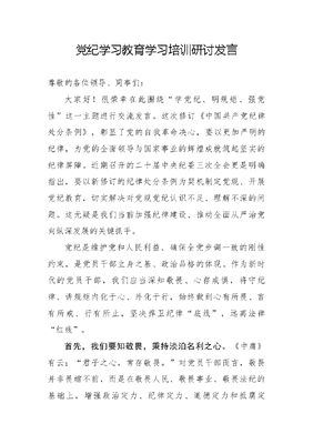 党纪学习教育学习培训研讨发言尊敬的各位领导、同事们:大家好!很荣幸在此围绕学党纪、明规矩、强党性这一主题进行交流发言。这次修订《中国共产党纪律处分条例》,彰显了党的自我革命决心,要以更加严明的纪律,为党的全面领导与国家事业的辉煌成就筑起坚实的纪律屏障。近期召开的二十届中央纪委三次全会更是明确指出,要以新修订的纪律处分条例为契机制定党规、开展党纪教育,切实解决对党规党纪认识不足、理解不深的问题。这无疑是我们当前加强纪律建设、推动全面从严治党向纵深发展的关键抓手。党纪是维护党和人民利益、确保全党步调一致的刚性约束,是党员干部立身之基、政治品格的体现。作为新时代的党员干部,我们应当深知敬畏、心存戒惧,将守纪律、讲规矩内化于心、外化于行,始终做到心有所畏、言有所戒、行有所止,坚决捍卫纪律底线,远离法律红线。首先,我们要知敬畏,秉持淡泊名利之心。《中庸》有云:君子之心,常存敬畏。对党员干部而言,敬畏并非畏缩不前,而是在敬畏人民、敬畏事业、敬畏法纪的基础上,增强政治定力、纪律定力、道德定力和抵腐定力,做到有所为有所不为。敬畏之心是自律的起点,也是行为的界标,唯有心有所畏,方能行有所止,始终保持政治本色。其次,我们要知边界,提升自我修养。边界意识是干部成长不可或缺的素质,是思想修炼的重要课题。我们要对照党纪条规,明确言行举止的界限,知晓哪些言语不可说,哪些交往应避免,哪些行为不可为。天下事,成于惧而败于忽。唯有常怀戒慎之心,才能避免思想脱轨、行为失范,避免因一时疏忽招致祸患。为此,我们要以党纪为镜,涵养忠诚干净担当的政治品格,时刻保持慎独慎微慎始慎终,增强抵御各种诱惑的能力,确保人生之路行稳致远。再者,我们要守底线,保持行动自觉。正如XXXXXX所强调,党员干部须铭记清廉是福、贪欲是祸的道理,时常对照党的理论和路线方针政策、对照党章党规党纪、对照初心使命,审慎判断行为的正当性,做到自重自省。具体而言,一是守好法律底线,牢记法律红线不可触碰,争做尊法学法守法用法的表率,营造良好的法治环境;二是守好纪律底线,深入学习并严格践行党章党纪,将其融入日常工作中,确保每一步行动皆合规合矩;三是守好道德底线,加强道德修养,培养良好生活习惯,慎重交友,明辨是非,严以律己,宽以待人,以高尚的道德情操塑造共产党员的良好形象。木受绳则直,金就砺则利。守纪律、讲规矩是共产党员保持先进性和纯洁性的必由之路。面对新的形势任务,我将积极响应党纪学习教育活动号召,深入研读新修订的《中国共产党纪律处分条例》,精准把握六项纪律的精神实质和操作要求,力求学以致用,以实际行动做好表率,持续提升自身的党性修养、纪律观念和工作能力。面对新时代的使命召唤,让我们共同以党纪为引领,明规矩、强党性,以敬畏之心坚守底线,以自觉行动彰显忠诚,以清风正气推动全面从严治党走向深入,为实现中华民族伟大复兴的中国梦贡献我们的力量。以上是我的发言,如有不当之处,敬请各位领导和同事批评指正。谢谢大家!