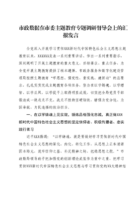 市政数据在市委主题教育专题调研督导会上的汇报发言全党深入开展学习贯彻XXX新时代中国特色社会主义思想主题教育以来,XXXXXX发表一系列重要讲话、作出一系列重要指示,深刻阐明了开展主题教育的重大意义、目标要求、重点任务,为全党开展主题教育提供了根本遵循。市政务服务和数字化建设管理局按照主题教育学思想、强党性、重实践、建新功的总要求,扎扎实实完成主题教育各项任务,努力在以学铸魂、以学增智、以学正风、以学促干上取得明显成效,切实把全局党员干部锻造成一块攻无不克、战无不胜的坚硬钢铁,增强为党分忧、为国奉献、为民造福的政治担当。一、在以学铸魂上见实效,锤炼品格强化忠诚,真正做XXX新时代中国特色社会主义思想的坚定信仰者、积极传播者、忠实践行者习近平XXX强调:以学铸魂,就是要做好学习贯彻新时代中国特色社会主义思想的深化、内化、转化工作,从思想上正本清源固本培元,筑牢信仰之基、补足精神之钙、把稳思想之舵。市政数局领导班子把加强党的创新理论武装作为重中之重,把学习贯彻XXX新时代中国特色社会主义思想与学习贯彻党的XX大精神结合起来,与学习贯彻XXXXXX视察吉林重要讲话重要指示精神结合起来,与学习贯彻XXXXXX关于网络强国、数字中国、营商环境建设等领域的重要论述结合起来,一体学习领会、一体贯彻落实,着力在真学真懂真信真用上下功夫,不断筑牢信仰之基、补足精神之钙、把稳思想之舵。坚持第一议题制度,及时跟进学。严格落实第一议题制度,坚持把学习贯彻XXXXXX重要讲话重要指示精神作为首要政治任务,第一时间传达学习,第一时间贯彻落实。及时学习XXXXXX关于主题教育系列重要讲话精神,全面落实党中央、市委关于主题教育的各项决策部署,牢牢把握主题教育正确方向,持续推进主题教育走深走实走细。举办集体学习读书班,交流研讨学。坚持读原著、学原文、悟原理,深入研读党的XX大报告和党章,认真学习《XXX著作选读》《XXX新时代中国特色社会主义思想专题摘编》等指定书目,全面学习领会XXX新时代中国特色社会主义思想的科学体系、核心要义、实践要求把握好这一重要思想的世界观、方法论,坚持好、运用好贯穿其中的立场观点方法。主题教育开展以来,市政数局开展理论学习中心组集中研讨8次、邀请专家授课1次;32个基层党组织同步开展理论学习,不断增进对党的创新理论的政治认同、思想认同、理论认同、情感认同。常态化开展理论学习,入脑入心学。坚持把学习贯彻XXXXXX系列重要讲话作为一项重大政治任务,制定主题教育常态化理论学习机制,做到持续跟进、常学常新,学以致用、身体力行,对标对表、入脑入心,全局党员干部均结合自身实际制定了开展常态化理论学习的计划,通过理论学习中心组集中研讨、支部党员大会集体学习、领导干部讲专题党课、个人分散自学多种形式开展理论武装,引导党员干部做到学思用贯通、知信行合一,切实把学习成果转化为指导实践、推动工作的强大力量。二、在以学增智上见实效,实干担当促进发展,不断提高领导和推动政数系统工作高质量发展的能力本领XXXXXX强调:以学增智,就是要从党的科学理论中悟规律明方向、学方法、增智慧,把看家本领、兴党本领、强国本领学到手。按照党中央《关于在全党大兴调查研究的工作方案》决策部署和市委、市政府具体工作安排,市政数局领导班子大兴调查研究之风,按照XXXXXX倡导的深、实、细、准、效五字诀要求,扑下身子、沉到一线,到困难多、群众意见集中、工作打不开局面的地方深入调研,真正把情况摸清、把问题找准、把对策提实,使调研的过程成为发现问题、解决问题、改进工作的过程。确定调研课题,突出实字。把社会最关注、群众最期盼的问题作为调研重点,结合职能职责和工作实际,研究确定调研课题,涵盖全市一体化政务大数据体系建设、运用信用手段支持企业发展、网上政务服务能力提升、推动营商环境优化、前瞻性布局元宇宙产业、推动公共资源交易高质量发展、推动免费开放公共资源支持5G基站建设等调研课题,重在解决业务工作中的难点和问题,确保市委、市政府决策部署落实落地。开展调研活动,注重广字。采取四不两直方式,赴全市9县(市、区)、开发区等地区开展走访调研63次,重点围绕党中央、国务院和市委、市政府决策部署,深入查找分析在推进实施一主六双高质量发展战略、服务六新产业发展和四新设施建设、加强数字政府建设、加快推进政务服务标准化规范化便利化优化营商环境等方面存在的问题短板及其根源,找准切入点、发力点,把政数系统工作融入全市新发展格局。转化调研成果,突出用字。按照要求制定三张清单和成果转化清单,召开主题调研成果交流会,运用党的创新理论加强对调研情况的综合分析和深度研究,集思广益、集智攻关,对调研中形成的新认识新体悟进行系统梳理和深度思考,把调研成果转化为推动工作