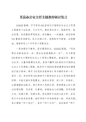 某县办公室主任主题教育研讨发言XXXXXX强调,学习贯彻XXX新时代中国特色社会主义思想主题教育不划阶段、不分环节,要把理论学习、调查研究、推动发展、检视整改贯通起来,有机融合、一体推进。深刻领悟XXX重要讲话精神,结合近期工作,我围绕学习教育、检视整治、调查研究三个环节作个简要发言。一要加强学习教育,坚定理想信念。XXXXXX强调,党的理论创新每前进一步,理论武装就要跟进一步。学习贯彻XXX新时代中国特色社会主义思想主题教育,基础在学、重点也在学。注重加强理论武装,坚持不懈用XXX新时代中国特色社会主义思想凝心铸魂,跟进学习XXXXXX最新重要讲话和重要指示批示精神,善用《论党的自我革命》等书辅导先学一步、深学一层,深刻领悟XXX新时代中国特色社会主义思想的精神实质、丰富内涵和实践要求,做到全面学、深入学、系统学。注重增强政治能力,要从党和人民的立场、党和国家工作大局出发想问题、作决策、办事情,保持政治上的清醒,切实把握方向、把握大势、把握全局,坚决拥护中央的大政方针、坚决执行中央的决策部署,始终同党中央保持高度一致、同频共振,真正增强四个意识、坚定四个自信、坚决做到两个维护。注重强化理论思维,要深入学习领悟XXX新时代中国特色社会主义思想的世界观、方法论和贯穿其中的立场观点方法内化深化转化为自己的科学思想方法,切实提高战略思维、辩证思维、系统思维、创新思维、历史思维、法治思维、底线思维等思维能力,特别是持续抓好学用结合,注重用党的创新理论武装头脑、指导实践、推动工作,切实以工作新成效彰显主题教育成果。二要深入检视整治,清仓见底问题。一语不能践,万卷徒空虚,学习调研,归根结底还是要检视整改。越是面对复杂形势、艰巨任务,越是要坚持更高标准、更严要求。深入查纠问题,爱因斯坦曾说过,提出(发现)一个问题往往比解决一个问题更为重要;吉德林法则明确,发现问题往往比解决问题更加重要,把问题清楚的写下来,就已经解决一半。这些都富有很深的哲理。要发扬自我革命和自我斗争的精神,坚持学习对照和检视整改同步进行,以刀刃向内的勇气,从思想根源、工作作风、行为表现上深挖突出问题。深入聚焦重点,坚持边学习、边检视、边整治,把查纠问题作为一个动态过程,发扬彻底的自我革命精神,把自己摆进去、把事情摆进去、把问题摆进去,用手电筒多照自己,真正触及灵魂、触及要害、触及痛处,不断发现问题、解决问题、巩固整改成效。坚持冲着问题去、奔着难处攻、向着常态抓,全面排查突出问题和风险隐患,常念紧箍咒、勤打预防针、筑牢防火墙,确保少发生问题、不发生问题。深入推进整改,发现问题后要以最鲜明的态度、最有力的措施、最果敢的行动抓好整改,如果发现问题后不解决,就等于形式主义、纸上谈兵,毫无用途。对能够立即整改的问题要立查立改,对要分步整改的问题分类建立整改台账,明确整改时限和要求,切实把问题清单变为成效清单,特别是要坚持当下改与长久立相结合,做好完善机制、建章立制的工作,将好经验、好做法以制度形式固定下来、施之长远。三要深入调查研究,推动建设发展。调查研究是谋事之基、成事之道,是推动主题教育走深走实的重要内容,是此次主题教育的鲜明特色。调研要细致,继承和发扬好调查研究的优良传统,把调查研究贯穿主题教育的全过程,多到一线去调研,对重大问题,要反复多次调研。既要到工作开展好的地方去总结经验、提升工作,又要到困难较多、矛盾尖锐、工作做得差的地方去研究问题、推动工作,真正做到听实话、察实情、求实效。调研要深入,坚持问题导向,难题在哪里,就往哪里用力,多到困难大、群众意见集中、工作打不开局面的地方去,多到环境差,条件差的地方去,特别是紧扣工作中需要解决的重点、难点问题,带着问题去、带着思考去,深入开展调查研究,把矛盾和问题搞深摸透,找到解决问题、推动工作的办法。调研要务实,发扬求真务实的工作作风,力戒形式主义、官僚主义,解决好调门高、行动少、落实差等问题,使广大基层干部从痕迹管理、文山会海中解脱出来,俯下身子深入群众,聚精会神地搞建设、抓落实、谋发展。杜绝把说了当做了、把做了当做好了,避免久入鲍肆而不闻其臭,虱子多了不怕咬,特别是摸清实际情况,把握事物本质、把握发展规律、把握工作关键、把握政策尺度,增强调查研究的针对性和实效性。