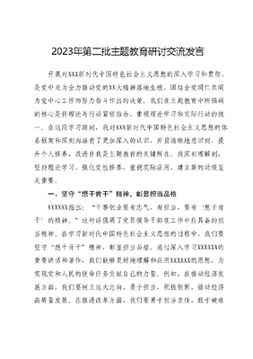 2023年第二批主题教育研讨交流发言开展对XXX新时代中国特色社会主义思想的深入学习和贯彻,是党中央为全力推动党的XX大精神落地生根、团结全党同仁共同为党中心工作而努力奋斗作出的决策。我们在主题教育中所强调的核心是将理论与行动紧密结合,重视理论学习和实际行动的统一。在这段学习期间,我对XXX新时代中国特色社会主义思想的体系框架和深刻内涵有了更加深入的认识,并且清晰地意识到,提升个人修养,改进自我是主题教育的关键所在。我深刻理解到,坚持理论学习、强化党性修养、重视实际应用、建立新的功绩至关重要。一、坚守想干肯干精神,彰显担当品格XXXXXX指出:干事创业要有志气、有担当,要有想干肯干的精神。这句话强调了党员领导干部在工作中应具备的担当精神。在学习新时代中国特色社会主义思想的过程中,我们要坚守想干肯干精神,彰显担当品格。通过深入学习XXXXXX的重要讲话和著作,我们能够更好地理解和应用XXXXXX的思想,为实现党和人民的使命任务贡献自己的力量。例如,在推动经济发展方面,我们要树立远大志向,勇于担当,积极创新,推动经济高质量发展。在推进改革方面,我们要勇于担当责任,敢于破难题,推动改革创新取得更好成果。过去,我们在推动乡村振兴战略实施中,充分发挥了XXXXXX的思想引领作用。通过加强农村基础设施建设、培育新型农业经营主体、推动农村产业融合发展等措施,我们取得了显著的成效。例如,在某个贫困县,我们积极引导农民发展特色产业,通过建设农产品加工厂和推广农业科技实现了农民增收致富,促进了乡村经济的快速发展。下一步,我们要继续坚守想干肯干精神,彰显担当品格。要树立远大志向,勇于担当责任,积极创新,为实现党和人民的使命任务贡献自己的力量。要注重发挥党员领导干部的模范带头作用,引领广大干部群众积极投身到实现中华民族伟大复兴的伟大事业中去。二、锤炼能干会干才干,体现职业智慧XXXXXX指出:干事要有本领,干事要有智慧。这句话强调了党员领导干部在工作中应具备的才干和职业智慧。在学习新时代中国特色社会主义思想的过程中,我们要锤炼能干会干才干,体现职业智慧。通过深入学习XXXXXX的重要讲话和著作,我们能够更好地提升自身的能力和素质,为解决实际问题提供有效的解决方案。例如,在推动科技创新方面,我们要加强学习和研究,掌握前沿科技知识,引领科技创新发展。在推进教育事业发展方面,我们要加强学习和研究,提高教育教学水平,培养优秀人才。过去,我们在推动教育事业发展中,充分发挥了XXXXXX的思想引领作用。通过加强教师队伍建设、优化教育资源配置、推动教育公平等措施,我们取得了显著的成效。例如,在某个地区,我们加大了对农村教育的投入,修建了多所现代化学校,提供了优质的教育资源,使得农村学生享受到了与城市学生同等的教育机会。下一步,我们要继续锤炼能干会干才干,体现职业智慧。要加强学习和研究,不断提升自身的能力和素质。要注重实践和创新,将学到的知识应用到实际工作中,为解决实际问题提供有效的解决方案。要注重团队合作,与同事们共同探讨问题,汇集智慧,形成集体智慧,共同推动工作的顺利进行。三、培养真干实干风格,筑牢务实基石XXXXXX指出:干事要有实干精神,真干实干。这句话强调了党员领导干部在工作中应具备的务实作风和实干精神。在学习新时代中国特色社会主义思想的过程中,我们要培养真干实干风格,筑牢务实基石。通过深入学习XXXXXX的重要讲话和著作,我们能够更好地理解和践行XXXXXX的思想,将其转化为实际行动,取得更加实实在在的成果。例如,在推动脱贫攻坚工作中我们要坚持实事求是的原则,深入了解贫困地区的实际情况,制定科学的扶贫计划,真正帮助贫困群众摆脱贫困。过去,我们在推动乡村振兴战略实施中,充分发挥了XXXXXX的思想引领作用。通过深入调研、制定详细的规划方案、积极落实政策措施,我们取得了显著的成效。例如,在某个乡村振兴示范区,我们注重发展乡村旅游产业,通过打造特色景区和农家乐,吸引了大量游客带动了当地经济的快速发展。下一步,我们要继续培养真干实干风格,筑牢务实基石。要注重实际效果,不仅要有计划和目标,更要有切实可行的行动方案。要注重问题导向,解决实际问题,取得实实在在的成果。要注重创新和改革,不断探索新的工作方法和路径,推动工作的创新发展。四、确立干成干好导向,追求实效成果XXXXXX指出:干事要有实效,干成干好。这句话强调了党员领导干部在工作中应追求实效和成果。在学习新时代中国特色社会主义思想的过程中,我们要确立干成干好导向,追求实效成果。通过深入学习XXXXXX的重要讲话和著作,我们能够更好地理解和践行XXXXXX的思想,将其转化为具体行动,取得实际成果。例如,在推动环境保护工作中,我们要注重实际效果,采取切