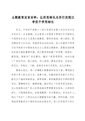 主题教育发言材料:让所思转化为所行实现以学促干学用相长近日,中国共产党第二十届中央委员会第二次全体会议在北京举行。全会强调,在全党深入开展学习贯彻习近平新时代中国特色社会主义思想主题教育,要科学谋划、精心组织,强化理论学习和运用,取得实实在在的成效。深入开展学习贯彻习近平新时代中国特色社会主义思想主题教育,是强化创新理论武装头脑的重要举措,我们要深刻把握学思想、强党性、重实践、建新功的总要求,锚定学思用贯通、知信行统一的总任务,精心组织、用心谋划,聚焦长效化、系统化、常态化、实践化。下面,我联系自身工作实际,谈几点看法。聚焦长效化,进一步增强主题教育的信念之基。理想信念是共产党人的立身之本、成事之基,无数的革命先辈们之所以能矢志不渝地奉献热血、探索道路,靠的就是坚定不移的理想信念。要赓续信念、接续辉煌,就必须以风雨多经志弥坚,关山初度路尤长的心态坚持推动思想教育长效化,以深刻促持久、以理想促坚定,多维度阐释,多方面结合,多元化引入,突出信念二字在此次主题教育中的位置,牢牢把握、用好用活思想教育这个筑牢信念的必要条件,深入引导党员干部从党史中学、从实例中悟、从小事中行,杜绝教科书式的宣讲和唯会议主义,用教育上的新形式、新载体、新介质长效化实现思想上的新认识、新领悟、新成长,以思想教育为党员干部筑牢信念之基,补足精神之钙,助力掌好航向、把好船帆,让党员干部充分知,坚定信。聚焦系统化,进一步增强主题教育的政治自觉。政治上的坚定源自理论上的清醒。要走好中国特色社会主义道路、守住来之不易的成果、开拓伟大复兴的未来,让主题教育的成效最大化,就必须深入推进对党员干部的理论教育,把特写留给道路,将生机注入理论。一是要坚持系统推进,采取课前自学原文、课余探讨研究、课中专家讲解、课后开展阶段性考核、组织实践印证的形式,形成学习、讨论、探究和实践印证相统一的系统性学习,促成准确的认知和清晰的理解。二是要坚持学用结合,既要学深理论、弄懂来源、悟透奥义,也要举一反三、知行合一,避免理论倒背如流,实践一团乱麻的现象发生。如此方能以全副武装的姿态,不断增强迎接风险挑战的能力和化解困难阻碍的智慧,在正确的道路上披荆斩棘、一往无前。聚焦常态化,进一步增强主题教育的清廉本色。逆水行舟用力撑,一篙松劲退千寻。一个政党,只有以刀刃向内的决心不断自我净化,才能永葆先进性和纯洁性。全面从严治党、严肃纠治四风、全力遏制腐败,就如逆水行舟,不进则退,进的效益显现于无形之中,退的危害却立竿见影。在此次主题教育中,要常态化加强纪律教育,标明红线、划清底线,驰而不息、久久为功,让廉政思想成为干部心中的磐石。把纪律教育同信念教育、理论教育相结合,以身边的鲜活案例作警示,以扎实的理论学习掸灰尘,以伟大的理想信念醒人心,通过动之以情,晓之以理,示之以警的方式让党员干部照身正帽;用好廉政讲堂、落马干部面对面等新教育形式,以前车之鉴醒后事之师,消除疲倦心理、鞭策懈怠心理、遏制侥幸心理,让党员干部撑好船篙,行稳致远。聚焦实践化,进一步增强主题教育的实干能力。方向不对,努力白费。实干不等于蛮干,既要找准点位发力、瞄准方向发力、锚定目标发力,也要善于出巧力、敢于出猛力。落实主题教育,要明确学思用贯通、知信行统一的根本任务,坚持实践化方法教育,注重强调苦干、实干、巧干,引导学习方式、方法、策略。一方面,要以扎实的学习筑牢理论基础,以马克思主义哲学推动世界观和方法论的统一,用好调研、课堂、培训等重要手段,传经验、授方法,让干部做到腹有良策。另一方面,要秉持学中干,干中学的理念,一边宣传典型,一边带头实践,引导党员干部牢固树立实干意识、实干精神、实干担当,采取多种途径营造干事创业的良好环境,推动形成你追我赶的实干氛围,在不断地试错、纠错的过程中,练就独门绝技。如此方能让所学服务于所用,让所思转化为所行,实现以学促干、以学促才。