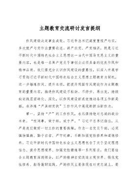 主题教育交流研讨发言提纲作风建设决定事业成败。习近平总书记高度重视严与实,多次就严与实作出重要论述。讲严求实、严实相济,既是习近平新时代中国特色社会主义思想这一当代中国马克思主义的重要内容,也是每一名共产党员干事创业必须具备的优良作风和精神品质。我们要充分认识作风建设的重要性,以深入开展学习贯彻习近平新时代中国特色社会主义思想主题教育为契机,进一步锤炼作风、提升本领,把提升巩固作风建设作为主题教育的重要内容,推进作风建设不松劲、不停步、再出发,持续向实践层面转化、深化,以作风建设新成效推动各项工作新局面,在淬炼严真细实快工作作风中展现新担当新作为。第一,坚持严的工作作风,永远保持绝对忠诚的政治本色。世间事,做于细,成于严。习近平总书记指出,从严是我们做好一切工作的重要保障。作为一名党员干部,必须慎独慎微、勤于自省、严守纪律,不断加强党性修养和道德修养。习近平新时代中国特色社会主义思想包含了关于坚定理想信念、提升思想境界、加强党性锻炼等一系列要求,我们要结合主题教育深刻领会,以严的精神自觉改造主观世界、强化党性修养、指导履职实践。严的作风主要体现在对党忠诚上。要通过主题教育,锤炼政治品格,以党的旗帜为旗帜、以党的意志为意志、以党的使命为使命,始终忠诚于党、忠诚于人民、忠诚于马克思主义。坚持用党的创新理论统一思想、统一意志、统一行动,锤炼品格强化忠诚,把党锻造成一块攻无不克、战无不胜的坚硬钢铁,使全党始终保持统一的思想、坚定的意志、协调的行动、强大的战斗力。要坚持用习近平新时代中国特色社会主义思想武装头脑、指导实践、推动工作,自觉把思想和行动统一到党中央决策部署上来,做到党中央提倡的坚决响应、党中央决定的坚决照办、党中央禁止的坚决不做,做到执行党中央决策部署不讲条件、不打折扣、不搞变通。要真心爱党、时刻忧党、坚定护党、全力兴党,以勇于担苦、担难、担重、担险的实际行动诠释对党的忠诚。第二,坚持真的工作作风,切实增强凝心铸魂的政治自觉。疾风知劲草,烈火炼真金。习近平总书记指出,我们党最讲认真,言必行、行必果,说到做到。我们要以学铸魂、坚定理想信念,做好学习贯彻习近平新时代中国特色社会主义思想的深化、内化、转化工作,从思想上正本清源、固本培元,增强对党的价值追求和前进方向的高度政治认同,把好世界观、人生观、价值观这个总开关。要自觉用习近平新时代中国特色社会主义思想改造主观世界,深刻领会这一思想关于坚定理想信念、提升思想境界、加强党性锻炼等一系列要求,不断增进对党的创新理论的政治认同、思想认同、理论认同、情感认同,把这一思想转化为坚定理想、锤炼党性和指导实践、推动工作的强大力量。要有担当作为,要有敢啃硬骨头的思想,发扬钉钉子精神,坚持一锤接着一锤敲、一步一个脚印向前走、一年接着一年加油干,才能承担起时代的重任。认真的态度决定干事创业的高度,党员干部就是要以认真的精神、态度和行动,注入更大的决心、态度和心血,才能接好新时代的接力棒,跑好改革的下一程。第三,坚持细的工作作风,不断强化用心为民服务的能力。天下难事必作于易,天下大事必作于细。用心是情感的倾注和精力的投入,就是要爱岗敬业,忠于职守,牢固树立工作无小事的意识,坚决杜绝无所谓、得过且过的思想,做到始终把心放在工作上,把工作放在心上;工作中注意细节,坚持做好每一个细节,把好每一个细节的关口,就要集中精力干工作,一心一意办事情,需要下功夫,需要付出努力和心血,更需要培养和坚持一丝不苟,严谨细致的工作作风。要放低姿态,牢固树立学习无止境和服务无止境的意识,甘当小学生,甘当勤务员,勇于批评和自我批评,虚心接受别人意见和建议。要融入群众之中,听民意、察民情、解民忧,站在群众立场想问题、作决策、办事情,以同行者的身份而非俯视者的姿态看待群众问题、倾听群众心声。凡事为自身前途考虑少一点,为群众利益考虑多一点,让耐心、细心、贴心贯穿服务群众的始终,永远做人民群众的发声站和靠山石,不断增强人民群众的获得感、幸福感、安全感。第四,坚持实的工作作风,牢固树立对标对表的政治意识。空谈误国,实干兴邦。实事求是,是马克思主义的精髓和活的灵魂,也是我们党的思想路线。作为党员干部,任何时候都要说实话、办实事,察实情、谋实策,任何时候都要鼓实劲、出实招、求实效,始终坚持实事求是、求真务实,力戒形式主义、官僚主义。要落实中央要求,大力弘扬真抓实干的优良作风,切实增强狠抓落实的过硬本领,让求真务实、真抓实干成为自身鲜明履职特点。把理论学习抓实,以学铸魂、以学增智、以学正风、以学促干,做到真学真信真用。把调查研究抓实,坚持从实际出发,奔着问题去,切实摸清实情、拿出实招,推动解决人民群众反映强烈的突出问题和影响制约工作发展的深层次问题。党员干部在新征程
