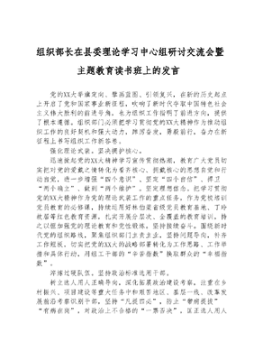 组织部长在县委理论学习中心组研讨交流会暨主题教育读书班上的发言党的XX大举旗定向、擘画蓝图、引领复兴,在新的历史起点上开启了党和国家事业新征程,吹响了新时代夺取中国特色社会主义伟大胜利的前进号角,也为组织工作指明了前进方向,提供了根本遵循。组织部门必须把学习贯彻党的XX大精神作为推动组织工作的良好契机和强大动力,踔厉奋发,勇毅前行,奋力在新征程上书写组织工作新答卷。强化理论武装。坚决拥护核心。迅速掀起党的XX大精神学习宣传贯彻热潮,教育广大党员切实把对党的爱戴之情转化为看齐核心、拥戴核心的思想自觉和行动自觉,进一步增强四个意识、坚定四个自信、捍卫两个确立、做到两个维护。坚定理想信念。把学习贯彻党的XX大精神作为党的理论武装工作的重点任务,作为党校培训党员教育的必修课,持续运用好林伯渠省级党员教育基地、丁玲故居等红色教育资源,扎实开展分层次、全覆盖的教育培训,持之以恒加强党的理论教育和党性锻炼。坚持接续奋斗。围绕新时代党的组织路线,聚焦组织部门主责主业,坚持问题导向,补齐工作短板,切实把党的XX大的战略部署转化为工作思路、工作举措和具体行动,用组工干部的辛苦指数换取群众的幸福指数。淬炼过硬队伍。坚持政治标准选用干部。树立选人用人正确导向,深化拓展政治建设考察,注重在乡村振兴、项目建设等重大任务中和艰苦地区、基层一线、改革发展前沿考察识别干部,坚持凡提四必,防止带病提拔有病在岗,对政治上不合格的一票否决,匡正选人用人良好风气。坚持德才兼备培养干部。突出政治素质提升,强化优良传统、党风党纪和政德修养教育,引导干部自觉树好信仰高线立好价值坐标、守好行为底线。突出业务素质提升,按照干什么学什么、缺什么补什么原则,办好科干班、青干班、专题班等,不断提升干部八项本领七种能力。坚持激励约束管好干部。进一步完善乡科级单位党政正职《履职实绩评价清单》加强干部日常管理监督,认真落实谈心谈话、个人有关事项申报等制度。进一步完善干部担当作为激励保护和容错纠错机制,不断提振干部干事创业的精气神。筑牢战斗堡垒。着力健全组织体系。认真贯彻落实党支部工作条例,巩固提升基层党组织整建提质成果,深入整顿软弱涣散基层党组织,突出抓好两新组织、城乡结合部、工业园区等党的组织和党的工作全覆盖,做好党建引领、助力千企美好小区·幸福家园建设等工作。着力加强基层建设。抓好省委全面加强基层建设1+5文件落实,大力加强村(社区)干部教育培训,全面开展基层党建一乡一品创建,扎实推进发展壮大村级集体经济八大行动,持续推动(一门式)基层公共服务全覆盖。着力服务发展大局。紧扣省委三高四新美好蓝图、市委一个中心、两个枢纽、三个基地战略和县委兴产业、连红线、建新区发展主线,充分发挥党建工作的政治优势和组织优势,教育引导基层党组织和广大党员干部继续在招商引资、乡村振兴等工作中彰显担当作为。释放人才活力。用心引进人才。坚持党管人才原则,修订完善人才引进培育政策,针对不同行业、不同类别制定相应的引才举措,提高引才工作的针对性。大力开展柔性引才,突破人才户籍、身份、学历、职称等限制,打破人才空间地域限制,有效破解高层次及高新尖人才引进难题。精心培育人才。采取向上送培、挂职锻炼、岗位锻炼等多种途径,订单式培养各类人才,特别是要以培育本土人才为根本,根据人才发展特质和培训需求,举办各类接地气的特色培训,推动本土人才队伍壮大提质。组织人才到先进地区、先进行业学习观摩,拓宽视野、取长补短,增强干事创业能力。诚心服务人才。建立人才正向激励机制,完善县级领导直接联系专家制度,适时举办专家人才座谈会,表彰宣传一批作出突出贡献的专家人才,着力解决人才住房保障、家属就业、子女入学等方面的问题,提高县人才公寓入住率,努力构建近悦远来的人才生态。增强考核效能。健全考核体系。注重从顶层设计入手,根据领导班子、领导干部的不同类别、不同层级、不同岗位职责,分别建立差异化的定性与定量相结合的考核体系。根据各单位职能职责科学设置绩效考核指标,逐步从同等标准考核向分类考核、个性化考核转变,不断增强绩效考核工作的针对性和实效性。完善考核机制。健全绩效考核组织、运行、核查等工作制度,建立指标监测、预警提醒、调度督导等工作机制,进一步在考核原则考核框架、考核内容、考核方法、结果运用等方面做科学合理的调整,加大反向考核力度,以精准考核助力经济社会高质量发展运用考核结果。健全绩效考核奖惩机制,坚持考人与考事相结合把绩效考核结果与领导班子和干部评先评优、问责追责、能上能下、年度绩效资金挂钩。绩效考核结果记入领导班子和领导干部考核档案,作为领导班子建设、干部选拔任用的重要参考。