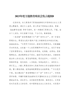 2023年度主题教育座谈会发言提纲8近段时间,本人聚焦学习贯彻XXX新时代中国特色社会主义思想主题教育,通过个人自学,深入研读了党的XX大报告、党章、《XXX著作选读》等学习材料,进一步提高了思想认识。下面,结合个人实际,和大家做个交流。不当之处,敬请指教。一是汲取革命理想高于天的信仰之力,进一步坚定理想信念。理想信念是中国共产党人的精神支柱和政治灵魂。XXXXXX指出:对党员干部来讲,是有坚定理想信念,还是满脑子功利私欲,决定着一个人的思想境界和行为举止。党员干部有了坚定理想信念,才能经得住各种考验,走得稳、走得远;没有理想信念,或者理想信念不坚定,就经不起风吹浪打,关键时刻就会私心杂念丛生,甚至临阵脱逃。现实生活中,一些党员、干部精神空虚、意志消沉、心为物役,信奉金钱至上、名利至上、享乐至上,少数人更是把党和人民赋予的权力作为谋取私利的手段,堕入腐败深渊,说到底都是理想信念动摇所致。作为党员干部,我们要汲取革命理想高于天的信仰之力,切实把深学细悟、学懂弄通做实XXX新时代中国特色社会主义思想作为首要政治任务,深化学习,自觉接受思想淬炼、精神洗礼,从而坚定对马克思主义的信仰、对中国特色社会主义的信念、对实现中华民族伟大复兴中国梦的信心。让理想信念成为心中的灯塔,感受真理的味道、汲取精神的力量,努力把学习成果转化为对远大理想和奋斗目标的清醒认知与执着追求,做XXX新时代中国特色社会主义思想的坚定信仰者和忠实实践者。二是汲取俯首甘为孺子牛的为民之力,进一步涵养为民初心。XXXXXX在党的XX大报告中指出:为民造福是立党为公、执政为民的本质要求。这一论断集中体现了马克思主义政党的人民性权力观,科学回答了我是谁、为了谁、依靠谁这个根本问题,是中国共产党性质宗旨和初心使命的时代表达。坚守为民初心,必须有真挚的情感投入。带着真诚和感情,为人民利益而奋斗,才能真正触动群众的心灵深处,与人民始终紧密相连。只有时刻与人民保持呼吸相通、命运共享、心灵相依,我们的事业才能具备最坚实的基础,无往而不胜。作为党员干部,要切实开展好群众工作,深入基层,密切联系群众,不仅要与群众面对面交流,更要与群众心连心,和群众零距离。只有这样,群众才会敞开心扉,讲述内心真实的想法。这也要求广大党员干部主动走向一线,了解民情,倾听群众的意见,特别是那些可能会令人不适的批评和建议。只有这样,我们才能认识到自身的不足把握正确的方向,才能真正办出实事,取得实效。因此,我们要始终保持对人民的深厚感情,坚守为民初心,用真诚的感情投入与人民同呼吸、共命运、心连心,共同创造美好未来。三是汲取不待扬鞭自奋蹄的拼搏之力,进一步提升业务本领。以学增智,就是要从党的科学理论中悟规律、明方向、学方法、增智慧,把看家本领、兴党本领、强国本领学到手。XXXXXX对开展主题教育提出明确要求,对以学增智作出深刻阐释。作为党员干部,我们要坚持先行一步,深入学习XXX新时代中国特色社会主义思想、XXX生态文明思想和XXXXXX重要指示批示精神等理论知识,也要掌握xxx国家公园创建、国际旅游目的地学习下、示范区建设等相关业务知识。我们必须坚持两手都要抓,两手都要硬,做到理论学习和业务工作有机融合。我们要将主题教育成果转化为实际工作中的思路举措、能力本领,并应用于工作实践。不断提高我们发现问题、解决问题的能力,以最高效率、最佳效果为目标导向。我们要勇于开拓创新,打破思维惯性和路径依赖,深入研究,总结提炼,持续提升我们的办文办会办事水平,以成为办公室工作的行家里手为目标,不断努力,不断进步。我就讲这些,谢谢。