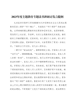 2023年度主题教育专题读书班研讨发言提纲扎实组织开展学习贯彻XXX新时代中国特色社会主义思想主题教育是衷心拥护两个确立、忠诚践行两个维护的政治检验,必须准确把握主题教育的总要求和目标任务,在深学细悟、驾信笃行上走在前、作表率,切实以主题教育的扎实成效,推动组织工作高质量发展。近段时间,本人通过个人自学,深入学习了党的XX大报告、党章等学习材料,对新思想有了更进一步的认识。下面结合工作实际,谈几点心得体会。一要守牢政治底线,旗帜鲜明定立场,拧紧选人用人的总开关。XXXXXX强调,政治标准必须放在首位,是选人用人的第一标准。作为组织部门,我们必须牢记政治属性,坚持政治标准第一,在选人用人工作中旗帜鲜明讲政治,守牢政治底线,拧紧选人用人的总开关。具体来说,我们要严格执行新形势下党的组织路线,在选人用人过程中,坚决维护党中央权威,确保党的路线方针政策和决策部署贯彻执行。我们将加强对干部政治素质和政治立场的考察,坚决按照标准和要求选人用人。要加强对两个维护的教育,督促和引导广大党员干部在思想上政治上行动上同以XXX同志为核心的党中央保持高度一致。要加强党的政治建设,不断提高广大党员干部的政治判断力、政治领悟力政治执行力,确保选人用人工作始终在正确的政治方向上推进。只有时刻绷紧政治这根弦,我们才能在选人用人工作中旗帜鲜明讲政治,坚决做到政治标准第一、政治素质过硬,以对党和人民事业高度负责的政治态度和政治觉悟,拧紧选人用人的总开关。二要突出实干准线,近观细察重实绩,立正选人用人的风向标。XXXXXX强调要突出实绩导向,近观细察,注重能力和作风结合,不断提高选人用人的科学性和准确性。作为组织部门,我们要牢记XXXXXX的殷殷嘱托,在选人用人工作中突出实绩导向,立正选人用人的风向标。具体来说,我们要优先选用实绩突出、业绩优异的干部,突出重视实干的导向。要注重考察干部的工作作风,看重他们踏实肯干、埋头苦干的精神风貌。要加强对领导干部目标责任制落实情况的检查考核,督促和引导广大干部真抓实干、埋头工作。要建立健全科学的绩效考核机制,对工作业绩突出、群众公认的干部,在选人用人中给予倾斜。只有突出实干导向,我们才能选出真正懂政治、讲政治、善政治的好干部,选出真正实干家、能人,立正选人用人的风向标。三要严明纪律红线,规范程序守制度,挥好选人用人的指挥棒。XXXXXX强调要坚持和加强党的全面领导,坚持和完善党管干部原则,坚持正确选人用人导向。作为组织部门,我们必须牢记XXXXXX的教导,严格规范选人用人程序,完善选人用人制度机制,以党纪法规作为选人用人的高压线和底线,挥好选人用人的指挥棒。具体来说,我们要严格执行干部选拔任用工作有关规定,坚决贯彻民主推荐、组织考察、公开选拔、竞争上岗的用人机制,形成选人用人的制度笼子。我们要建立健全科学规范的选人用人标准和程序,完善考核评价机制,坚决杜绝违规选人用人现象的发生。我们要加强党风廉政建设,严明组织纪律要求,确保每一名干部都能严格遵守政治纪律和政治规矩。只有严格规范选人用人程序,我们才能选出德才兼备的高素质干部队伍,确保选人用人工作的科学化、制度化。
