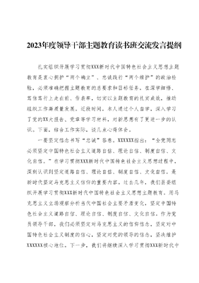 2023年度领导干部主题教育读书班交流发言提纲扎实组织开展学习贯彻XXX新时代中国特色社会主义思想主题教育是衷心拥护两个确立、忠诚践行两个维护的政治检验,必须准确把握主题教育的总要求和目标任务,在深学细悟、笃信笃行上走在前、作表率,切实以主题教育的扎实成效,推动组织工作高质量发展。近段时间,本人通过个人自学,深入学习了党的XX大报告、党章等学习材料,对新思想有了更进一步的认识。下面,结合工作实际,谈几点心得体会。一要坚定信念书写忠诚答卷。XXXXXX指出:全党同志必须坚定中国特色社会主义道路自信、理论自信、制度自信、文化自信。在学习贯彻XXX新时代中国特色社会主义思想过程中,深刻认识到坚定道路自信、理论自信、制度自信、文化自信,是新时代坚定马克思主义信仰的重要内容。过去几年,我们县委组织开展学习贯彻XXX新时代中国特色社会主义思想主题教育,用马克思主义立场观察分析当代中国社会主要矛盾变化,坚定中国特色社会主义道路自信、理论自信、制度自信、文化自信。作为党员领导干部,我们必须坚定对马克思主义的信仰信念,坚定对中国特色社会主义制度的信心,坚定对党的领导的信念,坚决维护XXXXXX核心地位。下一步,我们将继续深入学习贯彻XXX新时代中国特色社会主义思想,不断增强四个意识、坚定四个自信、做到两个维护,以实际行动践行初心使命。二要实干作为书写担当答卷。XXXXXX指出:要在推动高质量发展上下功夫。我们县委在推动高质量发展过程中,坚持以供给侧结构性改革为主线,着力打造产业集群,大力发展特色优势产业。如我们打造了XX产业园区,新引进项目30个,带动就业3万人,年产值达到100亿元。这充分彰显了我们县委推动高质量发展的实干担当。作为党员领导干部,我们必须坚持实干担当,勇于担当作为,以实际行动推动各项工作落地见效。下一步我们将继续坚持新发展理念,推动高质量发展,加快建设创新型县城,为实现两个一百年奋斗目标提供坚实动力。三要创新奋进书写素能答卷。XXXXXX指出:创新是引领发展的第一动力。我们县委高度重视科技创新在推动高质量发展中的关键作用。过去几年,我们大力实施创新驱动发展战略建立科技创新体系,深化科技体制改革,科技进步对经济发展贡献率达到60%。如我们新建了创新创业园,孵化高新技术企业80家,其中10家进入国家级高新技术企业。这充分体现了我们县委推动科技创新的积极作为。作为党员领导干部,我们必须勇于创新,敢于担当,提高科技创新能力。下一步,我们将继续深化科技体制改革,强化科技创新在经济社会发展中的关键作用,为建设创新型县城提供强大动力。