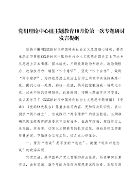 党组理论中心组主题教育10月份第一次专题研讨发言提纲坚持不懈用XXX新时代中国特色社会主义思想凝心铸魂,要在推动学习贯彻XXX新时代中国特色社会主义思想走深走实上下功夫从思想上正本清源、固本培元,不断提高政治判断力、政治领悟力、政治执行力,增强四个意识、坚定四个自信、做到两个维护,始终在思想上政治上行动上同党中央保持高度一致,做到心往一处想、劲往一处使,共同把党锻造成一块攻无不克、战无不胜的坚硬钢铁。近段时间,按照主题教育学习安排,我认真学习了《XXX新时代中国特色社会主义思想专题摘编》《党章》《党的XX大报告》等重点学习内容,更加深刻认识到,衷心拥护两个确立、忠诚践行两个维护的政治检验,必须准确把握主题教育的总要求和目标任务,在深学细悟、驾信笃行上走在前、作表率,切实以主题教育的扎实成效,推动各项工作高质量发展。下面结合工作实际,谈几点心得体会。一、看到忠诚是不变的底色,读懂筑牢对党忠诚的政治品质对党忠诚,是中国共产党人首要的政治品质。历史事实反复印证,没有忠诚,就不可能为信仰为理想虔诚而执着、至信而深厚;没有忠诚,就不可能对人民对事业情真而意切、坚定而担当党员干部当深刻认识忠诚的政治意蕴,科学把握忠诚的丰富内涵切实做到忠诚的知行合一,致力将全部心血和汗水都倾注于党和人民的事业之中。首先,用过硬理论素养彰显对党忠诚。政治上的坚定源于理论上的清醒。锤炼对党忠诚,必须加强理论学习,夯实对党忠诚的思想基础。把马克思主义理论作为必修课,时刻抓好党的创新理论学习,坚持用XXX新时代中国特色社会主义思想武装头脑,坚持读原著、学原文、悟原理,在学思用贯通、知信行统一中增强四个意识,坚定四个自信,做到两个维护,做到在任何时刻、任何情况下都要做到政治信仰不变、政治立场不移、政治方向不偏。特别是在当前,要利用主题教育契机,将学习贯彻XXX新时代中国特色思想、党的XX大精神的重大意义认识更加深刻,强读强记、常学常新,往深里走、往心里走、往实里走,自觉在全面学习、全面把握、全面落实上下真功见实效,做到思想常新、心灵常净、本色常在、信念永存。与此同时,还要加强政治历练,自觉接受严格的党内政治生活淬炼,不断提高政治三力,用崇高的思想觉悟和坚定的理想信念砥砺对党的赤诚忠心其次,用昂扬奋进姿态诠释对党忠诚。对党忠诚不是抽象的概念和符号,而是理论与实践的结合、内在与外在的统一,有着具体可感、实实在在的表现形式。我们党一路走来,经历了无数艰险和磨难,但任何困难都没有压垮我们,任何敌人都没能打倒我们靠的就是千千万万党员的忠诚奉献。因此,心中有党、对党忠诚就必须把对组织、对人民的感恩之情,转化为奉献社会、服务群众的实际行动。要始终把工作岗位作为对党忠诚的检验平台,种好、管好、守好党组织交给的责任田,大力弘扬党的优良作风,牢记民心是最大的政治,始终同人民群众想在一起、干在一起。要把对党忠诚、为党分忧、为党尽职、为民造福作为根本政治担当,勇于担苦、担难、担重、担险,用闯关夺隘披荆斩棘的勇气、挑重担啃硬骨头的姿态、逢山开路遇水架桥的干劲,努力诠释对党的忠诚。最后,用严守纪律规矩践行对党忠诚。讲规矩守纪律是对党员干部党性的重要考验,是对党员干部对党忠诚度的重要检验。党员干部无论在工作上还是生活中,必须时刻牢记自己的第一身份是共产党员,牢固树立纪律意识、规矩意识,弄清楚该做什么、不该做什么,能做什么、不能做什么,严格遵守党章党规党纪、国家法律以及党在长期实践中形成的优良传统和工作惯例,做到心中高悬法纪明镜、手中紧握法纪戒尺,切实筑牢越界、越轨的防火墙。要经常对照党章找差距、对照义务找不足、对照誓词看行动,用好批评和自我批评的武器,时常打扫思想上的尘埃、检视作风弊病、纠正行为偏差,通过不断锤炼坚强党性,把党规党纪牢牢刻印在心上,始终坚守对党忠诚的行为底线。要以彻底的自我革命精神践行忠诚,牢固树立正确的权力观、地位观、利益观,戒贪止欲、克己奉公,做到以平常之心对待苦与乐、以淡然之心对待荣与辱、以知足之心对待得与失,培养健康的生活情趣、保持高尚的精神追求,始终以忠诚干净担当的实际行动,在全面建设社会主义现代化国家新征程中奋勇争先、建功立业。二、看到人民是永恒的主题,读懂时时放心不下的人民情怀以人民为中心,践行宗旨意识为民造福。这是学习贯彻XXX新时代中国特色社会主义思想主题教育的目标之一。事业发展永无止境,人民立场永不能变,群众路线永不过时。开展主题教育重要的是引导广大党员干部把人民放在心中最高位置,自觉站稳人民立场、走好群众路线。要坚持问政于民、问需于民、问计于民,深入基层、深入群众,从群众中来,到群众中去。要把开展主题教育同推进各项业务工作结合起来,同为群众办实事解难题结合起来,以群众的满意度作为检验工作实绩
