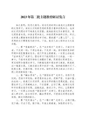 2023年第二批主题教育研讨发言知之愈明,则行之愈笃。通过近段时间以来我对主题教育的认真学习,深刻认识到新思想的真理力量和实践伟力,也深刻认识到理论学习越是扎实坚固,就越能透过历史看现实、透过现象看本质,知其言更知其义、知其然更知其所以然。所以,在开展主题教育特别是理论学习时,要把握三要三忌,让思想的光芒照亮前行的方向。下面,我谈几点心得体会与大家共勉。一、要登高眺远,忌坐井观天式学习。不谋万世者,不足谋一时;不谋全局者,不足谋一域。面对错综复杂的环境和艰巨繁重的任务,我们开展主题教育,一定要主动杜绝坐井观天式学习,理论学习不能局限在个人利益、一时一事中,不能对发展形势缺乏清醒的了解,而是要以更高层次、更远视野加强理论学习,不断强化提升理论学习高度,既能跳出一域谋全局,又能在谋全局中抓好一域,始终做到胸怀天下、统筹全局、把握形势、坚定方向,始终在思想上政治上行动上同上级保持高度一致。二、要融会贯通,忌囫囵吞枣式学习。学而不思则罔,思而不学则殆。新思想系统全面、逻辑严密、内涵丰富、内在统一,是我们认识世界、改造世界的强大思想武器。若在理论学习上只是蜻蜓点水、不求甚解、应付了事,就难以运用科学的理论指导实践、战胜挑战、推动工作。所以,主题教育学习,一定要主动杜绝囫囵吞枣式学习,要全面系统学、深入研讨学、结合实际学、融会贯通学,不提高运用理论指导实践、解决问题的能力。三、要咬定青山,忌一曝十寒式学习。业精于勤,荒于嬉;行成于思,毁于随。开展主题教育,加强理论学习,是基本要求,也是硬性任务,如果三天打鱼、两天晒网势必学无所成、业无长进,久而久之,精神之钙就会缺失,行动就会失去方向。因此,我们要主动杜绝一曝十寒式学习,把理论学习作为一种自觉习惯和永恒追求,坚持不懈学、持之以恒学、如饥似渴学,常学常新、常思常悟、常修常练,确保信仰之基有没有动摇、思想之舵有没有偏航、精神之钙有没有缺失,真正做到从理论学习中汲取精神营养和行动力量。