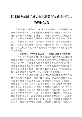 区委编办的班子成员在主题教育专题读书班上的研讨发言在党的XX大报告中XXXXXX明确指出:继续推进实践基础上的理论创新,首先要把握好新时代中国特色社会主义思想的世界观和方法论,坚持好、运用好贯穿其中的立场观点方法。通过学原著读原文悟原理,我认识到:必须坚持人民至上,必须坚持自信自立,必须坚持守正创新,必须坚持问题导向,必须坚持系统观念,必须坚持胸怀天下,这六个必须坚持就是XXX新时代中国特色社会主义思想的世界观和方法论的集中反映。一、深刻领会六个必须坚持,做到知其然更知所以然(一)六个必须坚持是中国共产党百年历程宝贵经验的深刻总结。党的百年奋斗成功道路是党领导人民独立自主探索开辟出来的,马克思主义的中国篇章是中国共产党人依靠自身力量实践出来的,贯穿其中的一个基本点就是中国的问题必须从中国基本国情出发,由中国人自己来解答。六个必须坚持正是源自我们党100多年奋斗历程的历史经验。(二)六个必须坚持是以中国式现代化推进中华民族伟大复兴的行动指南。党的XX大指出,中国共产党的中心任务就是团结带领全国各族人民全面建成社会主义现代化强国、实现第二个百年奋斗目标,以中国式现代化全面推进中华民族伟大复兴。中国式现代化是人口规模巨大的现代化全体人民共同富裕的现代化既有各国现代化的共同特征,更有基于国情的中国特色,这一系列重要论述都说明,唯有聚焦实践遇到的新问题、改革发展稳定存在的深层次问题、人民群众急难愁盼问题、国际变局中的重大问题、党的建设面临的突出问题,作出符合中国实际和时代要求的正确回答,形成与时俱进的理论成果,才能更好指导中国的现代化实践。(三)六个必须坚持是提高党的领导水平和执政水平的重要保证。中国共产党领导是中国特色社会主义最本质的特征,是中国特色社会主义制度最大优势。办好中国的事,关键在党。面对我们所从事的前无古人的伟大事业,需要我们党不断解决百年大党独有难题,不断提高执政能力和领导水平,不断提高驾驭复杂局面能力,定准向、掌好舵,确保中国特色社会主义胜利驶向伟大梦想的光辉彼岸。二、深刻领会六个必须坚持,做到知其然更明其义(一)坚守六个必须坚持所蕴含的人民立场。我们党是为中国人民谋幸福、为中华民族谋复兴的党,也是为人类谋进步、为世界谋大同的党,党的理论来自人民、为了人民、造福人民。党的根基在人民、血脉在人民、力量在人民,人民是党执政兴国的最大底气;党的最大政治优势是密切联系群众,党执政后的最大危险是脱离群众;江山就是人民、人民就是江山,打江山守江山,守的是人民的心,等等,这些重要论述,是党性与人民性相统一的集中体现、是我们党的成功密码、是新时代中国特色社会主义的核心理念。(二)把握六个必须坚持所明确的基本观点。XXX新时代中国特色社会主义思想不仅讲明了是什么这一世界观问题,也阐述了怎么办这一方法论问题,生动体现了马克思主义世界观和方法论的统一。必须坚持人民至上,是新思想的价值立场;必须坚持自信自立,是新思想的精神特质;必须坚持守正创新,是新思想的理论品格;必须坚持问题导向,是新思想的鲜明风格;必须坚持系统观念,是新思想的基本思想方法和工作方法;必须坚持胸怀天下,展现了我们党大道之行、天下为公的宽广格局。(三)用好六个必须坚持所强调的科学方法。世界观侧重怎么想,方法论决定怎么做,二者统一于人的实践。XXX新时代中国特色社会主义思想之所以具有强大的真理力量和实践伟力,就在于始终坚持马克思主义世界观和方法论,一以贯之地强调辩证唯物主义和历史唯物主义。在新时代,我们要赢得优势、赢得主动、赢得未来,就必须坚持马克思主义的实践观、群众观、阶级观、发展观、矛盾观,不断提高运用马克思主义分析和解决问题的能力。三、深刻领会六个必须坚持,做到明其义更见于行(一)以追本溯源的精神明初心。不要忘记我们为什么出发。中国共产党人的初心和使命,就是为中国人民谋幸福,为中华民族谋复兴。在革命最艰难的时期,共产党人的初心化作不惜牺牲一切的精神,这精神所释放出来的磅礴力量,使中国共产党在血与火的交织中奔出一条浴火重生的革命新路。不要忘记自己入党时的庄严承诺。共产党人的初心就是入党时那80字的铮铮誓言,入党誓词第一条就是我志愿加入中国共产党,我对这句话的理解就是既然是自己自觉自愿申请加入的,作为一名党员就应下定决心为人民服好务,为共产主义事业奋斗终生。(二)要以志存高远的胸怀坚定理想信念。对马克思主义的信仰,对社会主义和共产主义的信念,是共产党人的政治灵魂,是共产党人经受住各种考验的精神支柱。只有理想信念坚定的人,才能始终不渝、百折不挠,不论风吹雨打,不怕千难万险,坚定不移为实现既定目标而奋斗。要向毛泽东、周恩来等老一辈无产阶级革命家学习,学习他们理想信念高于天的革命斗争精神,学习他