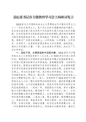 县纪委书记在主题教育学习会上的研讨发言XXX新时代中国特色社会主义思想是当代中国马克思主义、二十一世纪马克思主义,是中华文化和中国精神的时代精华,是全党全国各族人民为实现中华民族伟大复兴而奋斗的行动指南。区纪委监委作为党的政治机关和纪律部队,要好肩负起新时代新征程党的使命任务,在贯彻落实学思想、强党性、重实践、建新功总要求的道路上,以学铸魂、以学增智、以学正风、以学促干,把党的创新理论转化为坚定理想、锤炼党性、推动工作的强大力量。下面,结合自身工作实际,浅谈以下几点认识体会。一、深化于学,从思想宝库中汲取力量。XXX新时代中国特色社会主义思想是党的十八大以来,以XXX同志为核心的党中央,根据国内外形势的变化和我国各项事业发展的新情况,以及我们党面临的新任务和新挑战,坚持解放思想、与时俱进、求真务实,紧密结合新的时代条件和实践要求,以全新的视野进行艰辛的理论探索而取得的重大理论创新成果。在新时代新征程上,作为纪检监察干部,我们更应率先垂范,苦练内功,自觉做讲政治、勇担当、强本领、守底线的新时代纪检监察人,结合主题教育活动,统一、深入、系统的学习XXX新时代中国特色社会主义这一强化创新理论的经验宝库、推动高质量发展的指导思想,从中汲取智慧营养,提高运用科学理论指导应对风险挑战的能力。一是统一学。要把理论与实践、部分与整体、国内与国外融合起来,做到熔于一炉、同向发力,统一、立体、多维的理解主要内容和精髓要义,全面系统把握这一思想的精神实质和理论精髓。二是深入学。要在读原著、悟原理的基础上,带着目标学,带着责任学、带着问题学、深入领会原创性思想、变革性实践、突破性进展、标志性成果等重要内容,进一步把握精神实质和实践伟力,将其转化为指导实践、推动工作、破解难题的强大力量。三是融合学。要把主题教育学习活动与正在开展的纪检监察干部教育整顿结合起来,多点深度思考、多点系统谋划,切实把主题教育、教育整顿成果转化为推动纪检监察工作高质量发展的强大动力,转化为坚定不移正风肃纪反腐的实际成效,以纪检监察工作质效检验主题教育、教育整顿成效。二、内化于心,夯实对党忠诚的坚实基础。在学习贯彻XXX新时代中国特色社会主义思想主题教育工作会议上,XXXXXX发表的重要讲话,围绕学思用贯通、知信行统一的根本任务,深刻阐述开展主题教育的目标要求,强调要教育引导广大党员、干部锤炼政治品格,以党的旗帜为旗帜、以党的意志为意志、以党的使命为使命,始终忠诚于党、忠诚于人民、忠诚于马克思主义,真心爱党、时刻忧党、坚定护党、全力兴党。对党忠诚是党的性质宗旨的根本体现,也是纪检监察干部鲜明的政治品格。忠诚是对纪检监察干部第一位的要求,这是纪检监察机关的光荣传统,更是纪检监察工作性质所决定的。但是对党忠诚并不是天生的,是需要长期修炼的XXXXXX常讲,理想信念坚定才能对党忠诚,形成坚定理想信念是要在斗争实践中不断砥砺、经受考验,而且这种考验是长期的,很多时候也是严酷的,是要终其一生的。作为一名长期从事纪检监察工作的党员干部,我参加了多次党的教育活动,深感总会有新的课题新的困惑摆在面前,这就需要我们从马克思主义基本原理、党章党规党纪,特别是在党的创新理论最新成果和鲜活的实践中去探寻答案、明辨是非、统一思想。只有将坚定理想信念作为终身课题,活到老、学到老、改造到老,才能始终保持头脑清醒;立场坚定,才能稳得住心神、扛得住歪理、顶得住诱惑、经得起考验。 三、外化于行,把理论武装成效转化为推动工作的强大动力。持续深化接受革命性锻造的认识,自觉在精神上接受洗礼,锚定凝心铸魂筑牢根本、锤炼品格强化忠诚、实干担当、促进发展、廉洁奉公树立新风的目标,进一步夯实思想基础,主动在深学细悟中经受思想淬炼、精神洗礼,明确角色定位,找准服务大局的接口。作为纪检监察干部,做到对党忠诚,体现在工作上,就是要心怀国之大者,把握好职责的定位,扮演好自己的角色,通过履行好监督执纪问责职责,保证党的路线方针政策得到贯彻落实,保证全区党员干部干净干事。这就需要找准监督服务的重点内容和方式方法,提高监督质效。围绕区委区政府确定的重点工程项目,组建工作专班,强化监督保障,靶向纠治重点项目落地中存在的顽瘴痼疾,形成调研摸底、主动约谈、统筹研判、督促整改、跟进反馈的监督闭环,倒逼主责单位扛牢责任、加压发力,服务保障重点项目尽快落地见效。围绕发展战略,强化政治监督,在突出重点的同时,监督的方式方法又因事因时制宜,使监督工作的着力点更贴近区委中心工作、符合实际,纪检监察服务大局的接口更为精准有效。 不断增强政治判断力、政治领悟力、政治执行力,做到始终以党的旗帜为旗帜、以党的意志为意志、以党的使命为使命,心往一处想、劲往一处使,立足职责使命,聚焦发展所面对的形势任务,坚持多思多想、深学细悟,不断提高运用党的创新