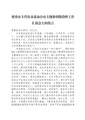 督查室主任在市委办公室主题教育阶段性工作汇报会上的发言尊敬的各位领导,同志们:市委督查室坚持以学铸魂、以学增智、以学正风、以学促干,扎实履行抓落实基本职能,强化统筹协调、改进督查作风、优化督查方式,切实把主题教育成效转化为提高督查能力和水平的成果,转化为促落实的实践和行动。根据会议,现将有关工作进展情况汇报如下:把准政治方向,以实际行动践行两个维护。紧盯党的XX大精神贯彻落实抓督查。把推动党的XX大精神贯彻落实作为重要政治任务,纳入督查工作重点,精心组织实施。服务市委出台《中共市委关于深入学习贯彻党的XX大精神奋力开创新时代社会主义现代化建设新局面的决定》,提出三年上台阶、八年大发展、十五年大跨越的战略发展目标,部署实施脱贫群众增收、教育高质量发展、国企改革等系列三年行动,全力推动党的XX大精神贯彻落实。对《决定》进行任务分解,细化形成重点工作任务清单,逐一明确牵头单位、责任单位、具体目标等,台账式、清单式跟踪督办;先后开展多次专项督查,推动全市各地区各部门抓实抓细贯彻落实工作。紧盯党中央重大决策部署抓督查。把督查的主要战场、主要精力放在推动党中央决策部署落地上,始终做到党中央决策部署到哪里,督查就跟进到哪里。市委整合纪检监察、新闻宣传、督查审计等力量,推动党中央重要战略部署、重大改革举措、重点支持政策加快落地。市委办公室出台《关于推动党中央和市委重大部署要求贯彻落实的具体措施》,围绕办理时限、责任主体、工作流程、反馈要求等提出具体措施,不断提高落实的质效。紧盯XXXXXX重要指示批示要求抓督查。把学习贯彻XXXXXX重要指示批示精神列为市委常委会会议第一议题,作为市委理论学习中心组学习的重要内容,深学细悟、时时对标,自觉在思想上政治上行动上同以XXX同志为核心的党中央保持高度一致。市委办公室明确职责、规范程序,形成了专人负责分类交办、细化台账跟进督查、严格时限反馈报告、严把质效定期汇总的工作闭环;对XXXXXX两次考察云南重要讲话精神重点任务进行系统梳理,进一步细化为具体要求,持续跟踪落实情况,组织开展多次实地督查,推动民族团结进步示范区、生态文明建设排头兵、面向南亚东南亚辐射中心建设取得新成效。健全完善机制,着力提升督查工作制度化规范化水平。完善全链条督办落实机制。完善领导批示件闭环办理机制,进一步细化工作流程,严格接收登记、传达学习、督办落实、报告情况等办理程序及要求,明确每个环节的责任主体、工作内容,确保件件有着落、事事有回音。对党中央决策部署及市委工作安排,形成分解立项、建立台账、落实责任、明确时限、动态跟踪、定期报告、现场核查、销号归档的全链条督办机制。建立常态跟踪调度机制。建立重点督办事项台账,根据紧急程度和时间顺序合理确定督办节奏,实行按月跟踪进展、季度统筹调度、半年开展一次回头看,做到清单式推进、常态化跟踪、精细化管理,督促各责任单位定期对账、按时交账;同时,及时预警提醒、约谈通报落实情况不理想的地区和部门。对市委常委会会议、市委专题会议议定事项,建立按月研判分析、重点跟踪调度的工作机制,每月向市委报告落实进展,及时对进度滞后事项进行重点督办。健全联合联动督查机制。构建市委办公室牵头协调、市级部门分工负责、各有关方面积极参与的党委督查工作格局。整合市委、市政府督查力量,建立联合督查机制,共同组织开展具有全局意义的重大督查,有效避免多头重复督查。在专业性较强的督查中,与发展改革、民族宗教、商务、工信等部门建立联动督查机制,积极借外力、引外援、用外脑,深督细查提高督查工作质效。优化方式方法,切实发挥督查推动落实的作用。大力推行项目工作法。坚持任务项目化、项目清单化、清单具体化,对每一项督查任务都制定工作清单,明确责任单位、完成时限、工作标准,安排专人跟踪督办;重要工作任务成立工作专班,项目化推动落实。比如,针对中央环保督察指出的问题,成立常态化督查工作专班,每年对重点责任单位开展两轮现场督查,每次督查均形成问题清单、任务清单、责任清单,并进行再交办,有力推动问题整改。大力推行一线工作法。坚持在一线督、在一线查、在一线帮,既督进度、查问题,又提效能、解难题,督帮并举推动工作落地落实。围绕就业、教育、医疗、住房等方面存在的问题,采用四不两直方式深入一线,开展暗访式、蹲点式、解剖麻雀式督查,盯过程、盯成效、盯反馈,着力解决基层和群众的揪心事、烦心事、操心事。比如,围绕打造无事不扰、有呼必应的营商环境,会同市工商联等深入上百家企业,在生产经营一线明察暗访,了解企业反映强烈的痛点堵点,推动出台涉企督查检查考核事项清单,压减、整合涉企督查检查考核事项,切实减轻企业迎检负担。大力推行典型引路法。注重通过正面引领、反面警示,使各地区各部门学有方向、做有榜样,形成以点带面、互学共进、比学赶超