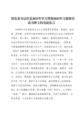 镇党委书记在县2023年学习贯彻2023年主题教育读书班上的交流发言XXX新时代中国特色社会主义思想贯穿新思想、新理念、新战略、新举措,全面学习领会XXX新时代中国特色社会主义思想的科学体系、核心要义、实践要求,掌握这一重要思想的世界观、方法论和贯穿其中的立场观点方法,要做到整体把握、一体贯通,不断提高履职尽责的能力和水平。我将结合自身工作,紧扣全县XXXX战略思路,团结带领全镇广大干部群众,精准施策、狠抓落实、奋力担当,从以下几个方面全力抓好贯彻落实。补短板夯基础,促进产业结构全优化。以十查十纠行动为抓手,对标对表国省考核评估重点内容,进行地毯式摸排,梳理汇总、建立台账、精准整改落实,着力补短板、强弱项、治硬伤,以过硬的工作质量迎接国省后评估考核;按照建基地、强龙头、延链条、聚集群,做大做优做强特色产业思路,着力打造红河川区双千亩蔬菜产业示范基地,扶持种植冬小麦XXXX亩,新建日光温室XXXX座,钢架大棚XXX座、XXXX育苗连栋温室㎡XX座X,深入挖掘镇土资源,着力扮靓XXXXX名片,大力推行旅游+模式,推进镇村旅游提档升级,促进产业规模化、全链条发展,全力抓好产业突破提升这篇文章。出重拳治违乱,促进城市更新精细化。聚焦城市更新十大行动42项重点任务,出重拳、下狠手、快节奏、大力度解决XXX乱象突出问题,强化宣传引导,努力营造你追我赶、互比互促的浓厚工作氛围,助力群众争创星级文明户最美家庭,引导全民共建、共治、共享清洁环境;紧盯门前三堆残垣断壁、危旧塌房等重点乱象,坚持问题不整改不放手,群众不满意不松劲,效果不明显不放过;扎实开展车辆乱停、乱搭乱建、广告乱飞等专项整治活动,推动镇村面貌整体大提升、大改观、大变样,促进城市更新行动精细化走深走实,提升群众对高质量发展和高品质生活的认同感、归属感、幸福感。聚合力送温暖,促进关爱服务常态化。持续深化我为群众办实事实践活动,以强烈的责任感使命感,聚焦三留一困特殊群体,动员一切力量,心用心用情,解忧暖心、精准帮扶。树牢常怀民忧、温暖一方群众的情怀,引导党员干部为群众办好事、办实事、解难题,拉近特殊困难群众与党组织的距离,把党组织的温暖和关怀送到特殊困难群众的心坎,增强战胜困难的勇气和决心,增强党组织的号召力、凝聚力和向心力。下一步,我将深入学习贯彻好XXX新时代中国特色社会主义思想主题教育精神内涵,切实增强忧患意识和责任意识,化机遇为优势,变压力为动力,牢牢把握全县实施XXX计划的发展机遇主动适应经济发展新常态,着力强产业、夯基础、增动能、优环境,加快建设山清水秀幸福美好新XXX步伐。