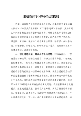 主题教育学习研讨发言提纲近期,通过院内组织学习及本人自学,认真学习了《党的XX大报告》《中国共产党章程》《XXX著作选读》等内容,更加深刻认识到新思想的真理力量和实践伟力,理解了聚焦学习贯彻XXX新时代中国特色社会主义思想主题教育,应严格按照学思想、强党性、重实践、建新功的总要求读原著、悟原理,在以学铸魂、以学增智、以学正风、以学促干上下功夫,现结合本职工作及自身实际,谈谈如下感悟。一、强化理论武装,解决会不会的问题。XXXXXX指出:理论是行动的先导,理论上清楚了,行动上才能有力量。理论武装的重要性,不仅仅在于掌握思想方法和工作方法,更在于形成科学的世界观和方法论。回顾党史,我们深刻认识到马克思主义理论的指引是党战胜一切困难的根本保证,正是在理论的启迪下开国先辈们找到了中国革命的正确道路。结合新时代中国特色社会主义思想,我们所在地方曾经面临经济发展滞后的问题。通过深入学习XXX新时代中国特色社会主义思想,我们重新审视了发展模式,注重高质量发展,推动了产业升级,实现了经济的稳步增长。数据显示,过去五年,当地GDP年均增速保持在7%以上,产业结构不断优化。下一步,我们要不断提升自身的理论素养,将XXX新时代中国特色社会主义思想转化为推动工作的强大力量。在日常工作中,坚持理论与实践相结合,不断提高解决实际问题的能力,以理论的力量指导实践,推动各项事业发展。二、强化大局观念,解决肯不肯的问题。只有增强大局意识、服从服务大局,我们党才能团结带领人民应对各种风险挑战不断从胜利走向新的胜利。XXXXXX的这番话强调了大局观念的重要性。历史和现实都告诉我们,只有站在全局的高度思考问题才能在复杂多变的国内外环境中准确把握形势,作出正确决策。例如,在推动生态文明建设方面,我们坚持绿色发展理念,在全局的高度出发,拒绝了短期内经济利益巨大但对环境破坏严重的项目,转而投资于清洁能源和循环经济。数据显示,该举措不仅提升了地区环境质量,而且带动了新能源产业的发展,三年内新增就业岗位数千个。未来,我们要继续强化大局观念,从国家和民族的整体利益出发,进行决策与行动。下一步,我们要深入贯彻落实XXXXXX的重要指示精神,坚守绿色发展理念,维护生态环境,同时促进经济社会全面协调可持续发展。三、提升履职能力,解决能不能的问题。提高党的建设质量,要求党员领导干部特别是高级干部要有过硬的本领。XXXXXX的话明确指出了提升履职能力的必要性。在快速变化的时代背景下,领导干部要不断学习新知识、掌握新技能,以适应新形势下的履职要求。在我们的实践中,通过深入学习和实践,创新了城市管理模式,实施智慧城市建设工程,提升了城市管理的智能化、信息化水平。通过数据分析,智慧城市项目上线后,公共服务效率提升30%,市民满意度明显提升。面向未来,提升履职能力是党员领导干部的当务之急。下一步,我们要坚持不懈地加强自我学习,掌握先进的科技知识和管理能力,不断提升决策水平和执行力,以适应新时代的要求,更好地服务人民、服务发展、服务大局。