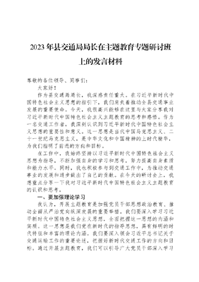 2023年县交通局局长在主题教育专题研讨班上的发言材料尊敬的各位领导、同事们:大家好!作为县交通局局长,我深感责任重大。在习近平新时代中国特色社会主义思想的指引下,我们肩负着推动全县交通事业发展的重要使命。今天,我很高兴能够在这里与大家分享我对习近平新时代中国特色社会主义主题教育的思考和感悟。作为一名交通工作者,我深刻认识到习近平新时代中国特色社会主义思想的重要性和意义。这一思想是当代中国马克思主义、二十一世纪马克思主义,是中华文化和中国精神的上时代精华,为我们指明了前进的方向和目标。在工作中,我始终坚持以习近平新时代中国特色社会主义思想为指导,不断加强自身的学习和思考,努力提高自身素质和能力水平。同时,我也积极参与到交通工作中,为推动交通事业的发展和进步做出了自己的贡献。在今天的研讨会上,我想重点分享一下我对习近平新时代中国特色社会主义主题教育的认识和思考。一、要加强理论学习我认为,开展主题教育是加强党员干部思想政治教育、推动全面从严治党向纵深发展的重要举措。我们要深入学习习近平新时代中国特色社会主义思想,全面把握这一思想的内涵和实质。这一思想是我们党在新时代的指导思想,具有鲜明的时代特征和丰富的理论内涵。我们要深入领会习近平总书记关于交通运输工作的重要论述,把握好新时代交通工作的方向和目标。通过开展主题教育,我们可以引导广大党员干部深入学习贯彻习近平新时代中国特色社会主义思想,增强四个意识,坚定四个自信,做到两个维护,切实把思想和行动统一到党中央的决策部署上来。二、要注重践行工作我们要结合本单位的实际情况,将习近平新时代中国特色社会主义思想贯彻到具体工作中。作为交通部门,我们要紧紧围绕全县经济社会发展大局,以推进交通基础设施建设、提升交通运输服务水平为重点,积极探索创新,推动交通事业实现高质量发展。在实践中,我们要注重以下几个方面:一是加强交通基础设施建设。加大投入力度,加快推进公路、桥梁、隧道等基础设施建设,提高交通网络的通达性和便捷性。二是优化交通运输服务。积极发展农村客运、城市公共交通等多样化运输方式,满足人民群众的出行需求。三是加强行业管理。深化交通运输行业改革,推动行业转型升级,提高交通运输安全和环保水平。三、要增强宗旨服务开展主题教育也是推进交通事业发展的必然要求,我们要始终坚持问题导向和目标导向,以解决问题为目标,以实现目标为导向,不断推动主题教育取得实效。交通是经济社会发展的基础和保障,我们也需要不断总结经验,不断完善工作机制和方法,推动主题教育不断向纵深发展,始终坚持做到以人民为中心的发展思想,不断提高自身素质和能力水平,为人民群众提供更加安全、便捷、高效的交通服务。四、要发挥党员作用此外,我们还要注重发挥党员领导干部的表率作用。党员领导干部是交通事业发展的中坚力量,要始终保持良好的政治素质和工作作风。要以身作则、率先垂范,带领广大干部职工共同推进交通事业发展。我们要加强宣传教育,让广大干部群众深入了解和掌握习近平新时代中国特色社会主义思想。通过开展宣传教育活动、举办培训班等方式,让广大干部群众深入领会这一思想的精神实质和实践要求,为推动交通事业发展提供强大的思想武器和行动指南。总之,习近平新时代中国特色社会主义思想是我们基层交通工作者的行动指南和思想武器。我们需要不断加强自身的学习和思考,以实际行动践行这一思想,为推动交通事业的发展和进步做出自己的贡献。作为县交通局局长,我将始终坚持以习近平新时代中国特色社会主义思想为指导,带领全局干部职工共同努力,为实现中华民族伟大复兴的中国梦贡献自己的力量。谢谢大家!