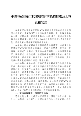 市委书记在第二批主题教育阶段性推进会上的汇报发言在全党深入开展学习贯彻XXX新时代中国特色社会主义思想主题教育,是党的XX大作出的重大部署,是一件事关全局的大事。按照中央、省委部署要求,9月15日,我市全面启动第二批主题教育。两个月来,1095个基层党组织,2.6万名党员,正经受着一场全面深刻的教育洗礼。在省委主题教育第四巡回督导组有力指导下,市委深入学习贯彻XXXXXX重要讲话精神,把准学思想、强党性、重实践、建新功总要求,紧密结合我市实际,一体推进理论学习、调查研究、推动发展、检视整改等关键环节落实,着力在以学铸魂、以学增智、以学正风、以学促干上取得实效,为推进我市高质量发展凝心铸魂、增势赋能。初心如磐,使命在肩。市委把开展主题教育作为重大政治任务,摆在突出位置,成立由市委书记任组长的市委主题教育领导小组,认真履行主体责任,推动主题教育高起点谋划、高标准推进、高质量开展;组建5个联络小组开展联络服务和指导工作,截至日前,先后召开2次培训会,组织2次下沉督导分类分域联系指导各基层党组织开展主题教育。市委多次召开常委会会议、领导小组会、推进会等,传达学习XXXXXX重要讲话精神,研究部署主题教育工作,确保高站位对标。精心制定市主题教育《工作方案》,分类制定7个领域《具体措施》,形成1+7分类指导机制,进行系统性谋划。一、坚持真学实悟,感悟思想伟力思想就是力量。文昌坚持以学固本,围绕为什么学、学什么、如何学、怎么做,把理论学习作为主题教育第一位任务和贯穿始终的主线,坚持系统学与重点学相结合,不断增进广大党员对党的创新理论的政治认同、思想认同、理论认同、情感认同。当前,一场场富有特色的理论学习活动在我市蔚然成风。(一)突出关键少数带领学。市委先后举办2期读书班,认真学习XXXXXX最新重要讲话和重要指示批示精神。在市级领导干部示范带动下,各级党组织认真开展理论学习,领导班子成员纷纷走上讲台,领学促学、谈收获体会、讲专题党课。(二)紧扣原文原著系统学。全市党(总)支部书记发挥第一责任人作用,组织党员干部结合实际制定学习计划,依托三会一课、主题党日等,集中精力通读精读规定学习资料。市委主题教育领导小组办公室精心梳理XXXXXX关于主题教育最新讲话精神、重要指示批示精神,以印发文件通知、微信群发布提醒的方式引导党员干部跟进学;指导各基层党组织认真梳理XXXXXX关于本部门本行业本领域工作的重要论述,抓实重点内容学习。9月份以来,全市基层党组织累计开展集中学习8700次。(三)丰富形式全面学。线上,灵活打造简便、高效的指尖型学习阵地。在复兴壹号智慧党建平台上开设主题教育专区,设置思想体系重要精神榜样事迹学习汇编等四个学习模块,让党员可以通过手机移动端随时随地开展线上学习。同时,发动全市各级党组织利用智慧党建平台活动专区党建圈等功能,及时发布学习活动动态信息和开展主题教育的好经验好做法,为推动主题教育取得实效注入新动力。截至目前,共发布主题教育学习资讯318条,活动信息623条。线下,全市推广运用三学联动机制,累计217名机关党员走进社区送学346场,5000余名年轻党员在主题教育中发挥示范带学作用,160余名乡镇党员领导干部正深入走进联系点村、社区,督促指导抓好理论学习。既有坐下来的集中读书,也有走出去的送学、研学、联学。市政府办党支部组织年轻党员干部开展送学上门传党声,助力学习全覆盖活动,为市政府退休党支部部分党员送去《XXX新时代中国特色社会主义思想专题摘编》等主题教育相关书籍,并为退休老党员认真讲解书中内容、详细介绍市委主题教育领导小组关于开展主题教育的部署要求;市旅文局、市农业农村局、东郊镇等单位组织党员就近就便前往文昌党史馆、张云逸纪念馆开展体验教育。同时,各单位积极以党建联盟为载体,深入开展联学活动,进一步推动理论学习全面深入开展。二、坚持真调实研,扎实破解难题在主题教育中,市强化以研开路,坚持真调查和实研究并重,以求真务实作风解决新问题,下大功夫摸清实情、拿出实策。(一)聚焦发展科学定题。紧扣高质量发展首要任务,市领导带头领题调研,结合自身分管领域及重点工作,共梳理形成深入梳理冯家湾污染治理催生养殖绿色转型的有效作法和有益经验,探索推动文昌海洋渔业转型升级的实践路径海南自贸港背景下文昌椰子全产业链优化发展路径探究等42项重点调研课题,排查制约文昌高质量发展问题共73个;各单位各部门领导干部结合本单位本领域实际,学习运用四下基层工作经验,深入一线多角度开展调研;基层党员注重结合党员到社区报到、乡村振兴工作队员进村入户等活动深入群众,梳理发现问题516个,研究解决327个。(二)多种形式精准破题。全市领导干部采取四不两直方