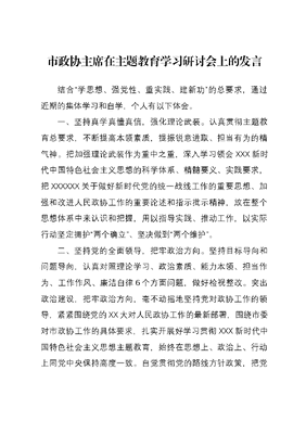市政协主席在主题教育学习研讨会上的发言结合学思想、强党性、重实践、建新功的总要求,通过近期的集体学习和自学,个人有以下体会。一、坚持真学真懂真信,强化理论武装。认真贯彻主题教育总要求,不断提高本领素质,提振锐意进取、担当有为的精气神。把加强理论武装作为重中之重,深入学习领会XXX新时代中国特色社会主义思想的科学体系、精髓要义、实践要求,把XXXXXX关于做好新时代党的统一战线工作的重要思想、加强和改进人民政协工作的重要论述和指示批示精神,放在整个思想体系中来认识和把握,用以指导实践、推动工作,以实际行动坚定拥护两个确立、坚决做到两个维护。二、坚持党的全面领导,把牢政治方向。坚持目标导向和问题导向,认真对照理论学习、政治素质、能力本领、担当作为、工作作风、廉洁自律6个方面问题,做好检视整改。突出政治建设,把牢政治方向,毫不动摇地坚持党对政协工作的领导,紧紧围绕党的XX大对人民政协工作的最新部署,围绕市委对市政协工作的具体要求,扎实开展好学习贯彻XXX新时代中国特色社会主义思想主题教育,始终在思想上、政治上、行动上同党中央保持高度一致。自觉贯彻党的路线方针政策,把党的主张通过民主程序转化为各方面的共同意志,引导广大委员和界别群众进一步筑牢团结奋斗的思想根基,担负起新时代人民政协的新使命。三、坚持学思用贯通,提升履职水平。努力把XXX新时代中国特色社会主义思想转化为坚定理想、锤炼党性和指导实践、推动工作的强大力量。要在服务高质量发展上贡献政协智慧和力量。按照大兴调查研究工作方案和市委具体要求,紧紧围绕全面贯彻落实党的XX大精神,助力我市锚定两个确保,实施十大战略、百条举措,统筹发展和安全,奋力推动高质量发展。要在建言资政和凝聚共识上双向发力。进一步团结合作,发挥人民政协联系群众广泛、各方人才荟萃的特色和优势,将委员中蕴藏的强大智慧力量激发出来。要在两支队伍建设上提质增效。加强委员学习培训,深化细化委员管理和服务;从严管理、从严要求机关干部,增强使命责任意识和担当进取精神,努力打造适应新时代要求的委员队伍和机关队伍。