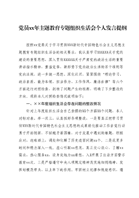 党员xx年主题教育专题组织生活会个人发言提纲按照xx党委关于学习贯彻XXX新时代中国特色社会主义思想主题教育专题组织生活会的相关要求,我认真学习XXXXXX关于党的建设的重要思想,深入贯彻XXXXXX关于严肃党内政治生活的重要讲话指示精神,重温党章、新形势下党内政治生活的若干准则等党内法规,进一步统一思想、深化认识,紧紧围绕理论学习、政治素质、能力本领、担当作为、工作作风、廉洁自律等六个方面进行对照检查,剖析了问题产生的根源,明确了下步整改的方向。现将本人对照检查情况说明如下:一、××年度组织生活会存在问题的整改情况针对上年度组织生活会自己查摆的XX个方面XX个问题,本人对标对表、举一反三,认真抓好各项整改,一是要真正把学习贯彻XXX新时代中国特色社会主义思想的成果转化推动工作自觉行动勇于开拓创新,不回避矛盾困难,对于发展中遇到的难题,积极应对,迎难而上,调处和化解了历史遗留问题xx个。二是花更多时间和精力深入一线。虚心听取xx意见,真正交心谈心,了解xx需求,热心服务xx,设身处地为xx着想,入X开展了法治方面警示教育xx次。三是严格遵守中央八项规定精神及实施细则精神,发挥好模范带头、以上率下的作用。牢固树立纪律和规矩意识,遵从纪律和规矩,不违纪,不越轨,在所挂X以违纪典型案例开展了XX次常规教育,保持警钟长鸣,防微杜渐。需要说明的是,特别是在学习和担当方面,还进一步巩固整改并长期坚持。目前除需长期坚持以外,全部立行立改。二、对照检查存在的突出问题(一)在理论学习方面。一是理论学习不全面具体深入自从xx后,学习有所松懈,放松自我,主动学习少。×:在每次集中学习中,都是领学领导带头组织学什么就跟着记什么,没有真正结合自己所从事的xx业务紧密联系思想和工作实际,认真把学习贯彻XXX新时代中国特色社会主义思想不断地引向深入。二是理解上存在偏差。对两个确立的决定性意义学习不够深入全面,掌握不够透彻,运用不够熟练。在做xx工作时,特别人多的情况下容易激动,沉不住气。有时说的一些话不符合党员身份,×,面对xx,做了几次解释工作都做不通,不会换位思考和设身处地想一想,做事情站在自身角度考虑多。(二)在政治素质方面。一是谋划工作的政治站位不高作为xx安排到xx的挂联系点X领导,在工作业务上说得多做得少,特别是党建工作,认为是xx的事。×,与自己没有很×系,导致在X级党建有些资料中存在低级错误,没有很好地亲自过问,亲自把关。二是政治大局观有淡化。作为一名xx,应把全xx的安全稳定放在第一位,有安全稳定的环境才有好的营商条件,有时感到工作压力大,思考工作有差距。×:各xx在矛盾纠纷隐患排查上报上来基本是无,自己在指导工作时,没有真正沉下去督查,去指导,问题排查上方法不多。(三)在能力本领方面。一是真抓实干的本领不强。总以XX内小矛盾多,工作任务重,问题没有很好地分轻重缓急,没有很好地分难易程度,什么都想一下去解决但什么都解决不了,缺乏真抓实干精神。×:自己总认为XX就两个人,人手少,工作量大,什么急就做什么,容易解决的先解决,难度大的放一放,上级追了再抓一抓,以务实的作风和创新的精神开展工作做得还不够,个别纠纷时间长了也解决不了。二是推动主责主业再创新成绩的能力不足。对XX的法律法规和警示教育不经常,针对性还不强。×:面对XX的法治宣传教育不到位,容易造成极少数问题XX在没有监护人的情况下,容易走极端,给社会造成危害,给他人造成伤害。(四)在担当作为方面。一是主动处理矛盾上怕乱求稳多。面对急难矛盾,在处理过程中不敢大胆表态,不敢拿主意,凡事都要请示主要领导。×:在xx出行不便,有xx人左右xx在XX,自己到现场去拿不定主意,干抗着,结果还得主要领导出面时,才拿出办法来解决。二是在分管工作谋划上没有前瞻性。工作上一直以上级安排和主要领导安排在去落实,没有很好地主动去谋划自己岗位职责范围内的事,遇事凭经验,以老办法去解决多。×:在党的XX大提出建设法治国家等内容,自己没有超前去思考如何建设法治xx,法治X和XX具体要做什么,工作上如何去衔接等没有到位。(五)在工作作风方面。一是责任意识还不够强。对xx的管理失之于宽,以至于被督查通报。×,在一次视频会议上,由于没有严格要求xx来参加,个别XX也没有请假,导致在xx督查时被通报扣分,日常工作的监督上时松时紧,未常态化严管干部二是严格细致的工作标准没有坚持好。有时候在遇到工作时间紧任务重时,只想尽快完成,会放松要求,降低标准,没有把工作做实、做深、做细。×,在开展xx工作时,面对xx的高频率调度和每周常态化的情况通报,部分重点环节得过且过,没有严格压实工作责任和严格把关资料。(六)在廉洁自律方面。一是常态开展警示教育有差距作为xx领导,在用违反中央八项规定精神、作风建设等