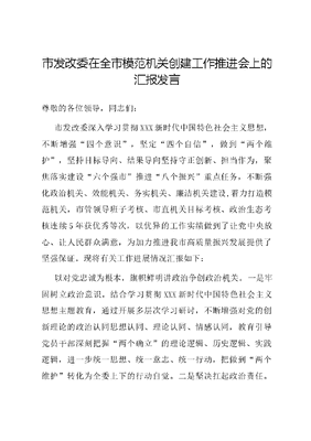 市发改委在全市模范机关创建工作推进会上的汇报发言尊敬的各位领导,同志们:市发改委深入学习贯彻XXX新时代中国特色社会主义思想,不断增强四个意识,坚定四个自信,做到两个维护,坚持目标导向、结果导向坚持守正创新、担当作为,聚焦落实建设六个强市推进八个振兴重点任务,不断强化政治机关、效能机关、务实机关、廉洁机关建设,着力打造模范机关,市管领导班子考核、市直机关目标考核、政治生态考核连续5年获优秀等次,以优异的工作实绩做到了让党中央放心、让人民群众满意,为加力推进我市高质量振兴发展提供了坚强保证。现将有关工作进展情况汇报如下:以对党忠诚为根本,旗帜鲜明讲政治争创政治机关。一是牢固树立政治意识。结合学习贯彻XXX新时代中国特色社会主义思想主题教育,通过开展多层次学习研讨,不断增强对党的创新理论的政治认同思想认同、理论认同、情感认同,教育引导党员干部深刻把握两个确立的理论逻辑、历史逻辑、实践逻辑,进一步统一思想、统一意志、统一行动,把做到两个维护转化为全委上下的行动自觉。二是坚决扛起政治责任。把贯彻落实XXXXXX重要讲话重要指示精神和党中央决策部署作为重要政治任务对维护国家五大安全重要任务再梳理,明确方向、加力攻坚,围绕十八大以来XXX到我市考察作出的一系列重要讲话重要指示精神,逐项分解任务、建立工作台账、强化政治监督,一项一项抓好落实。三是不断强化忠诚教育。把对党忠诚作为政治建设的根本把党性教育贯穿于日常,组织全体干部集体创作原创演唱歌曲《全市儿女永远跟着党》,展现了发改干部的精神面貌,提升了干部队伍的凝聚力和向心力以强化党建为引领,与时俱进提能力争创效能机关。始终坚持党建引领,围绕中心抓党建,抓好党建促发展,以高质量党建引领高质量发展为主题.推进作风革命、效能革命,确保上级各项决策部署不折不扣落实到位、见行见效,发展改革工作取得了新进展新突破。一是不断提升组织建设能力。开展党支部标准化规范化建设三年攻坚行动,以政治功能强、支部班子强、党员队伍强、发挥作用强为目标,聚焦组织设置、支委会建设、组织生活、功能作用发挥、队伍建设、制度保障六方面规范化建设持续发力,实现一年一个台阶,三年全面提升。二是不断提升对标对表能力。以思想大解放推动发展大提速,坚决破除自说自话,对标对表XXXXXX重要讲话重要指示精神和党的XX大决策部署,组织我为我市振兴发展献计献策活动,研究完善《关于更好服务国家战略大局赋能全面振兴取得新突破的有关建议》主动对接国家战略,国家十四五规划《纲要》分解的7项指标中3项提前完成,粮食综合生产能力等3项达到指标预期进度,单位GDP能源消耗降低指标好于全国平均水平,得到国家发改委认可。三是不断提升跨越赶超能力。彻底破除工作路径依赖,坚持无中生有、有中生新,实施市级重点项目1000个,比去年翻一番,年度计划完成投资3104亿元,同比增长61.9%,其中产业项目699个,占比70%,高于去年15个百分点,联东U谷、阜丰生物等经济发展新引擎和战略性新兴产业项目224个,比去年增加94个,同比增长72.3%。先后开展重点项目开春即开工夏季大会战,截至8月25日,市级重点项目已开复工893个,比去年增加428个,完成投资2025.8亿元,投资完成率65.3%,比去年增加692.2亿元。四是不断提升服务发展能力。坚持马上就办办就办好,对市委市政府部署马上就办,三天时间制定印发促进经济运行整体好转20条,春节无休起草高质量做好我市一季度经济社会发展工作文件对重点项目要素保障马上就办,畅通绿色通道减程序、减时间、减环节、减接触,会商会办、帮办快办,铁科、北漠高速等一批项目当日报当日批。克服重点项目纳人国家十四五规划难的心理,积极争取我市8条铁路纳入规划。今年以来,争取中央预算内投资174.3亿元,与去年全年争取额度仅差1.6亿元。以四个体系为保障,聚精会神抓落实争创务实机关。将四个体系作为党建工作与业务工作融合推进的有力抓手,增强抓落实的政治自觉,培养抓落实的政治担当,完善抓落实的保障机制。一是重点任务全部纳人。建立健全四个体系1+1+3制度架构,将年度重点任务全部纳入四个体系加力推进,逐项明确责任领导、推进措施、工作目标、完成时限及责任人,按照任务来源及类别建立7+N台账体系确保重点工作落实更加全面深人、不留死角。2023年以来,纳入四个体系台账任务1410项,已完成1242项。二是集中落实保障质量。注重专班推进,重点事项成立工作专班,集中时间、集中办公、集中攻关,确保重点工作高质高效推进。注重比较分析,将国内外综合环境、数据信息、同类地市进展情况等因素进行充分比较分析,发挥好参谋助手作用。注重查缺补漏,定期开展落实党中央、国务院及国家发改