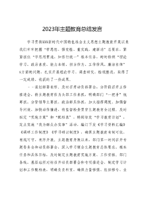 2023年主题教育总结发言学习贯彻XXX新时代中国特色社会主义思想主题教育开展以来我们牢牢把握学思想、强党性、重实践、建新功总要求,紧紧扭住学思用贯通、知信行统一根本任务,时时检视理论学习、政治素质、能力本领、担当作为、工作作风、廉洁自律6方面的问题,扎实开展理论学习、调查研究、检视整改,取得了一定成绩、收获的了一些成果。--谋划部署有序。及时召开动员部署会,分阶段召开工作推进会,将主题教育作为头部工作来抓,明确部门一把手统筹抓、分管领导主要抓、政治部具体抓,加大指挥调度、加强督导问效、加快动作推进,将监督检查贯穿主题教育全过程。及时拟定实施方案和配档表,特别印发学习教育计划,定点实施我为群众办实事活动,编订下发《学习资料汇编》《调研工作制度》《学习研讨制度》,确保主题教育有制可依、有规可守、有序开展。主题教育开展以来,部门第一时间召开专题委务会和动员部署会,深入学习领会主题教育总体要求、根本任务和具体目标,及时制定主题教育实施方案、工作安排。部门条线、基层站所对标召开动员部署会和专项推进会,制定学习计划和工作配档表,明确负责科室,确保力量够强、组织够专、业务够精。--理论学习有招。坚持以学习教育为先导,高位建立领导领学、专家讲学、现场教学、支部研学、个人自学工作机制高标打造案例导学、分题领学、交流研学、点评促学学习模式,高效落实一项目一台账一专题一清单一学习一研讨规定制度,把主题教育纳入部门工作规划,主动研究、扎实推进,总结成效、解决问题。坚持全面学和重点学相结合,把必读书目读透彻,把真理知识搞明白,把指导思想用到位,真正实现干什么学什么、缺什么补什么。坚持弘扬理论联系实际学风,在学中干、干中学,把自己摆进去、把职责摆进去、把工作摆进去,在深化、内化、转化上下真功求实效。目前安排集体学习X余次,现场教学X次,临堂测试X次,开展一把手上讲台活动X次。--调查研究有效。深入学习XXXXXX关于调查研究的重要论述,对调查研究的历史意义、本质要求、目标原则、方式方法等有了更加精准的把握。始终坚持问题指向,迈开步子多跑腿张开嗓子多动嘴,开动脑筋多费心,将上级政策有模有样、有声有色、有滋有味地传递给基层干部群众,争做为党立言为民请命的调研者,讲好了党言党语、人言人语、土言土语,确保上层意图传达无损耗、顶层架构传递无变形、调研信息传播无差池,落实政策宣讲X次,开展系统宣教X余次。始终坚持求学方向,聚焦群众意愿和社会要求公约数,把地方实况摸清楚、掌握住、分析透,直插乡村一线调研X余次,开展银企车间调研X余次奔赴先进地区点位调研X次。始终坚持整体走向,在了解地方全局工作的基础上,选准有代表性的典型案例,在银企发展、教育医疗、复工续建、升规纳统、乡村振兴、社会治理、营商环境建设干部作风建设等领域进行专项调研,摸清了区情、掌握了民情、了解了实情、洞悉了内情,撰写专题调研报告X篇,制定配套推进措施X余条,落实在建项目7个。始终坚持成果导向,通过深入学习XXX关于中国特色社会主义的重要论述和视察讲话精神,对党的路线如何宣、民生政策如何传、信访接待如何做、现场办公如何干等重要理论和实践问题有了更加深刻的体悟,精准提高了调研成果质量,解决在册梗阻问题X个,疏通民诉堰塞X余条,开工民生实事工程X项,切实把调研成果转化为解决问题、改进工作的实际举措。--检视整改有力。把牢检视整改这个关键,坚持边学习、边对照、边检视、边整改,把问题整改贯穿始终,把问题清单转化为成效清单,让人民群众切实感受到解决问题的实际成效。加强党性分析,对过往作风建设阶段发现的问题进行回头看,对苗头性、倾向性问题进行提醒和纠治,目前共查摆6方面问题X余条,撰写个人事项报告X余篇,观看警示教育专题片X次,切实守牢纪法红线。自觉对标先进,把自己摆进去、把职责摆进去、把工作摆进去,认真从政治、思想、能力、作风、纪律等方面开展党性分析、从根子上找原因和差距,打扫思想上的政治灰尘,陆续召开了N场次的检视剖析会、专题民主生活会,严肃认真开展批评和自我批评,做到见人见事见思想、落细落小落具体,真正达到红脸出汗、排毒治病、解决问题、促进工作的效果。抓实整改整治,对查摆出的N项问题,立查立改、即知即改、集中整改,坚决防止久拖不决、整而不改,确保拿出实实在在的整改成绩单。为学之实,固在践履。我们将以本次主题教育为契机,继续抓好理论学习,接续抓实调查研究,持续抓牢成果转化,努力在以学铸魂、以学增智、以学正风、以学促干上取得更加扎实的成效。一、保持学习定力,锚定目标干。坚持读原著学原文悟原理,在真学、真信、真用上下功夫,以持之以恒的精神、一丝不苟的态度、一以贯之的标准,扎扎实实落实好学习教育计划。坚持集体学习与个人自学结合,认真研