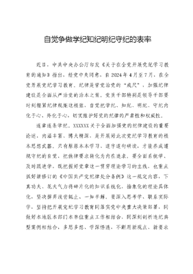 自觉争做学纪知纪明纪守纪的表率近日,中共中央办公厅印发《关于在全党开展党纪学习教育的通知》指出,经党中央同意,自2024年4月至7月,在全党开展党纪学习教育。纪律是管党治党的戒尺,加强纪律建设是全面从严治党的治本之策。党员干部特别是领导干部要时刻绷紧纪律规矩这根弦,自觉把学纪、知纪、明纪、守纪内化于心、外化于心,切实维护好党的纪律的严肃性和权威性。逐章逐条学纪。XXXXXX关于全面加强党的纪律建设的重要论述,内涵丰富、博大精深,是开展好此次党纪学习教育的根本思想武器。只有原原本本学习、逐字逐句研读,才能养成遵规守纪的自觉,把他律要求转化为内在追求。要全面系统学、及时跟进学,既把握好党章这一贯穿理论学习的主线,也重点抓好新修订的《中国共产党纪律处分条例》这一规定内容,下真功夫、花大气力将碎片化的知识系统化,抽象化的理论具体化,坚决摒弃浅尝辄止、一知半解。要深入思考学、联系实际学,坚持把开展党纪学习教育同落实党中央重大决策部署,同做好本地区本部门本单位重点工作相结合,同深刻剖析违纪典型案例相结合,多思多想、学深悟透,不断用新观点、新要求研究新情况、解决新问题,筑牢遵规守纪、清正廉洁的精神堤坝。融会贯通知纪。党员破法,无不始于破纪。从近年来反面教材来看,还是有个别党员干部知纪违纪、有令不从,甚至有的对党规党纪一问三不知,直到问题发生才如梦初醒。严守纪律规矩底线,就是要搞清楚党的纪律规矩是什么,弄明白能干什么、不能干什么,始终做到忠诚干净担当。要以学习贯彻新修订的纪律处分条例为契机,深入领会其重点内容和着力方向,准确掌握主旨要义和规定要求,不断增强自我净化、自我完善、自我革新、自我提高能力。要紧扣党的政治纪律、组织纪律、廉洁纪律、群众纪律、工作纪律、生活纪律六方面,主动把自己摆进去、把职责摆进去、把工作摆进去,精准梳理自身职责、明确岗位责任,开列负面清单,做到时时刻刻对照、处处事事警醒,真正实现内心净化、思想除尘、灵魂洗涤。坚定自觉明纪。守纪律、讲规矩是对党员干部党性的重要考验,是对党忠诚度的重要检验,更是做政治上的明白人的重要保证。所以说,对于党规党纪,必须十分明确地强调、十分坚定地执行,绝不能语焉不详、闪烁其词。要旗帜鲜明把政治建设摆在首位,主动将加强修养、锤炼党性、严守纪律融入日文可居文库——海量学习资料,手机电脑均可下载www.wenkeju.com常、化为习惯,持续增强政治定力、纪律定力、道德定力、抵腐定力,更加深刻领悟两个确立的决定性意义,更加坚决做到两个维护。要坚持不懈把纪律和规矩挺在前面,常修为政之德、常思贪欲之害、常怀律己之心,既主动用党规党纪这把戒尺校正思想和行动,也心存敬畏敢于接受群众的批评纠正,襟怀坦白、言行一致,以严明的纪律自觉确保同以XXX同志为核心的党中央保持高度一致,统一思想、统一行动。知行合一守纪。学纪、知纪、明纪、守纪,落脚点就在于守纪。倘若不能付诸行动、推动工作,那无疑是镜花水月、空中楼阁。要做到慎独慎初慎微,坚持从小事小节上加强自身修养,从一点一滴中自觉完善自己,分清公私、正待义利,始终保持共产党人的政治本色。要带头廉洁修身、廉洁齐家,在管好自己的同时,从严管好配偶、子女和身边工作人员,发现问题及时提醒、坚决纠正,以良好家风带动党风、政风、民风。要树立和践行正确权力观,把做官当做事、把用权当履责,千方百计为群众办实事、解难事、做好事,真正做到公正用权、依法用权、为民用权、廉洁用权,当好良好政治生态和社会风气的引领者、营造者、维护者,以实际行动确保党纪学习教育扎实开展、取得成效。文可居文库——海量学习资料,手机电脑均可下载www.wenkeju.com
