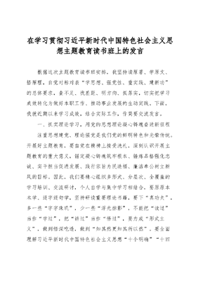 在学习贯彻习近平新时代中国特色社会主义思想主题教育读书班上的发言根据这次主题教育读书班安排,我坚持读原著、学原文、悟原理,自觉对标对表学思想、强党性、重实践、建新功的总体要求,查不足、找差距、明方向、抓落实,切实把学习成效转化为做好本职工作、推动事业发展的生动实践。下面,我就近期以来学习成效,结合实际工作,作简要交流发言。一、抓实理论学习,用党的思想理论凝心铸魂奋进新征程注重思想建党、理论强党是我们党的鲜明特色和光荣传统。开展好主题教育,要自觉在精神上接受洗礼,深刻认识开展主题教育的重大意义,锚定凝心铸魂筑牢根本、锤炼品格强化忠诚、实干担当促进发展、践行宗旨为民造福、廉洁奉公树立新风的目标。因此,我们要精心组织多形式、分层次、全覆盖的学习培训、交流研讨,个人自学与集中学习相结合,要原原本本学、逐字逐句学,坚持研读重要理论书籍,要下真功夫,多一些字字珠玑,少一些浮光掠影,不能把读过当作学过,把讲过当作悟过,要力戒形式主义,做到悟深吃透,做到知其然更知其所以然。要全面理解习近平新时代中国特色社会主义思想十个明确十四个坚持十三个方面成就的主要内容,不断把学习贯彻习近平新时代中国特色社会主义思想引向深入,从而更加自觉深刻领悟两个确立的决定性意义,增强四个意识、坚定四个自信、做到两个维护,在思想上政治上行动上同党中央保持高度一致。要聚焦面临的形势任务、风险挑战和自身存在的短板不足,坚持多思多想、深学细悟,不断提高运用党的创新理论分析问题、解决问题的能力,善于结合具体工作实际从党的创新理论中找方向、找思路、找举措、找办法,以实招、硬招、新招推动高质量发展行稳致远。主题教育的根本,在于实现履职上的创新突破。要紧紧围绕新时代新征程党的中心任务,扑下身子真抓实干、聚焦问题攻坚克难,以统一的思想、坚定的意志、协调的行动、强大的战斗力推动高质量发展取得新成效,为党和人民履好职、尽好责,让中国式现代化道路越走越宽广。二、抓好实践为民,以主题教育为契机推动事业高质量发展我们要在推动高质量发展上下功夫,坚持两手抓、两促进,把开展主题教育同贯彻落实党中央各项决策部署结合起来,同推进本地区本部门本单位的重点工作结合起来,奋力完成全年经济社会发展目标任务,以推动高质量发展的新成效检验主题教育成果。我们要以开展主题教育为契机,增强对于中国特色社会主义道路自信心和维护国家安全稳定意识。通过学习历史经验与考察当下局势来增强对于中国特色道路可行性以及未来走向信心。要以主题教育来增强敢于奋进、勇于担当的精神,为奋进新征程凝心聚力。进一步深刻认识我是谁,我从哪里来,我要到哪里去的问题,认识自己的职责使命,从而在接下来的工作中充满激情与动力。我要通过主题教育,帮助我们深刻领悟中国特色社会主义伟大事业并凝聚共识,不断加强我们对社会制度、经济发展等方面的理解与认知。我们要在主题教育中做起而行之的行动者、不做坐而论道的清谈客,就要以解决实际问题的成效作为衡量标准,要敢于真刀真枪、动真碰硬,实实在在、真真切切,不能装样子、打太极。要保持只争朝夕、奋发有为的奋斗姿态和越是艰险越向前的斗争精神,积极主动作为,敢于直面问题,想方设法把问题解决在职责范围之内,坚决摒弃一切明哲保身、得过且过、敷衍塞责、懒政怠政等消极行为,切实提升执行力和落实力,真正做起而行之的行动者、不做坐而论道的清谈客,当攻坚克难的奋斗者、不当怕见风雨的泥菩萨,努力创造经得起实践、人民、历史检验的实绩。三、抓细建章立制,把主题教育转变为管长远的经常举措我们要在建章立制上下功夫,坚持当下改与长久立相结合,紧紧围绕学习贯彻党的创新理论、解决突出问题建章立制,形成一批管根本、管长远的长效机制。习近平总书记强调主题教育不仅仅是个开始,而是要贯穿始终。因此,我们党员领导干部要始终当做习近平新时代中国特色社会主义思想的践行者和领跑者,勇立时代潮头,直面发展难题,在求真务实中开拓创新、在大胆探索中实现突破,树立以改革破解发展难题、以创新激发动力活力的新意识、新思维、新导向,以勃勃迸发的生命力和创造力为开创中国式现代化的新局面不懈奋斗。要把习近平新时代中国特色社会主义思想转化为坚定理想、锤炼党性、指导实践、推动工作的强大力量,始终保持统一的思想、坚定的意志、协调的行动、强大的战斗力。坚持目标引领和问题导向相结合,以具体目标为牵引,以解决问题为抓手,有的放矢、精准发力,推动各项任务落实落地。将此次主题教育活动作为锤炼本领的锻剑台,学会用好党的理论思想武器,不断在基层中大兴调研之风,不断汲取群众智慧,做到学思践悟、知行合一,并将理论知识与实际工作相结合,将学习成果转化为工作实践,真正体会到主题教育的启示和帮助,