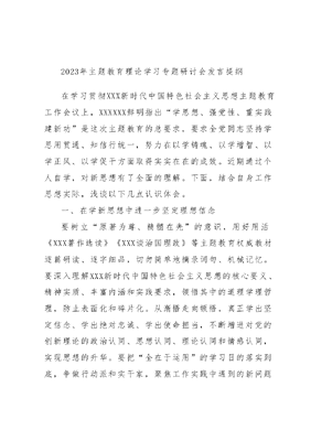 2023年主题教育理论学习专题研讨会发言提纲在学习贯彻XXX新时代中国特色社会主义思想主题教育工作会议上,XXXXXX鲜明指出学思想、强党性、重实践建新功是这次主题教育的总要求,要求全党同志坚持学思用贯通、知信行统一,努力在以学铸魂、以学增智、以学正风、以学促干方面取得实实在在的成效。近期通过个人自学,对新思想有了全面的理解。下面,结合自身工作思想实际,浅谈以下几点认识体会。一、在学新思想中进一步坚定理想信念要树立原著为尊、精髓在先的意识,用好用活《XXX著作选读》《XXX谈治国理政》等主题教育权威教材逐篇研读、逐字细品,切勿简单地摘录词句、机械记忆。要深入理解XXX新时代中国特色社会主义思想的核心要义、精神实质、丰富内涵和实践要求,领悟其中的道理学理哲理,防止表面化和碎片化。从渐悟走向顿悟,真正学出坚定信念、学出绝对忠诚、学出使命担当,不断增进对党的创新理论的政治认同、思想认同、理论认同和情感认同,实现思想的升华。要把全在于运用的学习目的落实到底,争做行动派和实干家,聚焦工作实践中遇到的新问题改革发展稳定存在的深层次问题、国际变局中出现的重大问题、党的建设面临的突出问题等,自觉从党的创新理论中寻找思路、答案和方法,将理论学习过程转变为寻求问题最优解的过程。二、在学新思想中进一步担当使命责任XXXXXX强调,党的干部必须坚持原则、认真负责,面对大是大非敢于亮剑,面对矛盾敢于迎难而上,面对危机敢于挺身而出,面对失误敢于承担责任,面对歪风邪气敢于坚决斗争。干部就要有担当,有多大担当才能干多大事业,尽多大责任才会有多大成就。勇于担当是衡量一个好干部的重要标准、基本原则。勇于担当就要在工作中有承担责任的勇气,要不怕担风险,要不怕犯错误,要不怕得罪人,要尽职履责。如果党员干部在工作中缺乏勇气,缺乏同困难相斗争的精神,怕承担责任,工作敷衍了事,这不仅仅是对自己的不负责任,更是对党和人民信任的践踏作为党员干部,要主动投身到各种斗争中去,在大是大非面前敢于亮剑,在矛盾冲突面前敢于迎难而上,在危机困难面前敢于挺身而出,在歪风邪气面前敢于坚决斗争,真正锻造成为烈火真金。三、在学新思想中进一步强化初心宗旨人民立场是我们党的根本政治立场,全心全意为人民服务是我们党的根本宗旨。站稳群众立场意味着坚持一切为了群众,一切依靠群众,从群众中来,到群众中去。在思考问题、做出决策和开展工作时,我们必须始终从群众利益出发,坚持问政于民、问需于民、问计于民。作为党员干部,要始终牢记全心全意为人民服务的根本宗旨,将人民群众的安危冷暖放在心中,深入基层一线,倾听民声了解民意,设身处地站在群众角度思考问题、解决问题。要用真心换取民心,以真情换取信任,始终牢记人民对美好生活的向往就是我们的奋斗目标,坚持为群众谋幸福。要将人民群众的答应、满意和高兴作为一切工作的最高标准,始终保持为人民群众谋幸福的路线不动摇、不走偏,不断实现人民对美好生活的向往。要始终树立以人民为中心的发展思想,结合市委正在开展的大调研活动,大力弘扬调查研究之风,真诚倾听群众呼声、真实反映群众愿望真情关心群众疾苦,解决好与老百姓生活息息相关的民生问题。四、在学新思想中进一步推进自我革命XXXXXX指出:在全党开展集中性学习教育,是我们党推进自我革命的重要途径,也是一条重要经验。党的十八大以来,党中央持续开展的几次主题教育,都可以看作是自我革命的实践形式,都在不断丰富着我们党自我革命的思想成果,并逐步形成了我们党推进自我革命的重要经验,充分彰显了以XXX同志为核心的党中央管党治党的自我革命政治本色。作为党员干部,我们必须进一步加强对党的自我革命理论的深刻认识,从理论价值、实践路径、能力要求等维度领悟党的自我革命理论的深邃思想,坚持以党的自我革命推进党的建设,不断提升自身的思想自觉政治自觉和行动自觉。