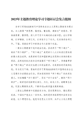 2023年主题教育理论学习专题研讨会发言提纲自学习贯彻XXX新时代中国特色社会主义思想主题教育开展以来,本人按照学思想、强党性、重实践、建新功的要求,坚持读原著、悟原理,深入学习党中央确定的必读书目,在以学铸魂、以学增智、以学正风、以学促干上下功夫,扎实推进各项工作。下面,我就在学习中的体会与大家做个交流。一要在主题教育中筑牢政治忠诚,坚决捍卫两个确立、做到两个维护。两个确立是党的十八大以来我们党取得的重大政治成果,也是新时代党和国家事业实现伟大变革的根本原因。虽然党的XX大报告没有直接写两个确立,但通篇贯穿着两个确立的决定性意义和政治要求,这是报告的灵魂和红线。作为党员干部,要始终把学习贯彻XXX新时代中国特色社会主义思想作为首要政治任务,更加深刻领悟两个确立的决定性意义,切实增强四个意识、坚定四个自信、做到两个维护,做好党的创新理论深化、内化、转化工作,着眼常态长效,巩固主题教育成果,不断开创xx高质量发展新局面。二要在主题教育中把握前进方向,坚定理想信念、强化理论武装。中国共产党成立一百年来,始终是有崇高理想和坚定信念的党。这个理想信念,就是马克思主义信仰、共产主义远大理想中国特色社会主义共同理想。理想信念是中国共产党人的精神支柱和政治灵魂,也是保持党的团结统一的思想基础。理想信念就是共产党人精神上的钙,没有理想信念,理想信念不坚定,精神上就会缺钙,就会得软骨病。作为党员干部,要坚持学而信、学而思、学而行,坚定对马克思主义的信仰、对中国特色社会主义的信念、对实现中华民族伟大复兴中国梦的信心,增强对党的价值追求和前进方向的高度政治认同,把学习成果转化为不可撼动的理想信念,转化为正确的世界观、人生观、价值观,用理想之光照亮奋斗之路,用信仰之力开创美好未来。三要在主题教育中担当时代使命,推进高质量发展、加快现代化建设。xxx之所以发展得快、发展得好,核心经验就是坚持以xxx为引领,贯彻新发展理念、推动高质量发展。我们要知其然更要知其所以然,学到精髓、学以致用,切实把学习成果转化为对接比拼的实际行动。我们要创新理念,勇于突破,站在未来的高度看待现在。我们要以具有前瞻性的思维来布局谋篇,从眼界、思路、格局上全面学习,善于识别、顺应和借助形势。我们要更新思维方式,打破路径依赖,抓住机遇,实现跨越发展我们要以为全国当样板、在世界争一流为标准,永不满足,永不懈怠。我们要始终集中精力在想干事上,展现出敢干事的胆识和会干事的实力。我们要时刻思考目标,提高专业化能力,成为行家里手,以创造性的工作将不可能变为可能。我们要一心为民,推崇实干、务实担当,执行力极强。最后,我们要一以贯之抓到底,直到成功,一步一个脚印实现既定目标。四要在主题教育中永葆先进纯洁,推进从严管党治党、全面加强党的建设。XXXXXX强调:要时刻保持解决大党独有难题的清醒和坚定,勇于自我革命,一刻不停全面从严治党,坚定不移反对腐败,始终保持党的团结统一,确保党永远不变质、不变色、不变味,为强国建设、民族复兴提供坚强保证。自我革命是先进马克思主义政党的鲜明特质。自党的十八大以来,以XXX同志为核心的党中央坚持不懈地推进党风廉政建设和反腐败斗争,以得罪千百人,不负十四亿的使命担当,成功走出了一条依靠制度优势和法治优势反腐败的道路。作为党员干部,要深入贯彻新时代党的建设总要求,以党的政治建设为统领,推动党的各方面建设全面过硬永葆赶考的清醒和坚定;增强纪律意识、规矩意识,持续纠正形式主义、官僚主义,把纠治这些问题摆在更加突出的位置,做到公正用权、依法用权、为民用权、廉洁用权,推动形成清清爽爽的同志关系、规规矩矩的上下级关系、亲清统一的新型政商关系,当好良好政治生态和社会风气的引领者、营造者、维护者坚决整治群众身边的腐败和作风问题,一体推进不敢腐、不能腐不想腐,以伟大的自我革命引领伟大的社会革命。