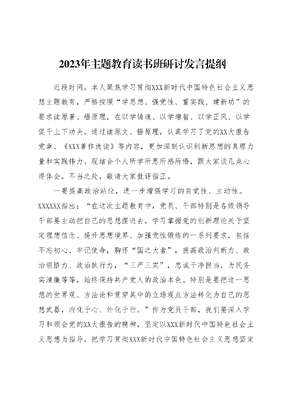 2023年主题教育读书班研讨发言提纲近段时间,本人聚焦学习贯彻XXX新时代中国特色社会主义思想主题教育,严格按照学思想、强党性、重实践、建新功的要求读原著、悟原理,在以学铸魂、以学增智、以学正风、以学促干上下功夫,通过读原文、悟原理,认真学习了党的XX大报告党章、《XXX著作选读》等内容,更加深刻认识到新思想的真理力量和实践伟力。现结合个人所学所思所感所悟,跟大家谈几点心得体会。不当之处,敬请大家批评指正。一要提高政治站位,进一步增强学习的自觉性、主动性。XXXXXX指出:在这次主题教育中,党员、干部特别是各级领导干部要主动把自己的思想摆进去,学习掌握党的创新理论关于坚定理想信念、提升思想境界、加强党性锻炼的一系列要求,包括不忘初心、牢记使命,胸怀国之大者,提高政治判断力、政治领悟力、政治执行力,三严三实,忠诚干净担当,为民务实清廉等等,始终保持共产党人的政治本色。特别是要把这一思想的世界观、方法论和贯穿其中的立场观点方法转化为自己的思想武器,内化于心、外化于行。作为党员干部,我们要深入学习和领会党的XX大报告的精神,坚定以XXX新时代中国特色社会主义思想为指导,把学习贯彻XXX新时代中国特色社会主义思想坚定不移地体现在思想上、政治上和行动上,并同以XXX同志为核心的党中央保持高度一致。要努力提高自身的专业素养,在本职岗位上兢兢业业、努力钻研、任劳任怨,持续发挥先锋模范作用,做表率。要将学思想、学党性、重实践、建新功的理念贯彻到xx工作中,结合自身的实际情况,严格落实各项任务。二要做到知行合一,以党的创新理论破解发展难题。XXXXXX指出:从现在起,中国xx党的中心任务就是团结带领全国各族人民全面建成社会主义现代化强国、实现第二个百年奋斗目标,以中国式现代化全面推进中华民族伟大复兴。这是一项前所未有的创新事业,其前进的道路必然布满各种挑战与困难。在新的历史时期,我们将面临许多新问题,同时也会遇到许多老问题的新表现。这些问题可能源于经济社会发展的不同阶段也可能源于复杂的国际形势。无论是哪一种问题,我们都不能回避,也不能简单化。只有深入了解这些问题背后的深层次原因,才能找到有效的解决方案。在这个过程中,我们要聆听时代的呼声,把握时代的脉搏,积极回应人民的期待。我们要始终坚持问题导向,深入实践研究,不断提出解决问题的新理念、新思路和新方法。只有这样,我们才能不断开辟中国特色社会主义事业的新天地。XXX新时代中国特色社会主义思想为我们提供了解决问题的基本立场、方向和方法。我们要认真学习贯彻这一思想,不断增强问题意识,提高解决实际问题的能力。我们要勇于面对各种重大考验,以坚定的决心和行动推动中国特色社会主义事业的持续发展。我们要积极响应时代的呼唤,以实际行动为推动中国特色社会主义的进步贡献力量。我们要紧密团结在以XXX同志为核心的党中央周围,不断谱写新时代中国特色社会主义更加绚丽的华章。三要汲取精神动力,以更强举措推动党的建设高质量。党的十八大以来,XXXXXX更是将全面从严治党纳入四个全面战略布局,以得罪千百人、不负十四亿的使命担当祛疴治乱,取得了反腐败斗争压倒性胜利,换来了海晏河清、朗朗乾坤的大好局面。近年来,我们不断强化落实管党治党的政治责任,努力巩固和拓展清风正气的政治生态,以高质量的党建切实引领和保障高质量的发展。特别是我们积极传承和弘扬四下基层行动至上等优秀工作作风,深化xxx干部考评机制,推行了包括年轻干部规划培养、实践培训、挂职锻炼、交流任职等内容的制度,引导广大干部在重点工作、重大项目、乡村振兴等一线场所磨炼意志、增长才干。以务实进取的精神状态,在各个领域不断创造新的xx速度。全面从严治党是所有工作的基石,片刻不能松懈。在新的赶考之路上,我们要大力弘扬伟大的建党精神,坚持将党的领导贯穿到各项工作的始终。以全面从严治党永远在路上打铁必须自身硬的政治自觉,坚持全面从严、一严到底。我通过提高不敢腐的震慑效能、增强不能腐的制度约束、发挥不想腐的思想教育优势,让行正道、扬正气、守正规在xxx蔚然成风,为全方位推进高质量发展提供坚强保障。